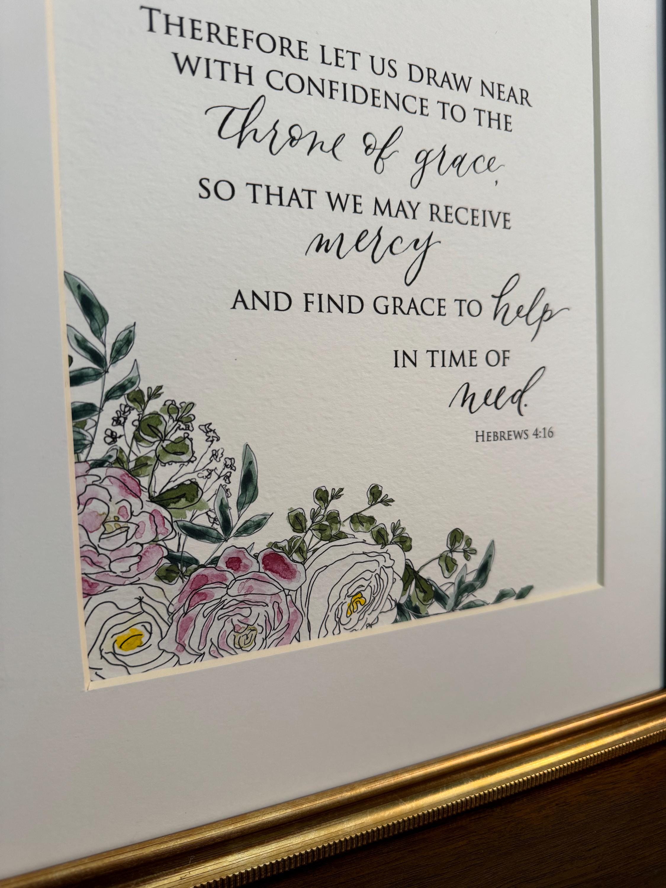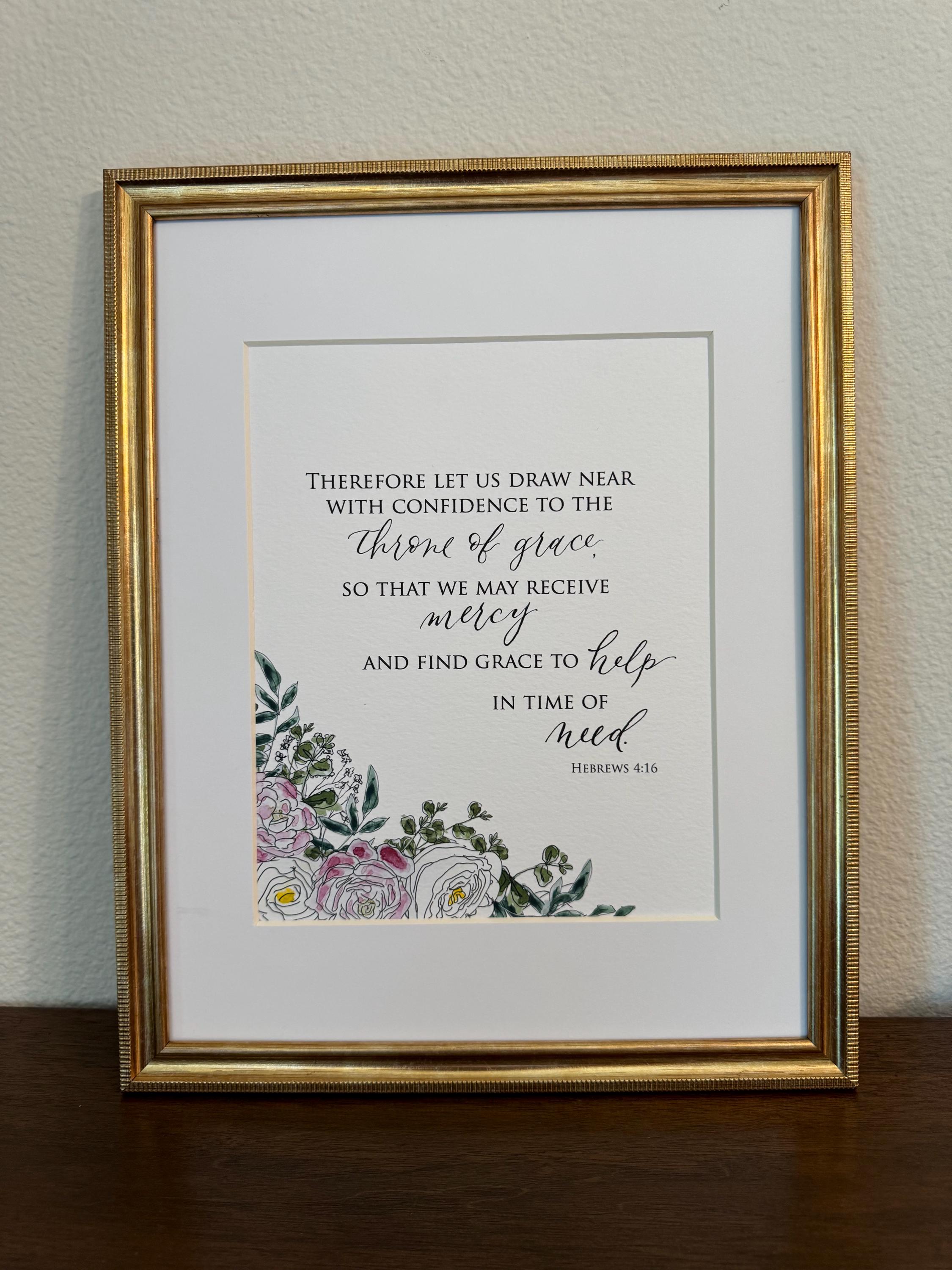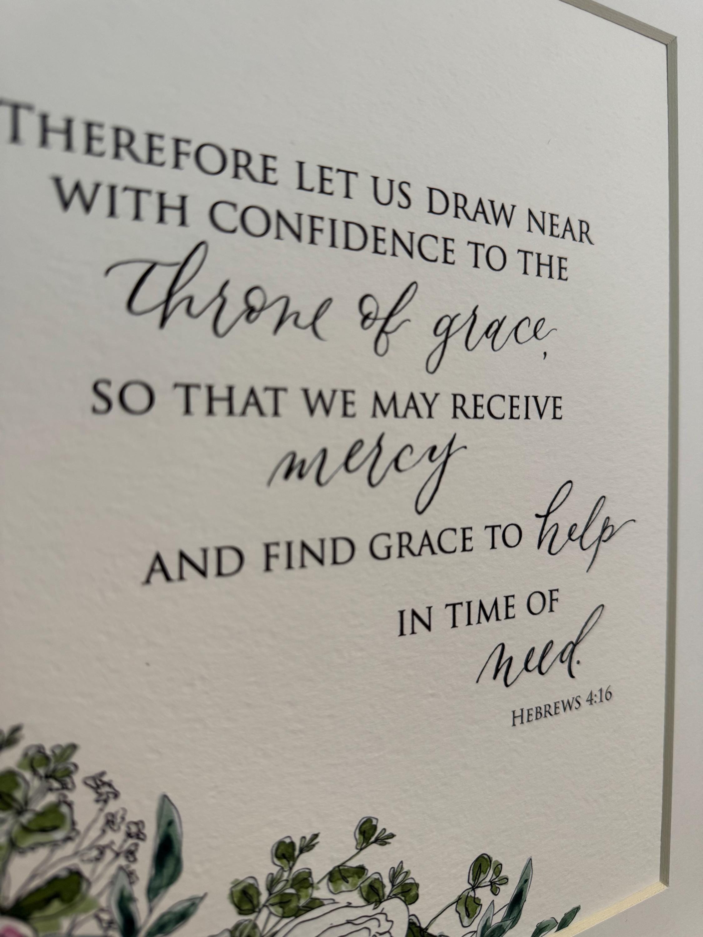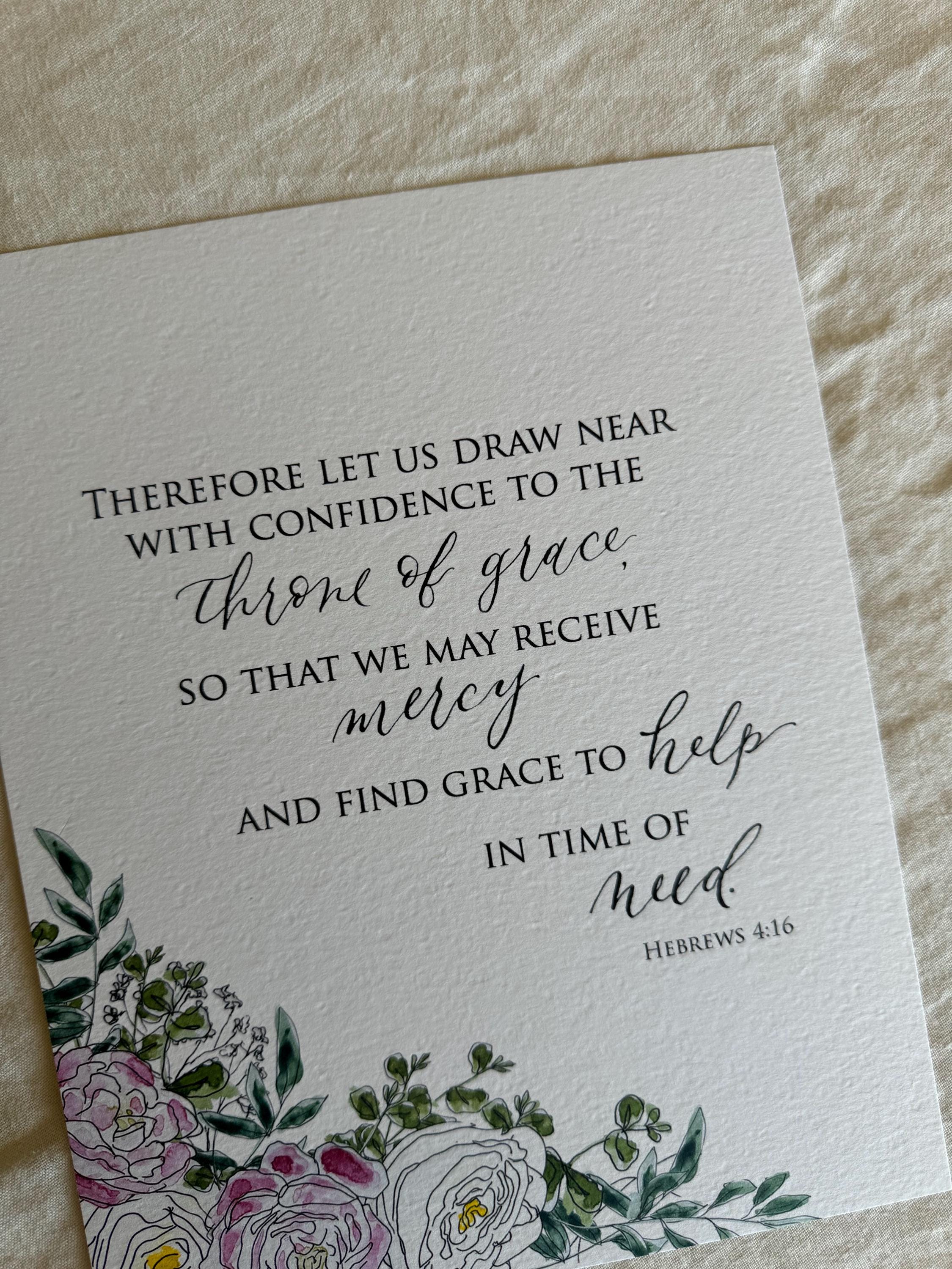 Hebrews 4:16 Scripture Print • Calligraphy, Floral Watercolor, Italian Paper