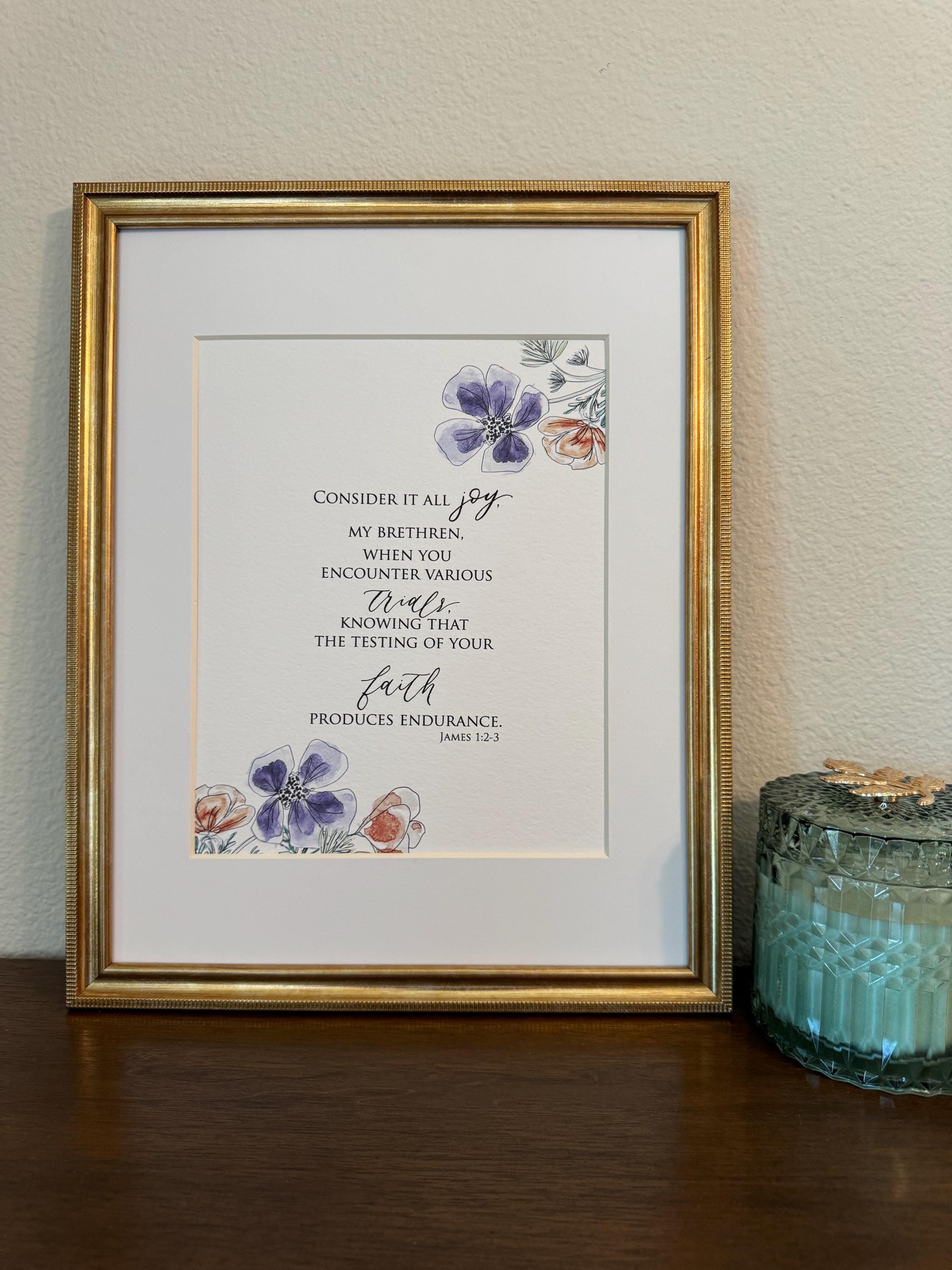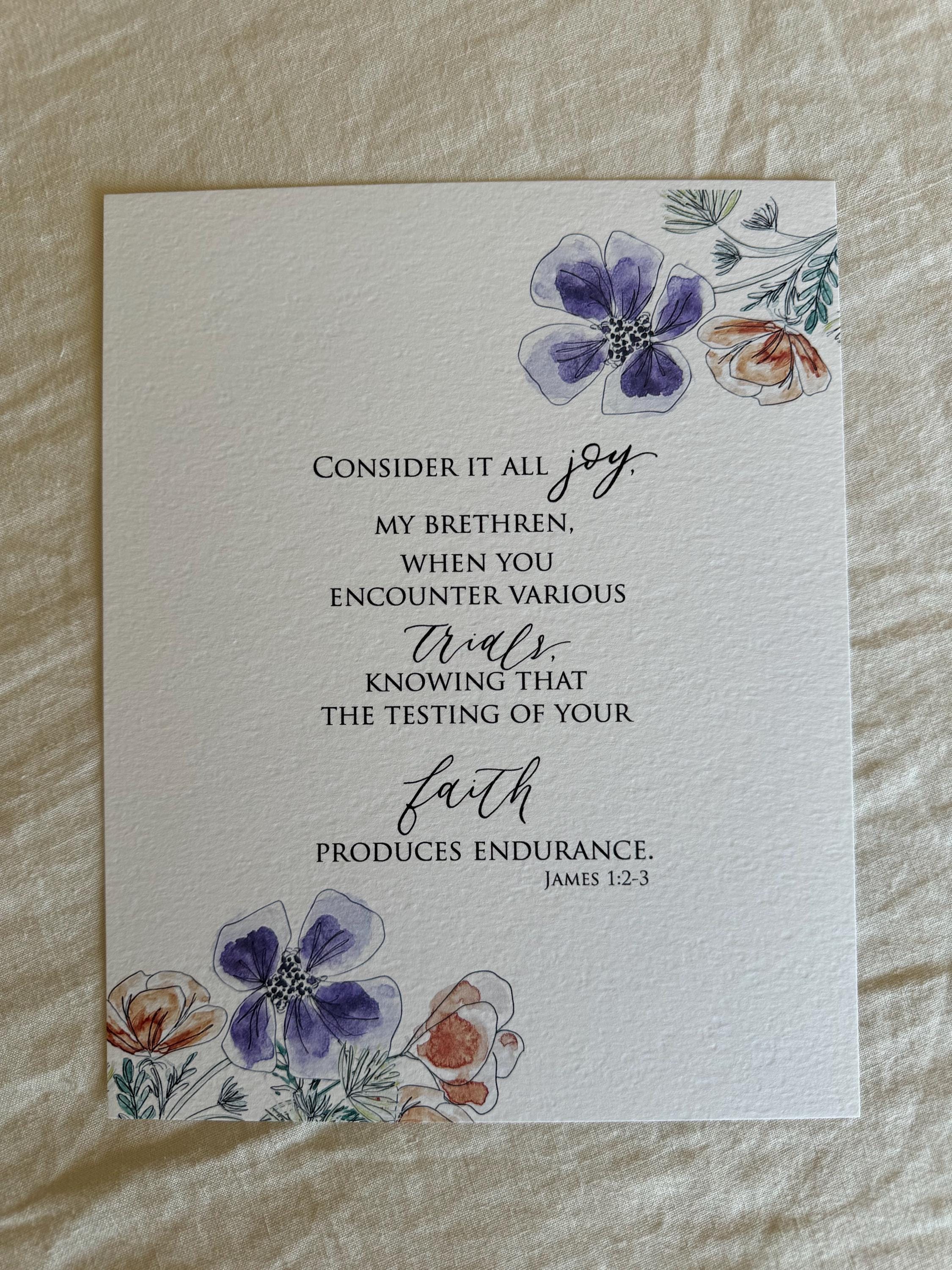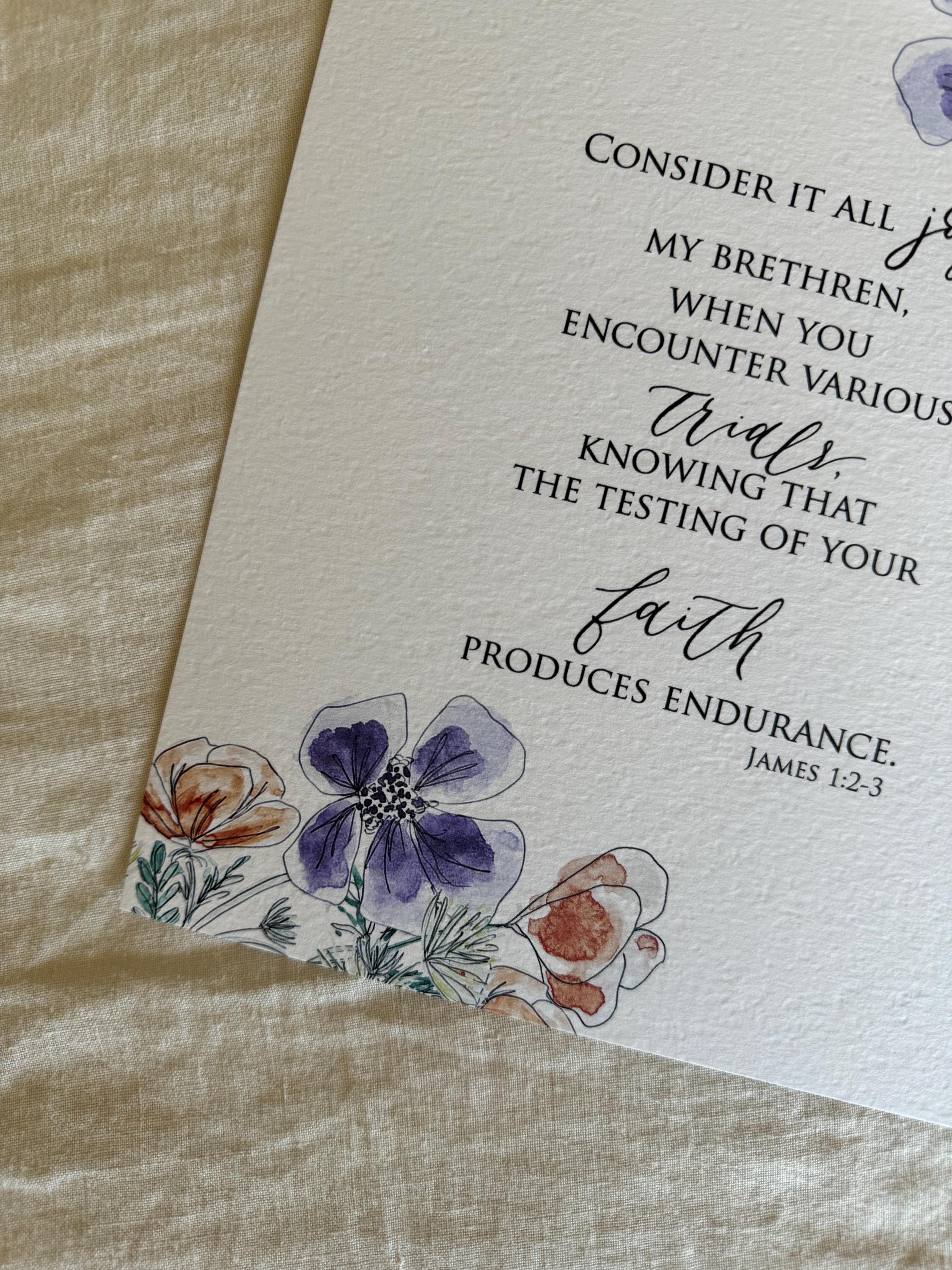 James 1:2-3 Scripture Print • Calligraphy, Watercolor Floral, Italian Paper