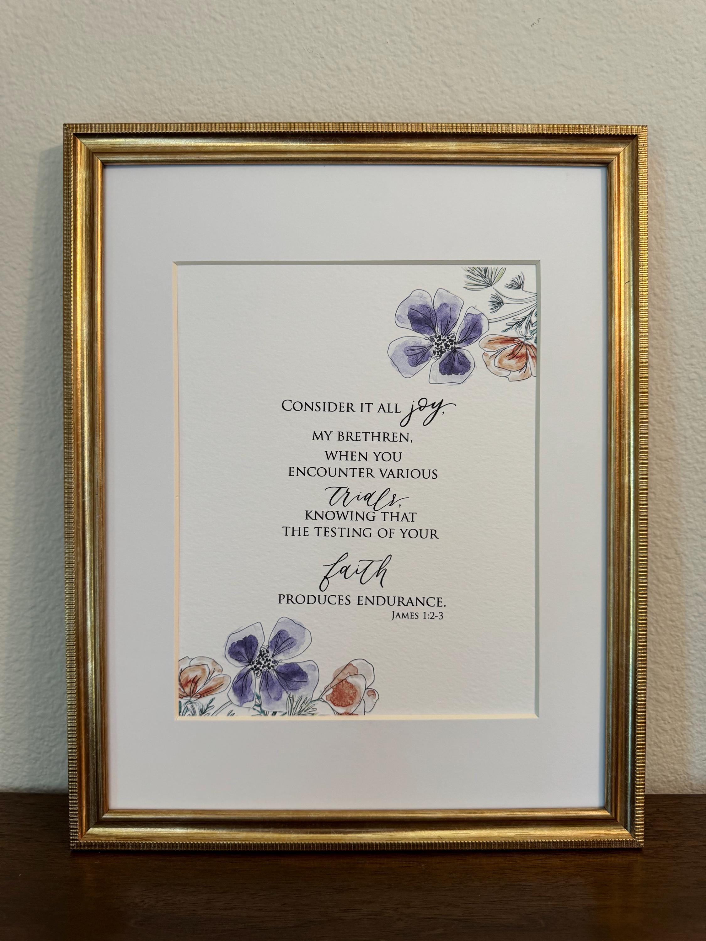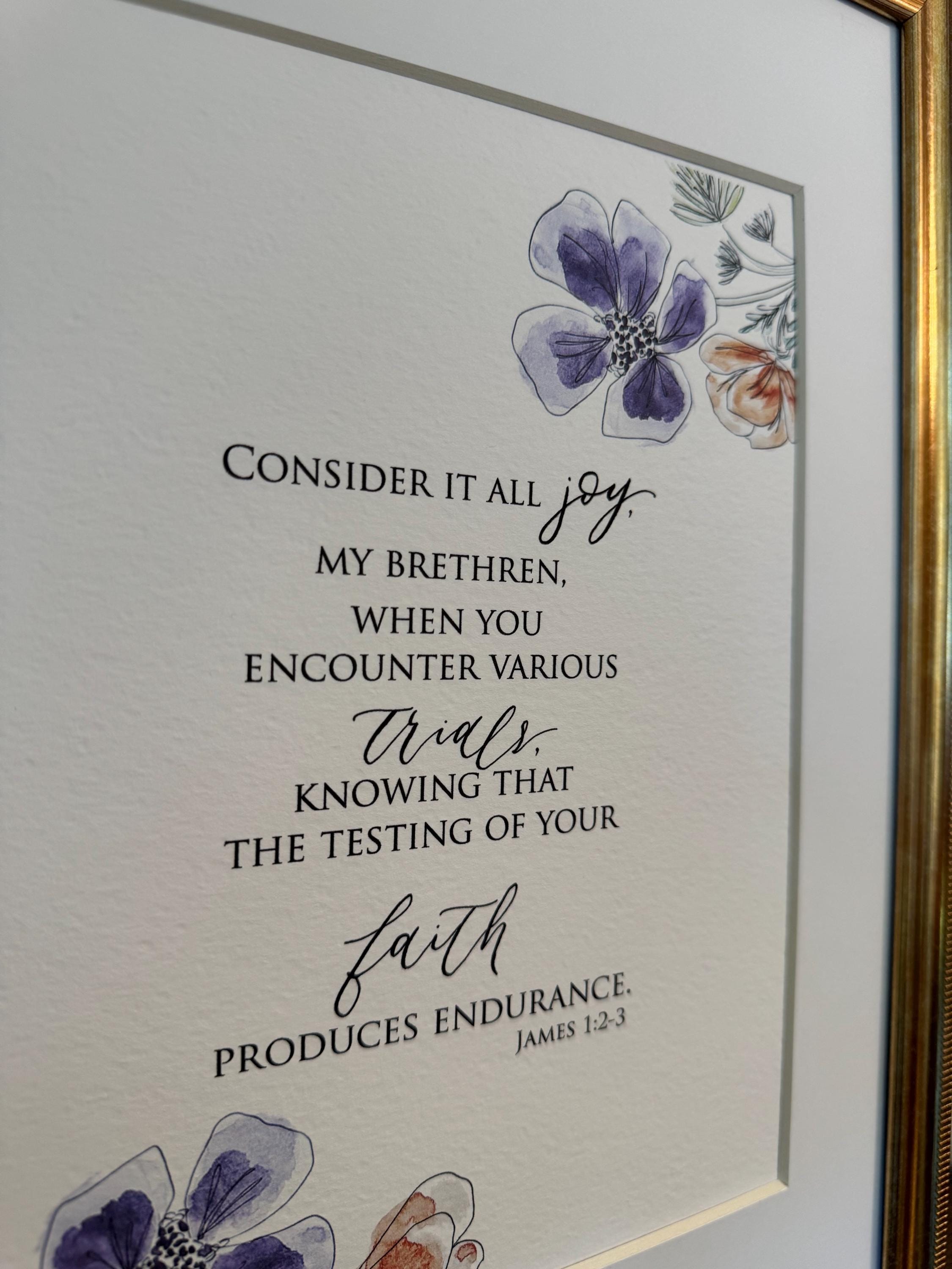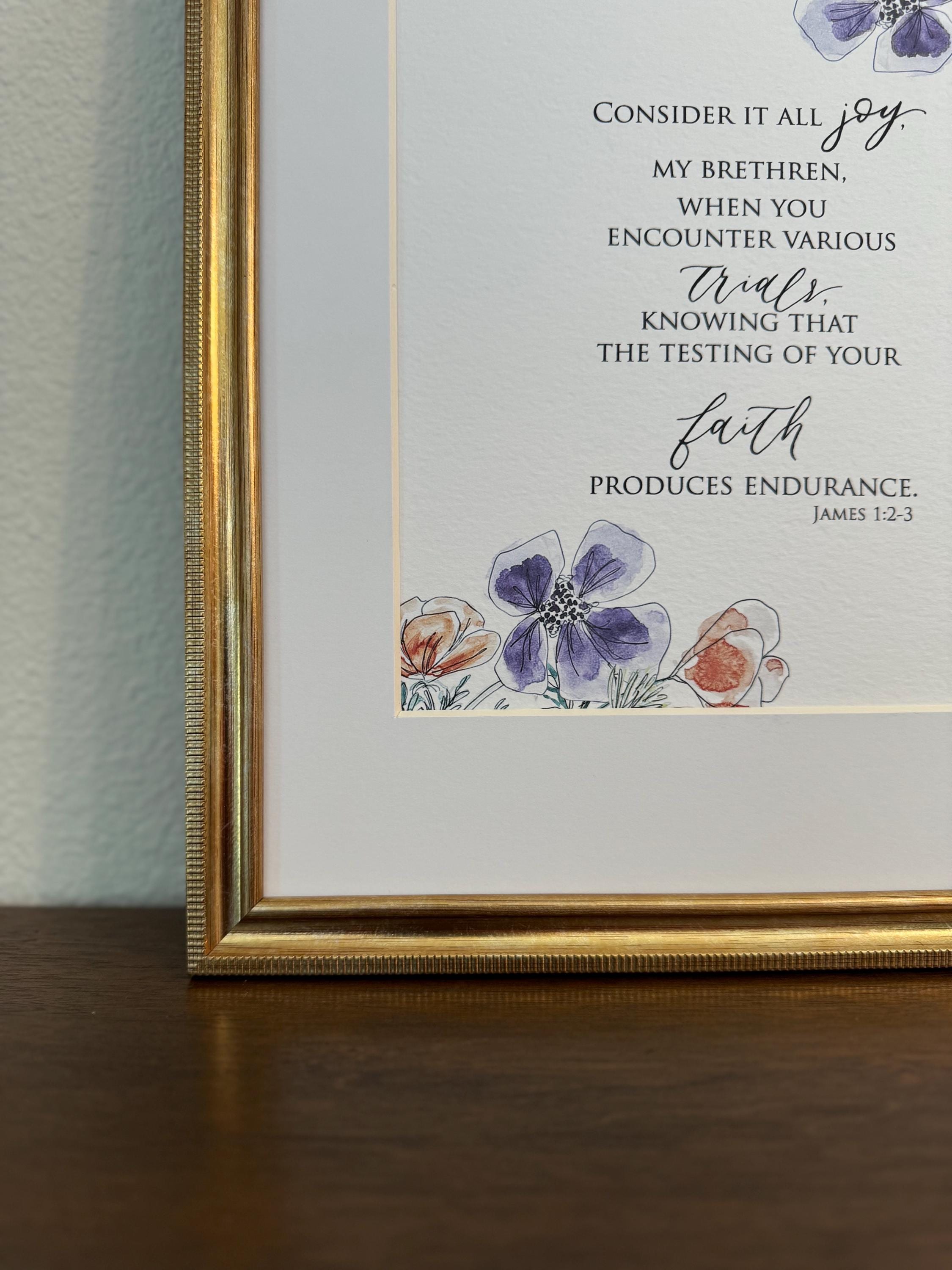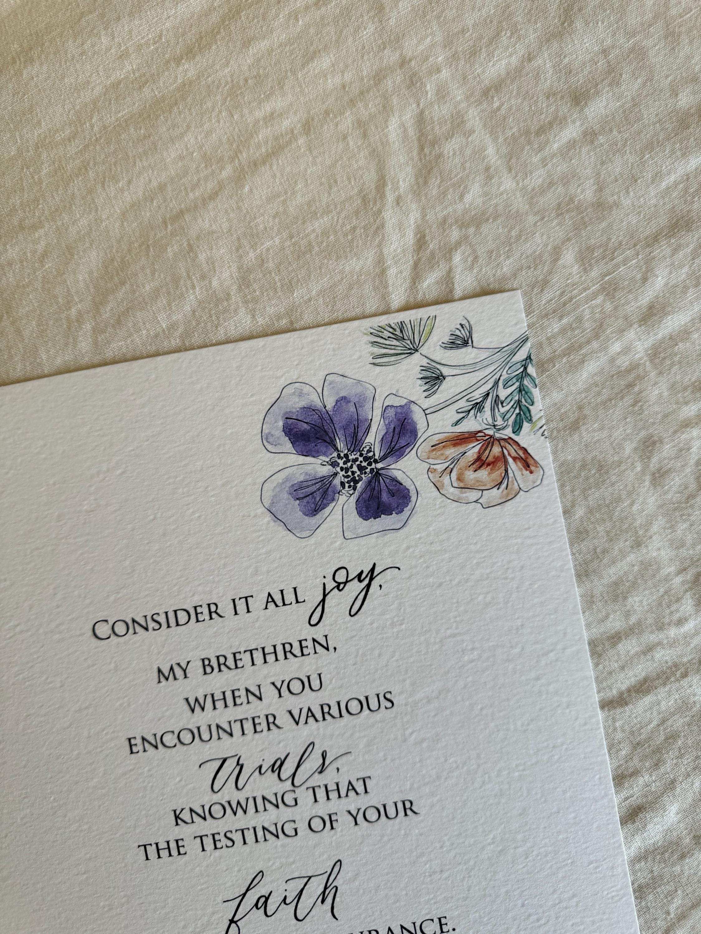 James 1:2-3 Scripture Print • Calligraphy, Watercolor Floral, Italian Paper