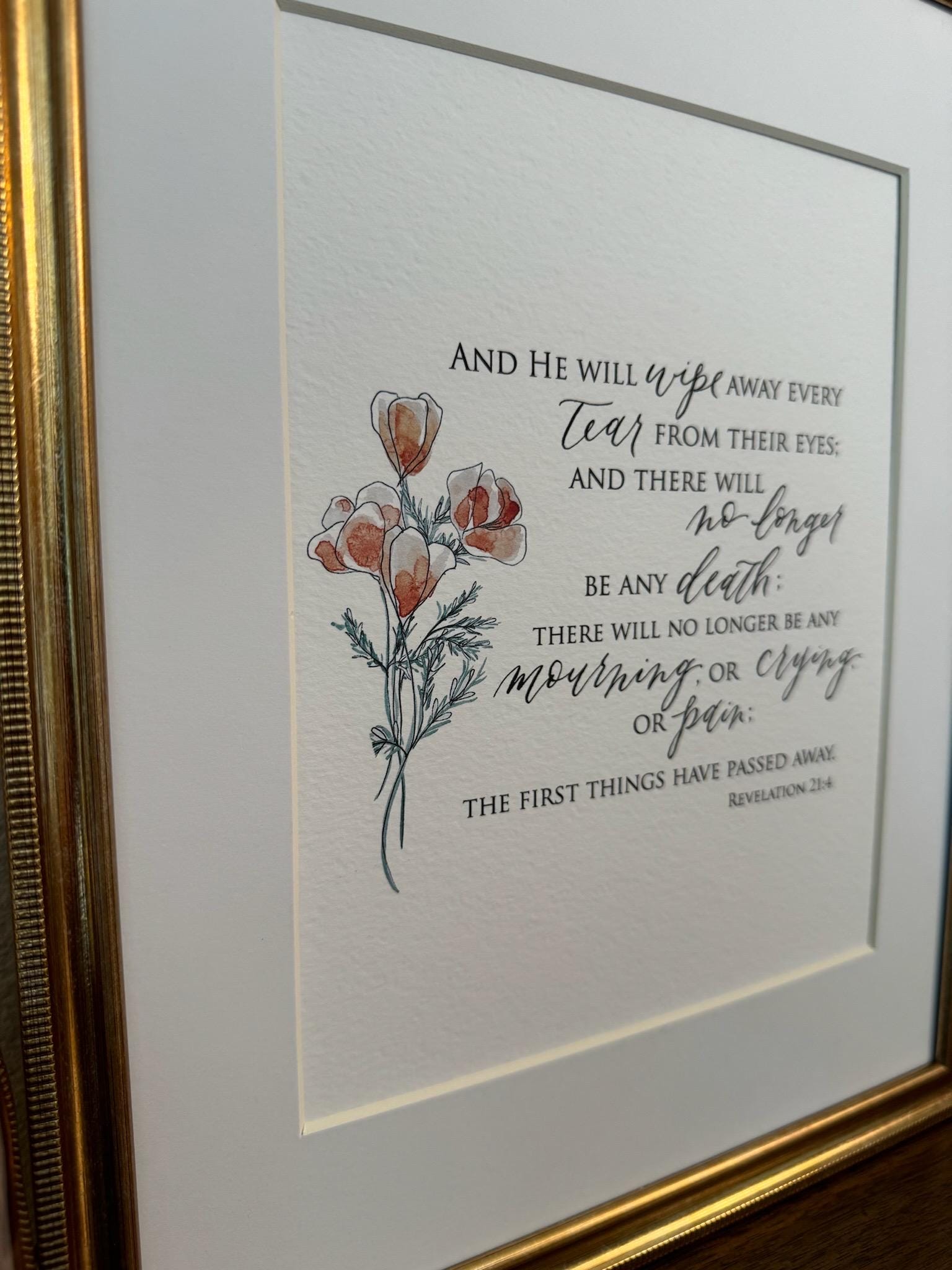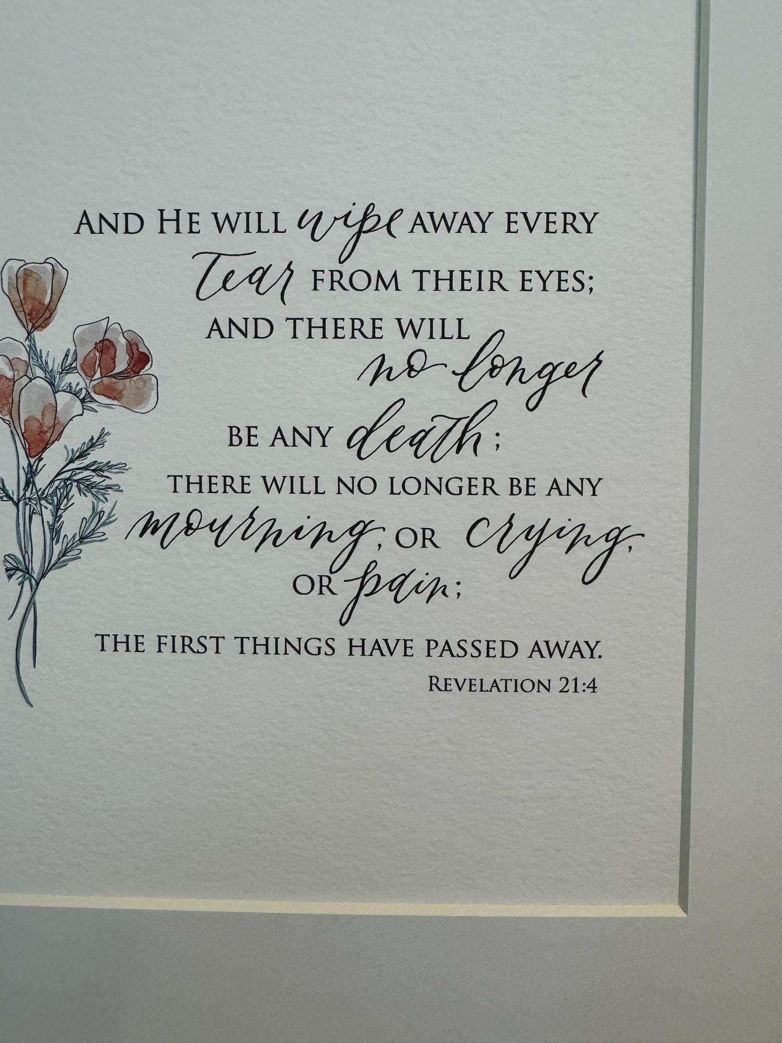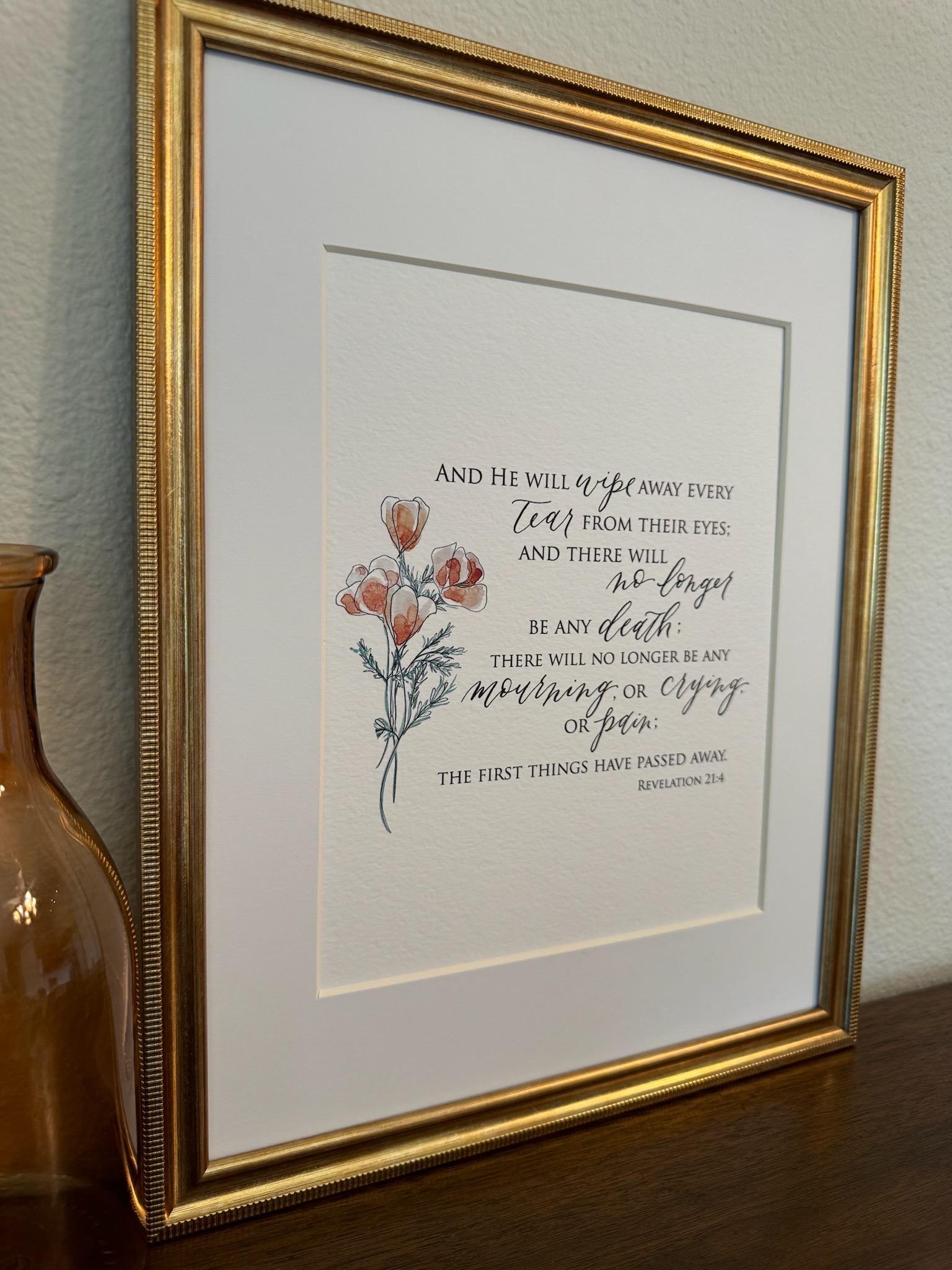 Revelation 21:4 Scripture Print • Calligraphy, Floral Watercolor, Italian Paper