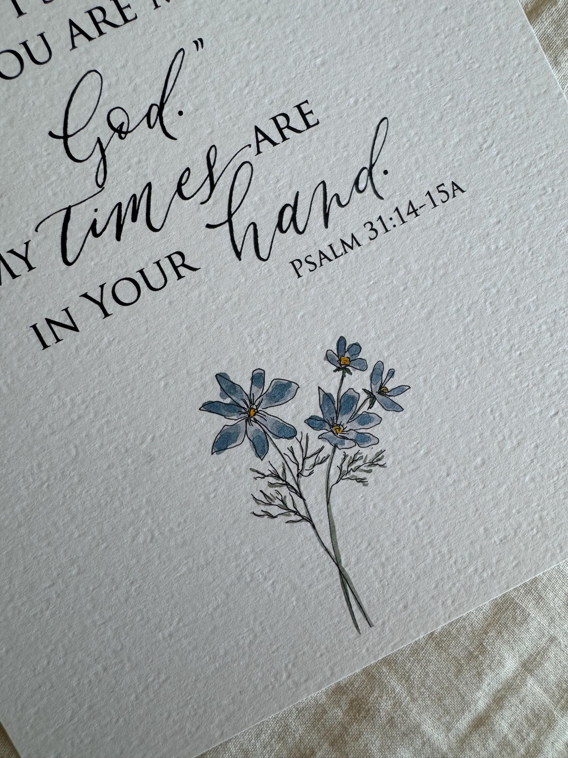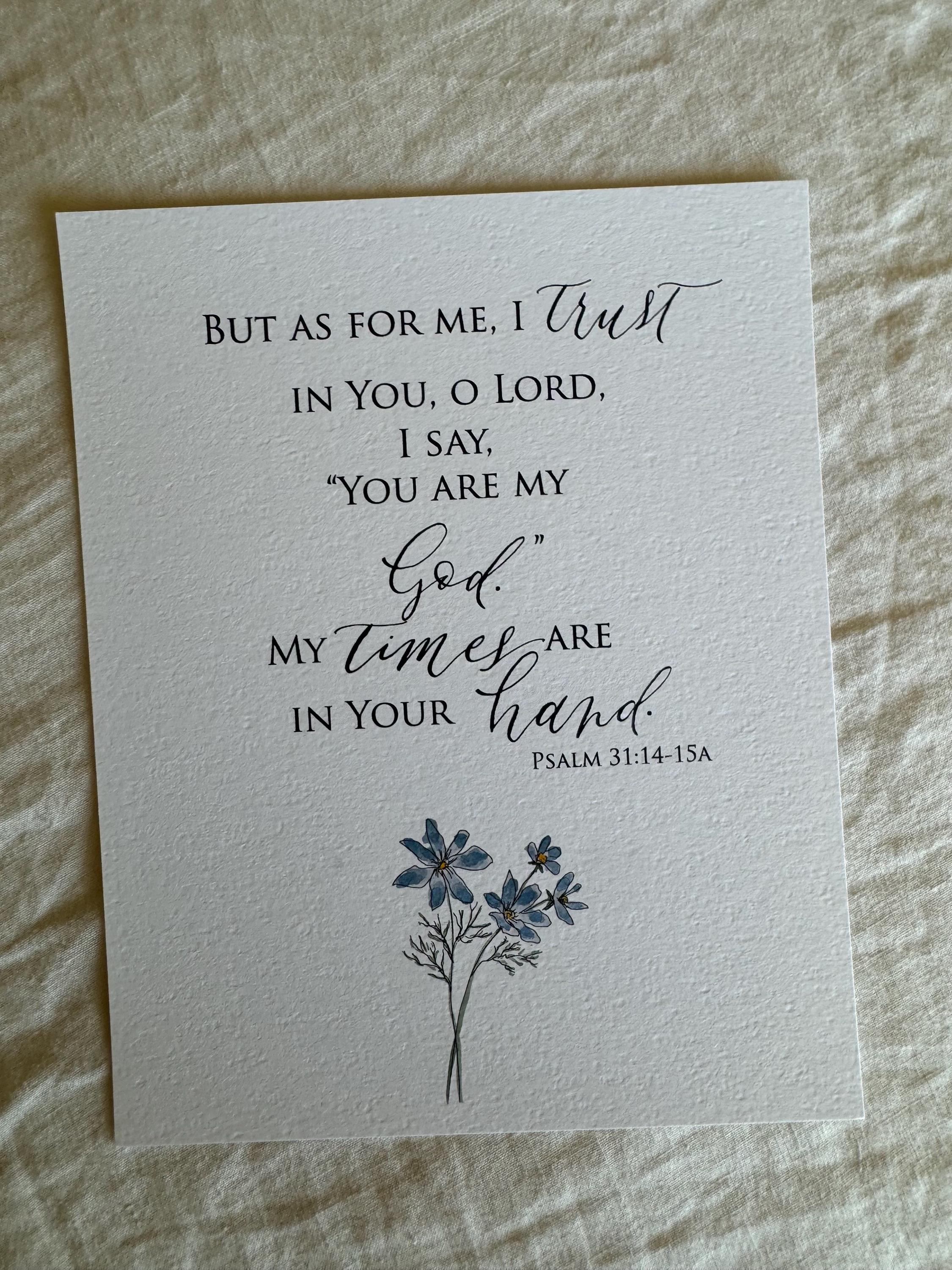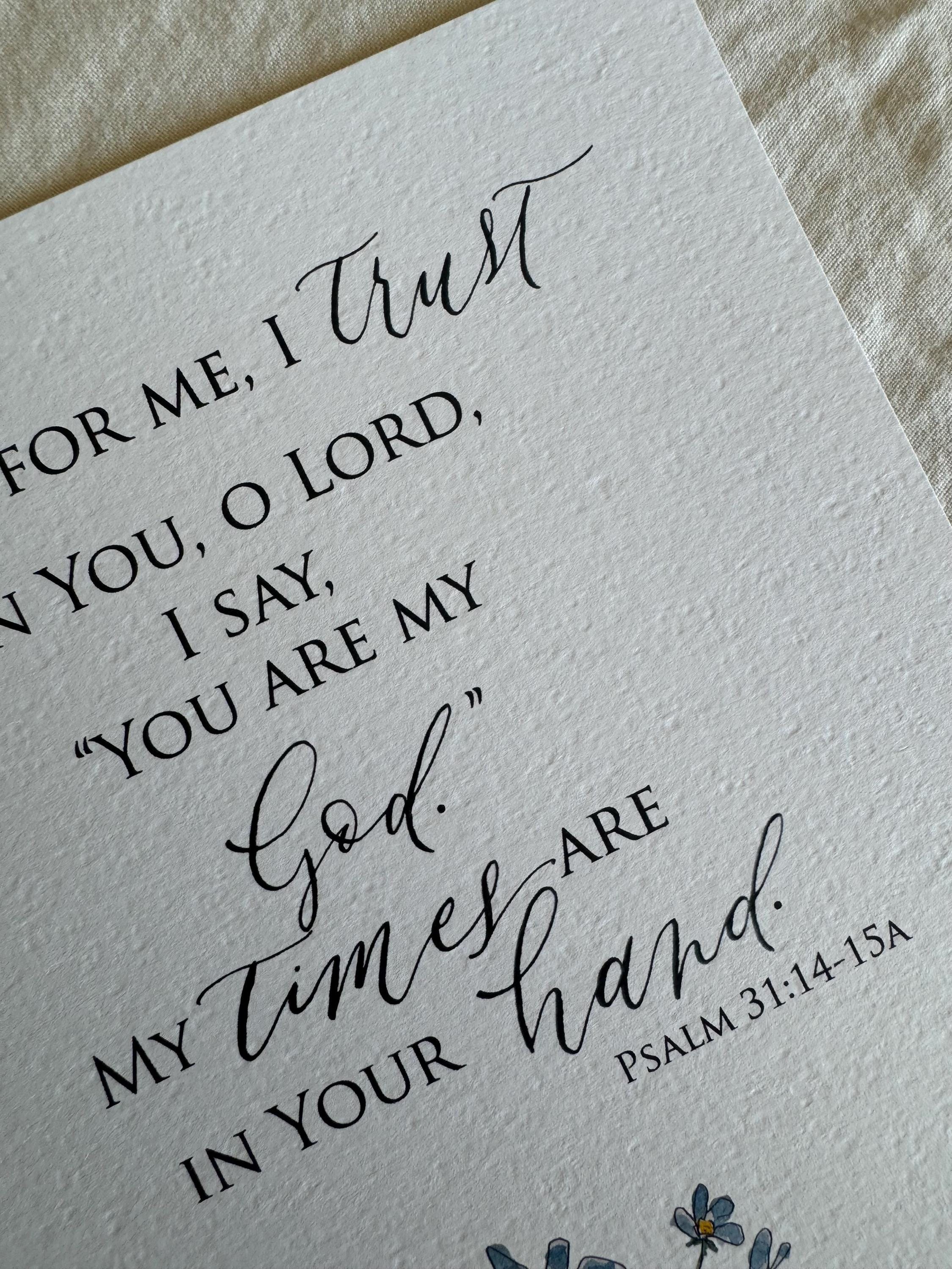 Psalm 31:14-15a Scripture Print • Calligraphy, Floral Watercolor, Italian Paper