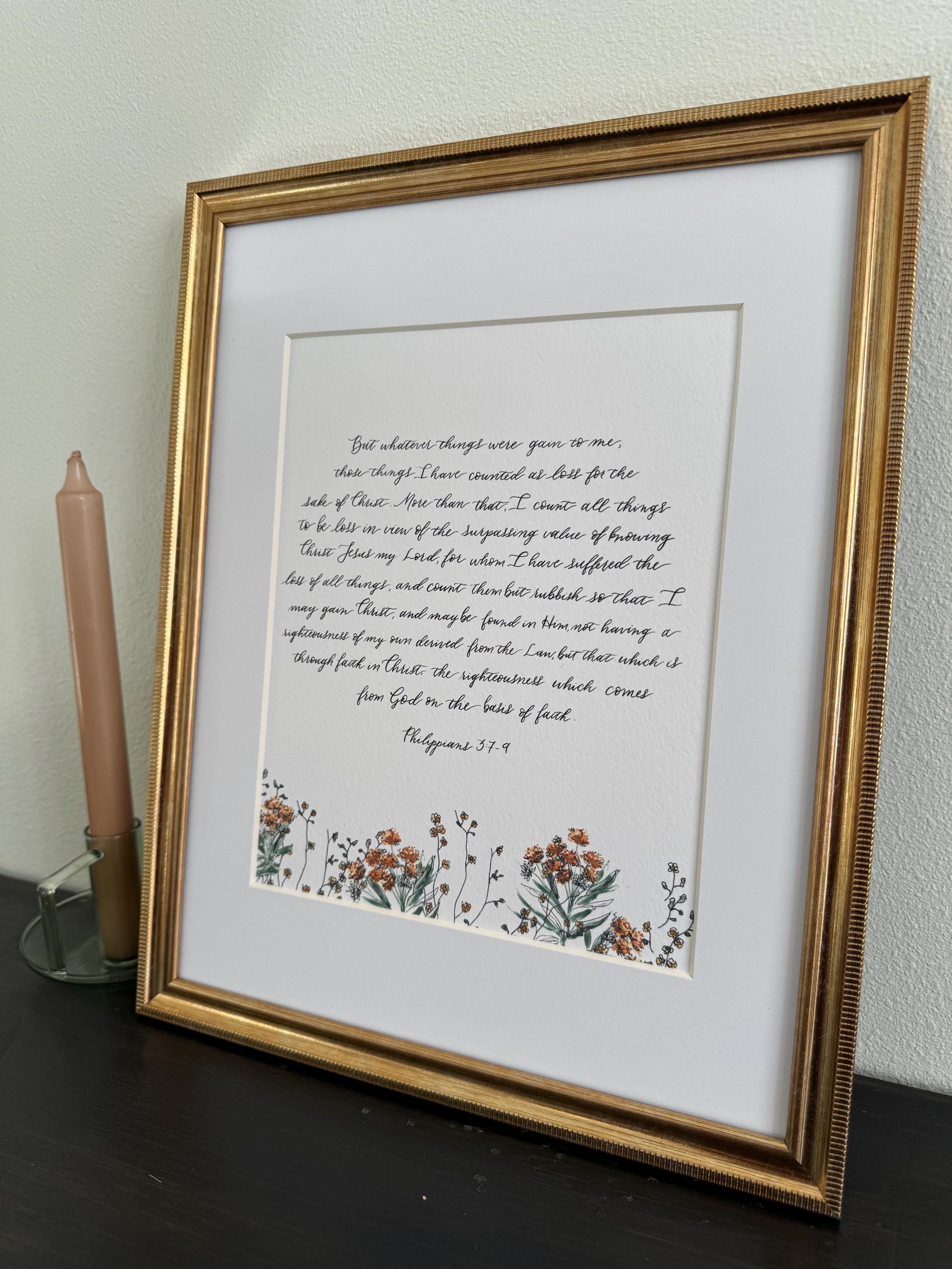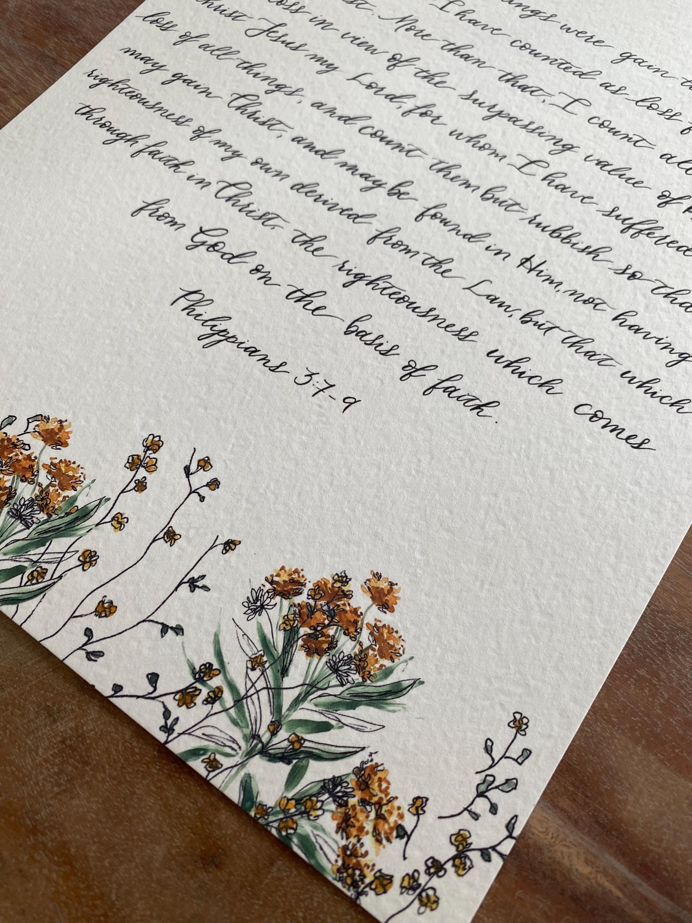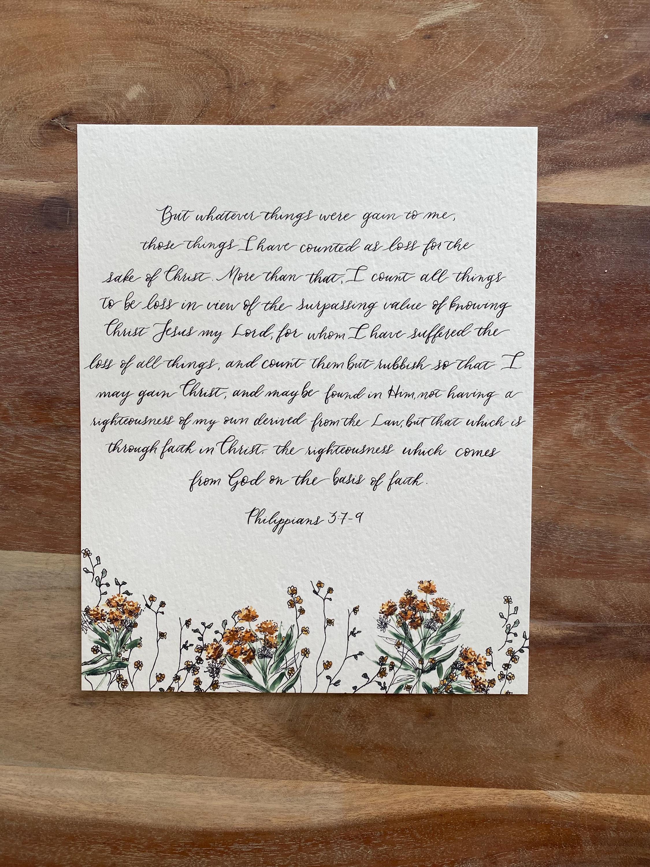 Philippians 3:7-9 Scripture Print • Calligraphy, Floral Watercolor, Italian Paper