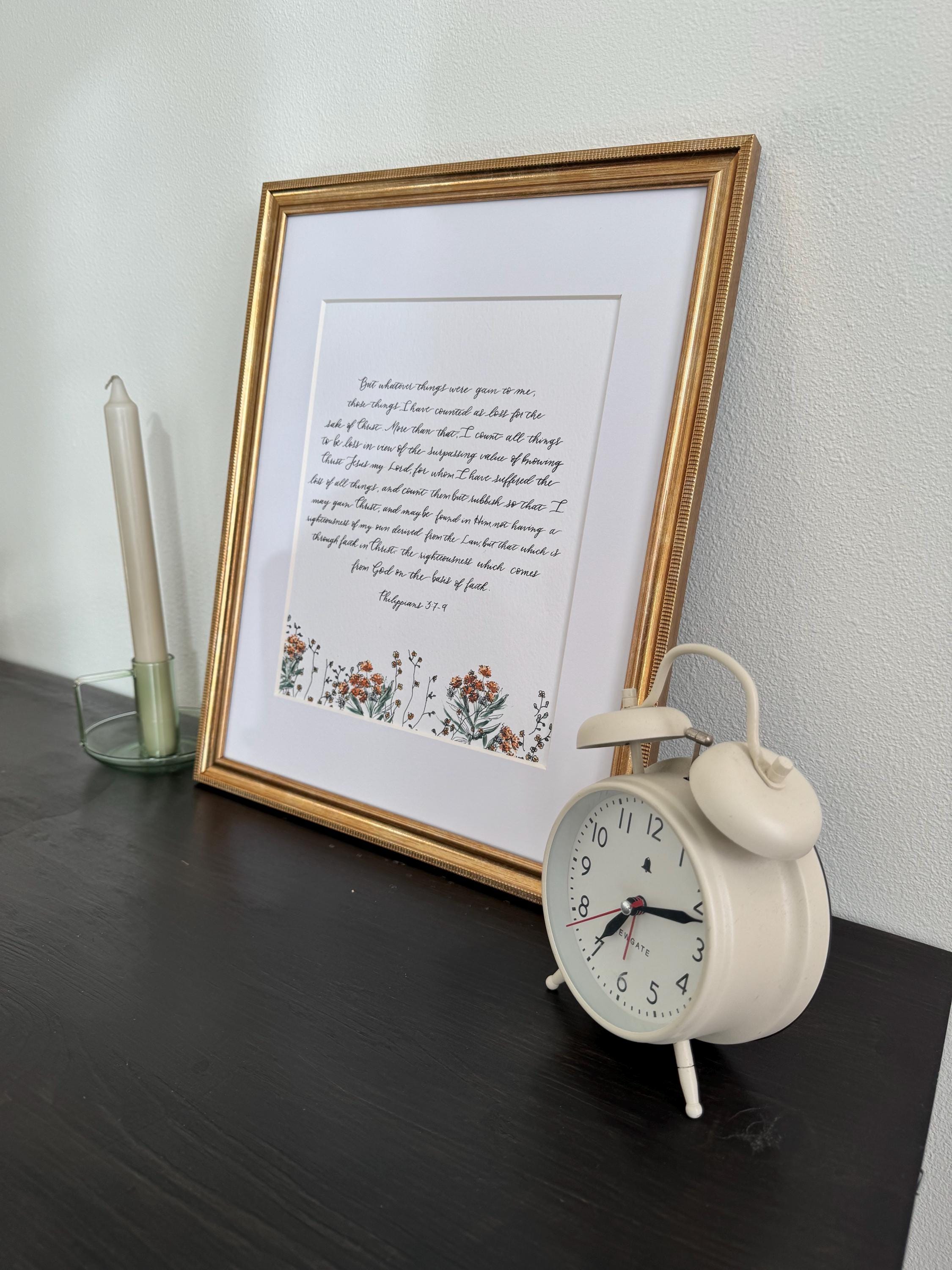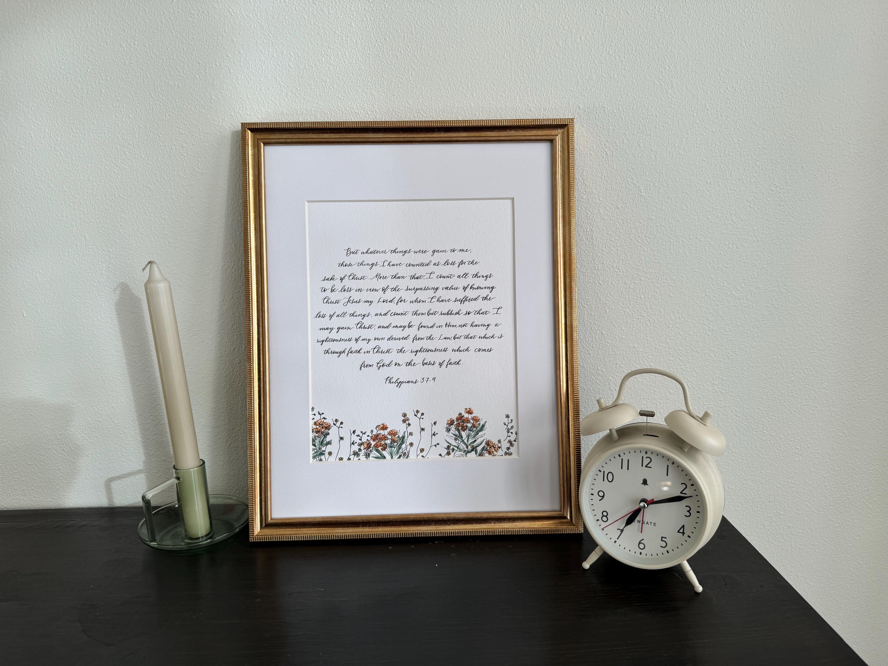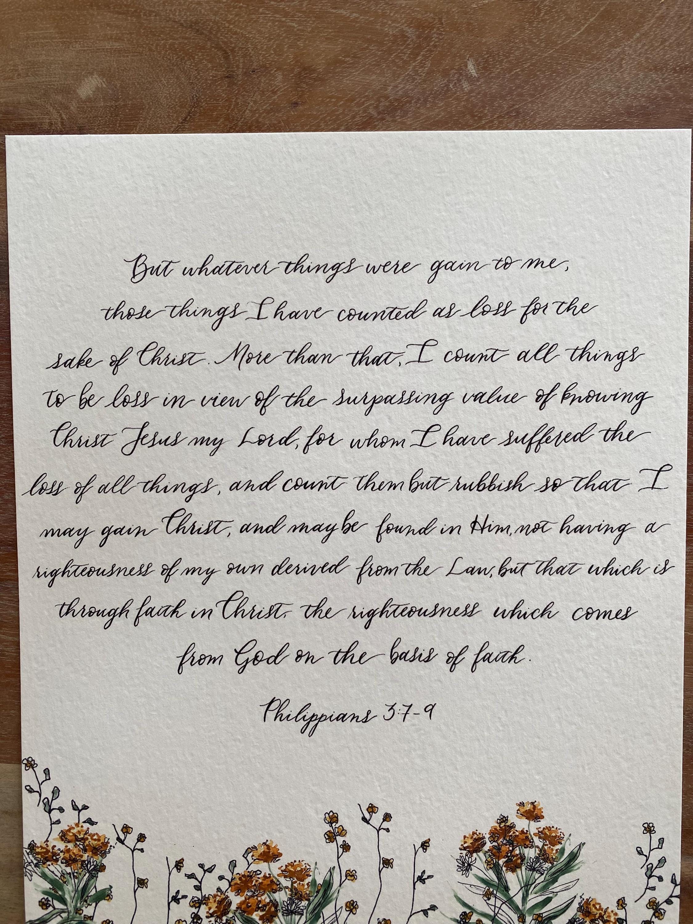 Philippians 3:7-9 Scripture Print • Calligraphy, Floral Watercolor, Italian Paper