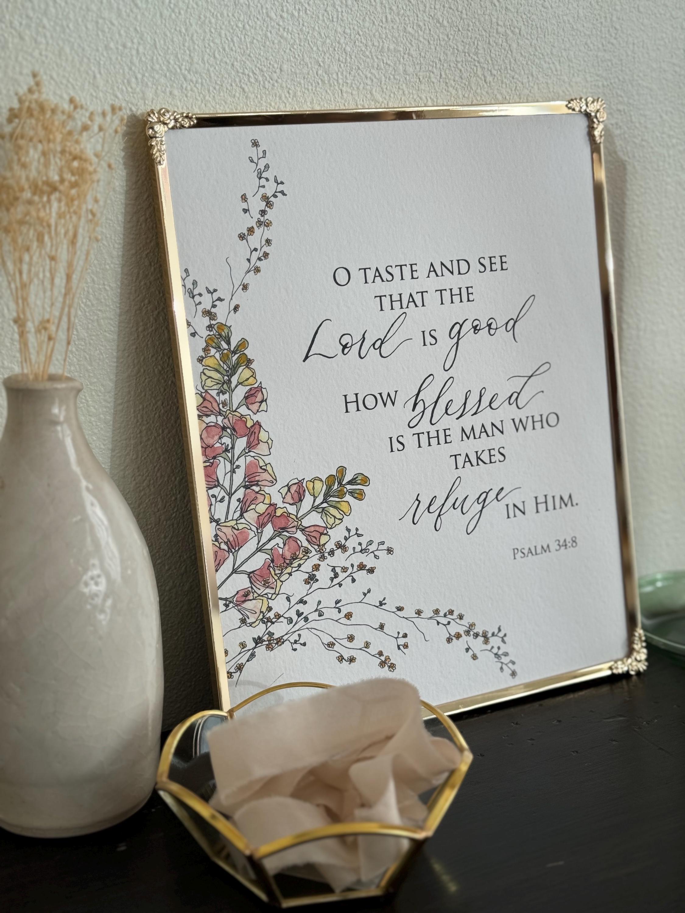 Lara creates our beautiful floral designs using pen & ink and watercolors. Melisa uses dip pen calligraphy to write the Scripture. We bring the two together and print them on textured Italian cotton-content paper that closely resembles the textured feel of watercolor paper. The end product is a beautiful floral Scripture print for your home!