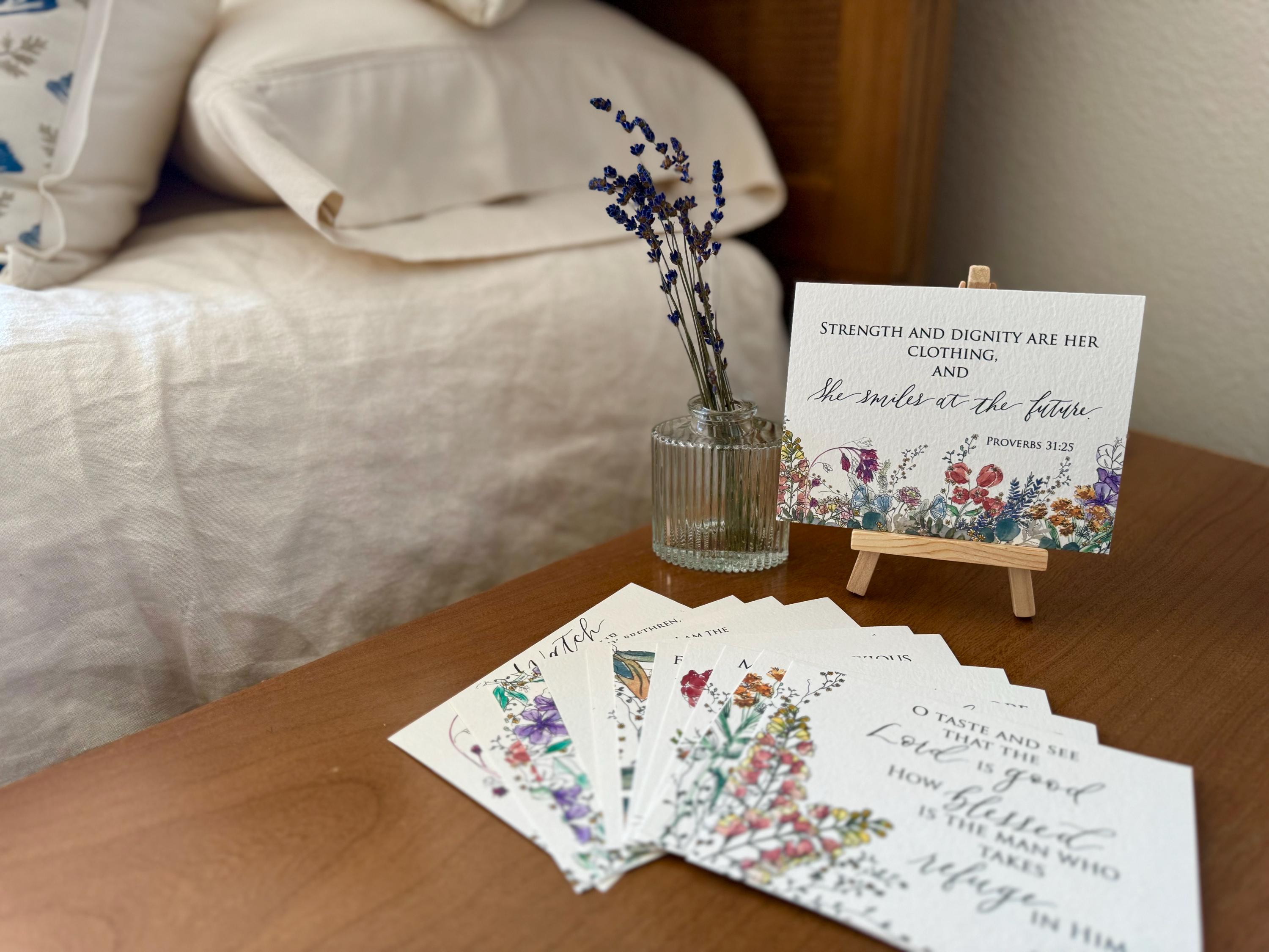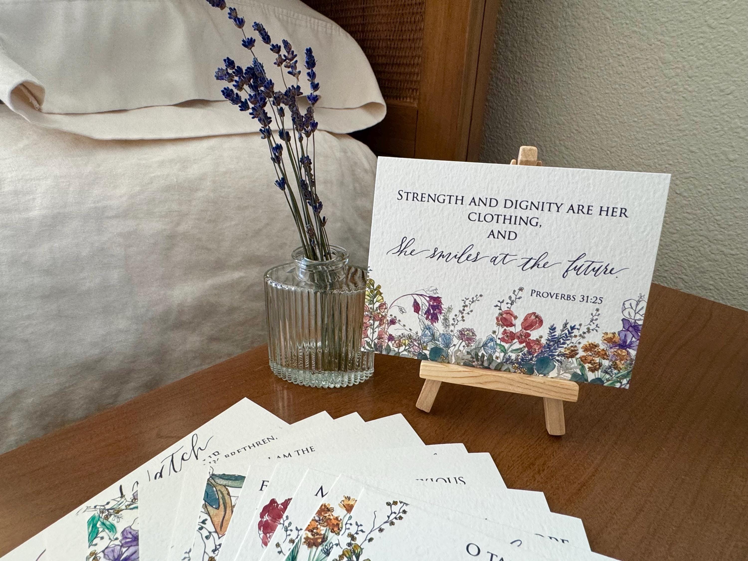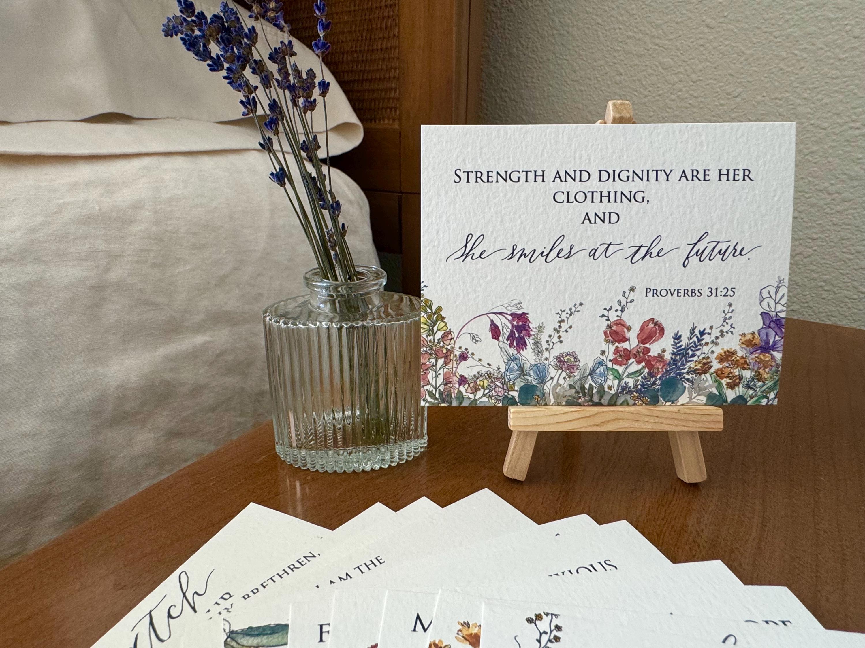 Smiling at the Future Bible Memory Verse Cards • Floral Watercolor Calligraphy, Italian Paper