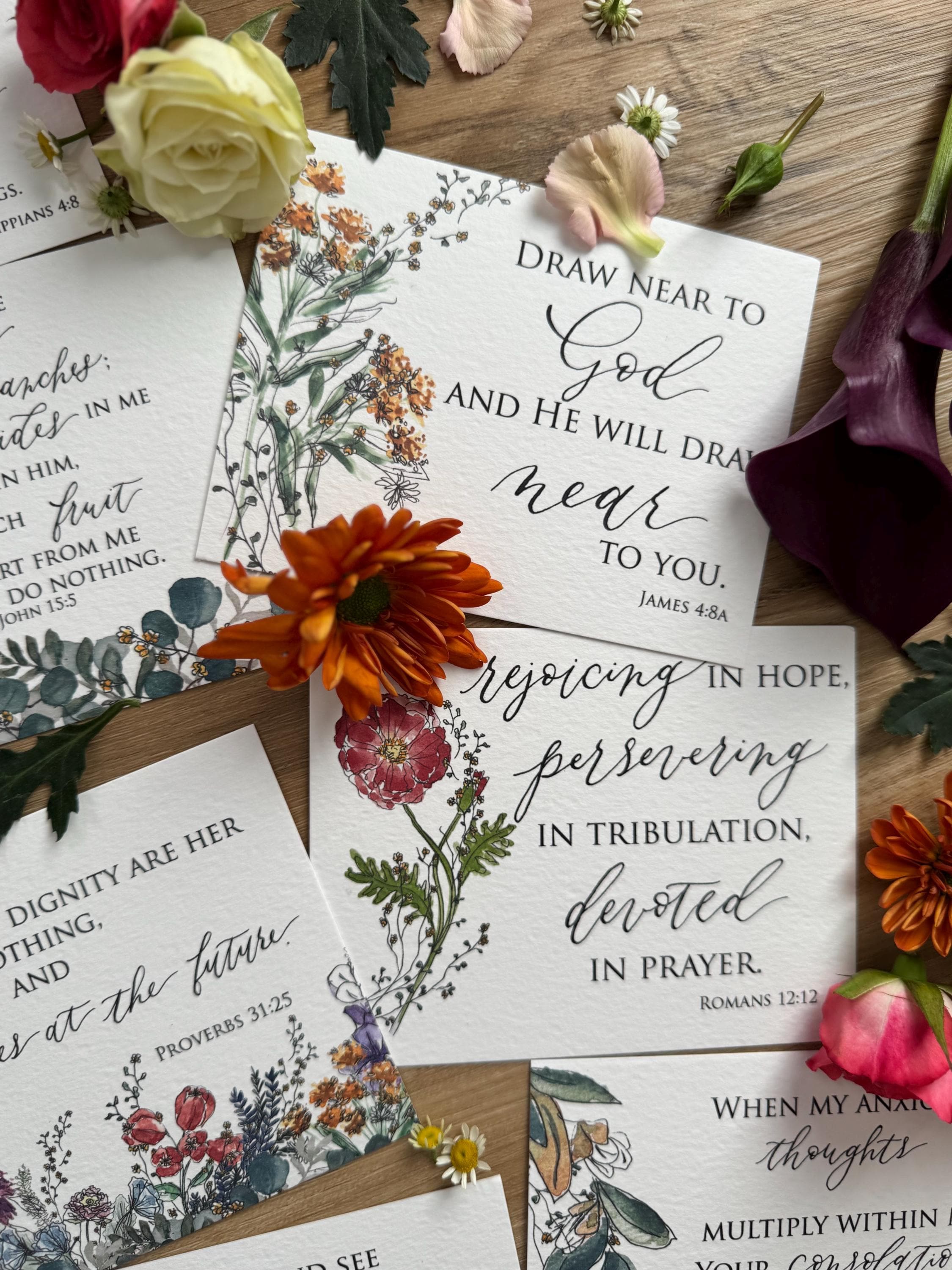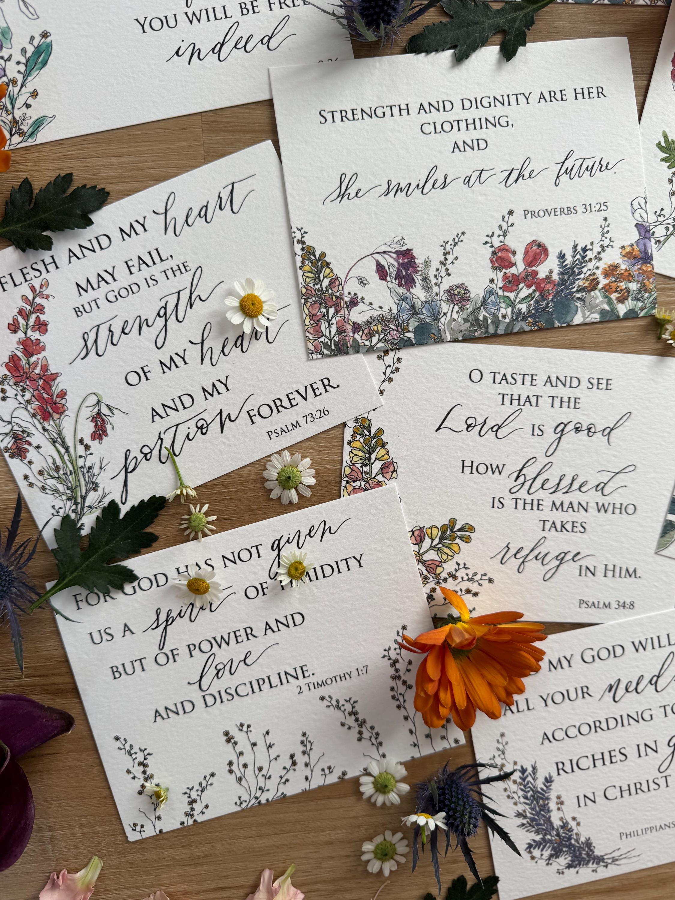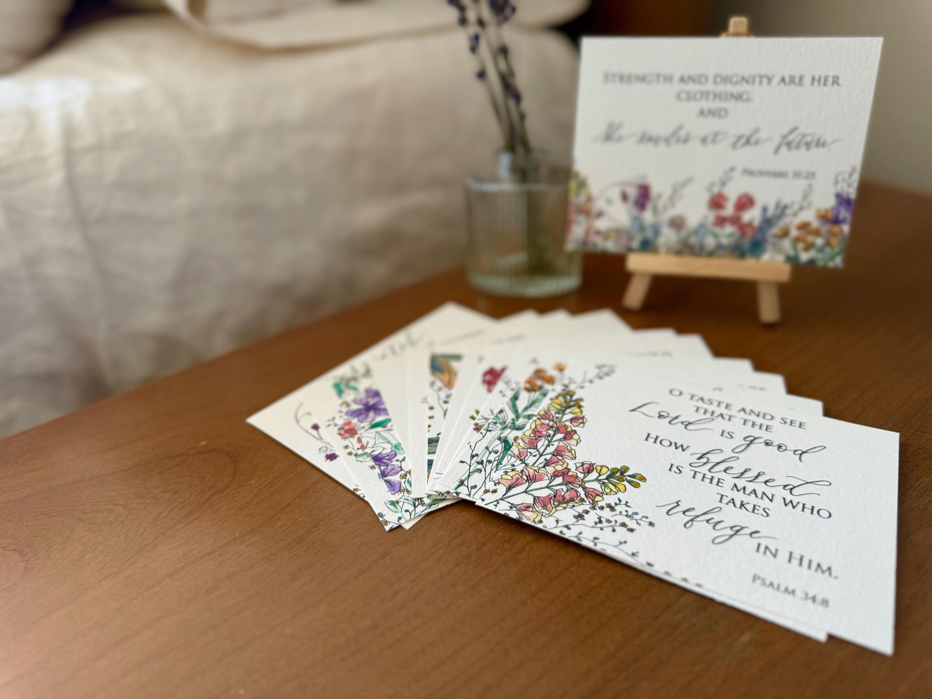 Smiling at the Future Bible Memory Verse Cards • Floral Watercolor Calligraphy, Italian Paper