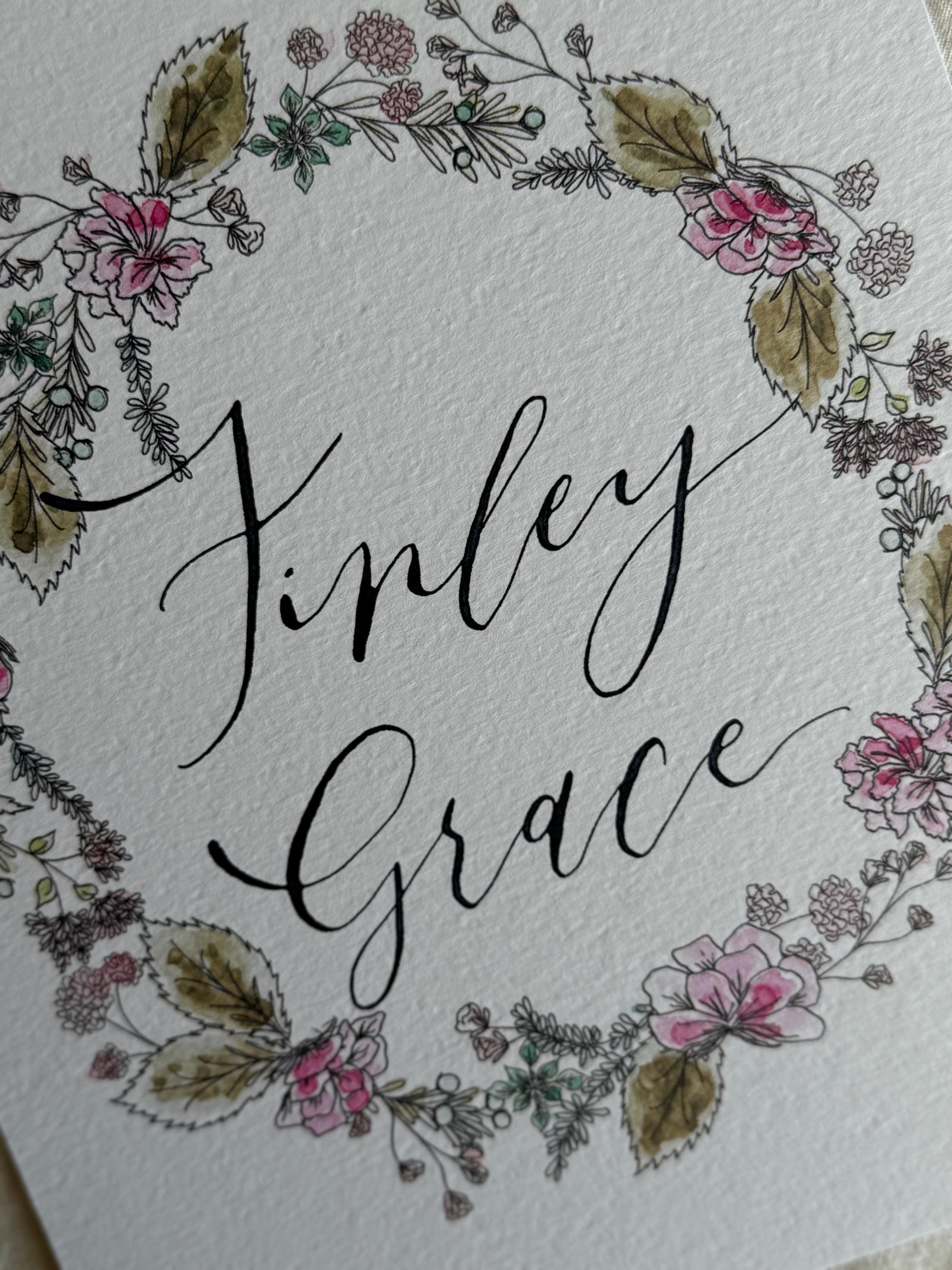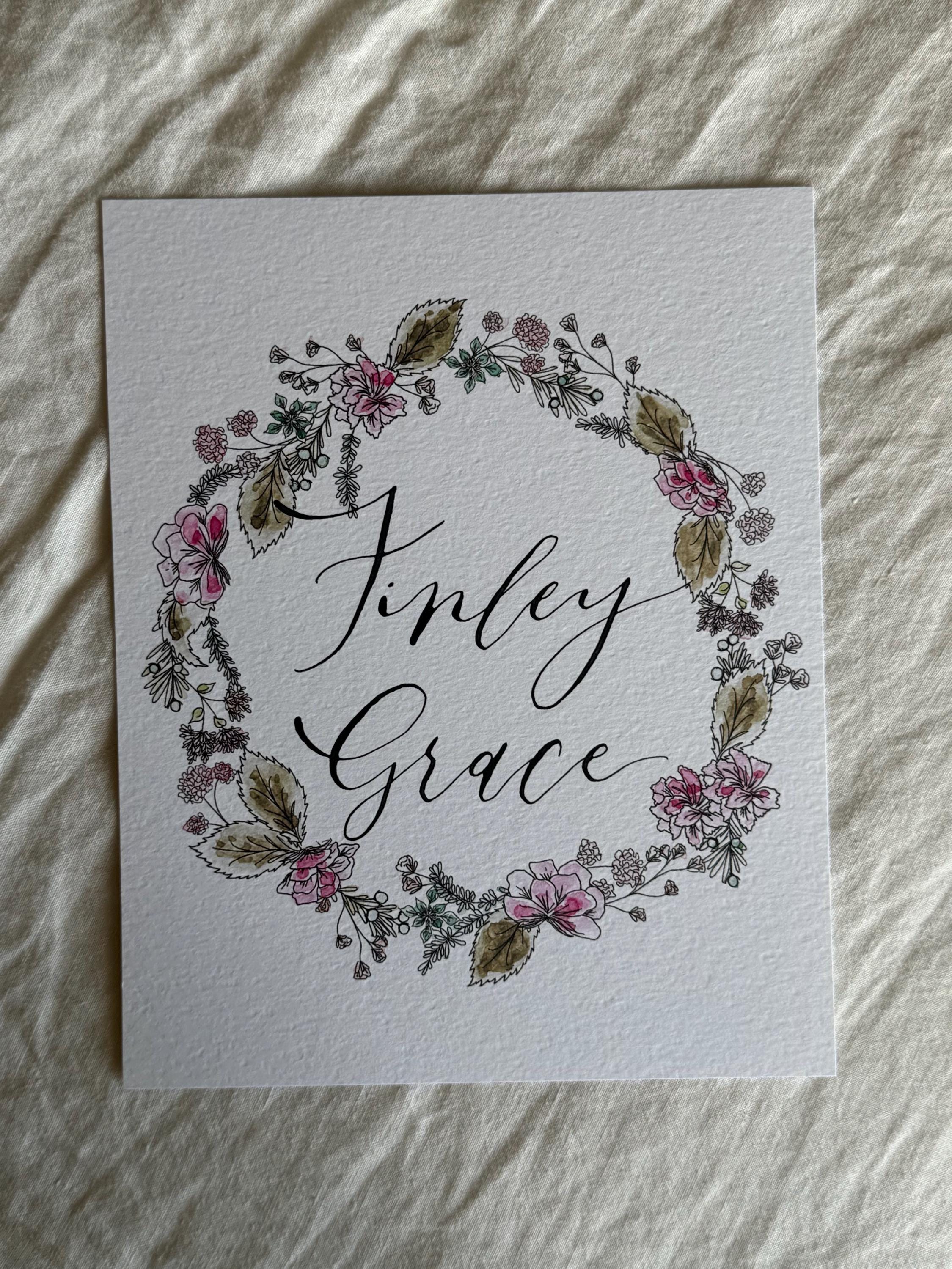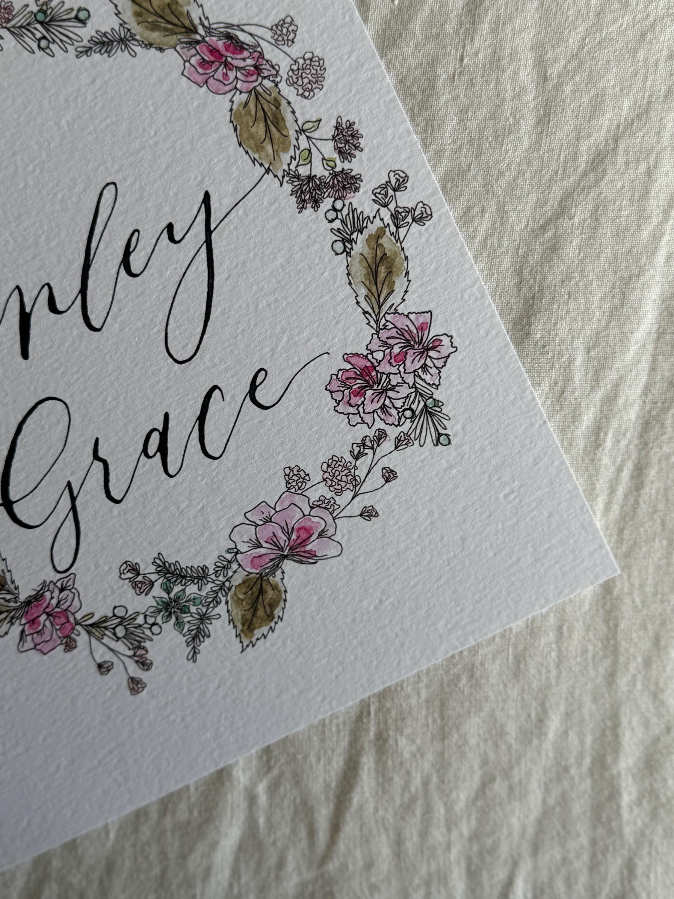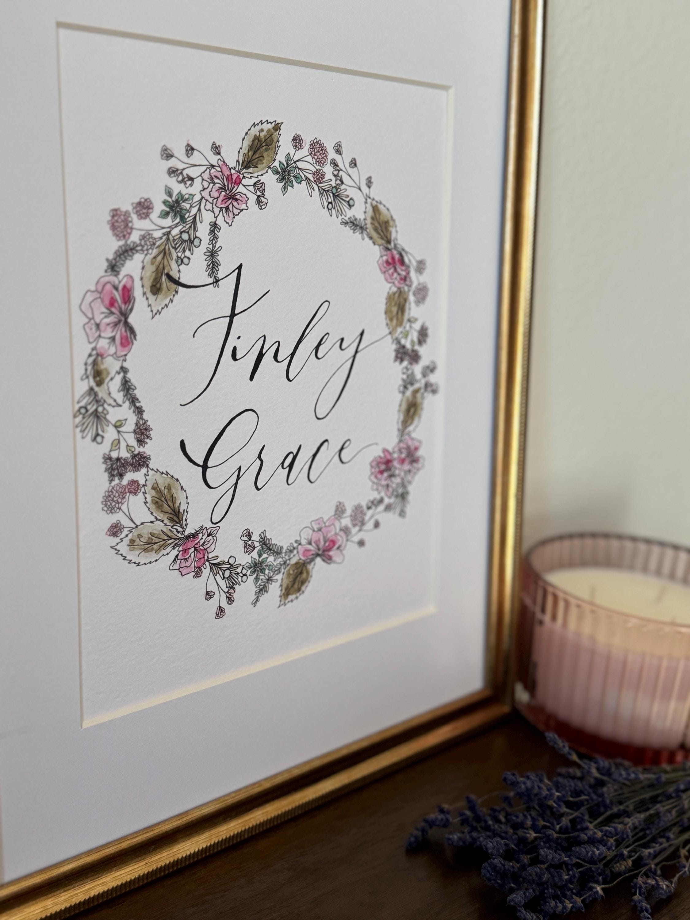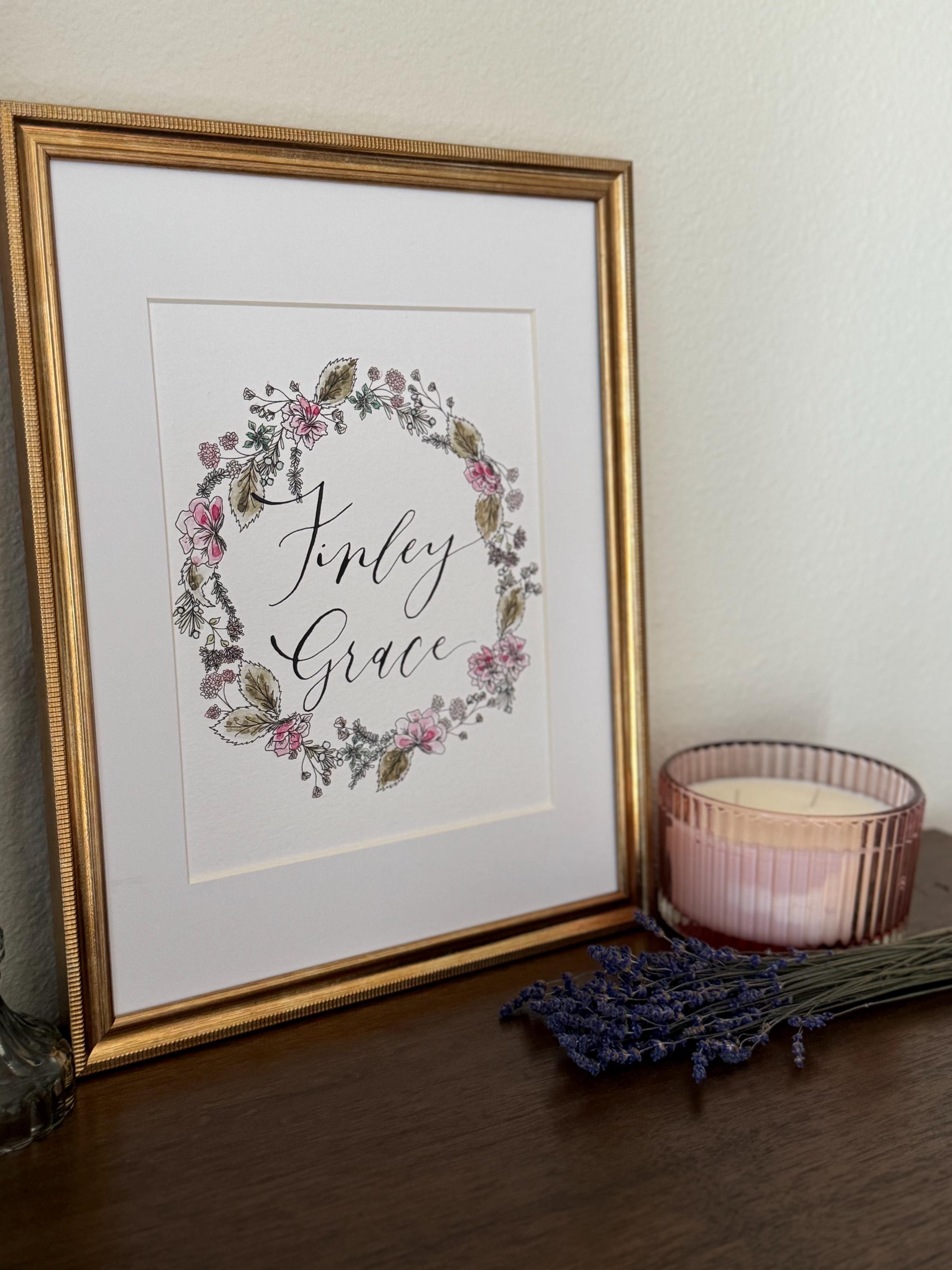 Custom Baby Name Floral Wreath Print • Italian Paper Calligraphy, Nursery Art