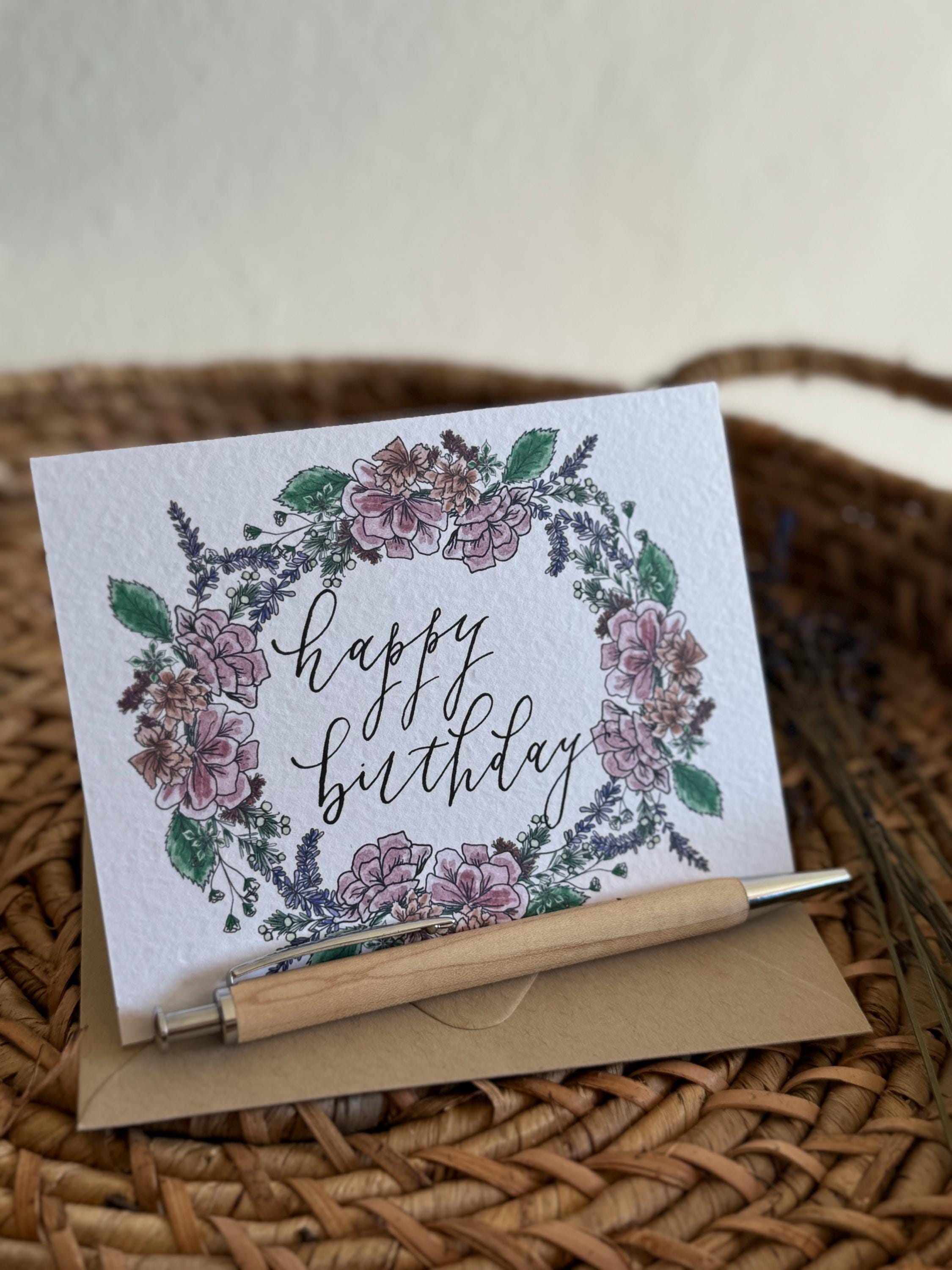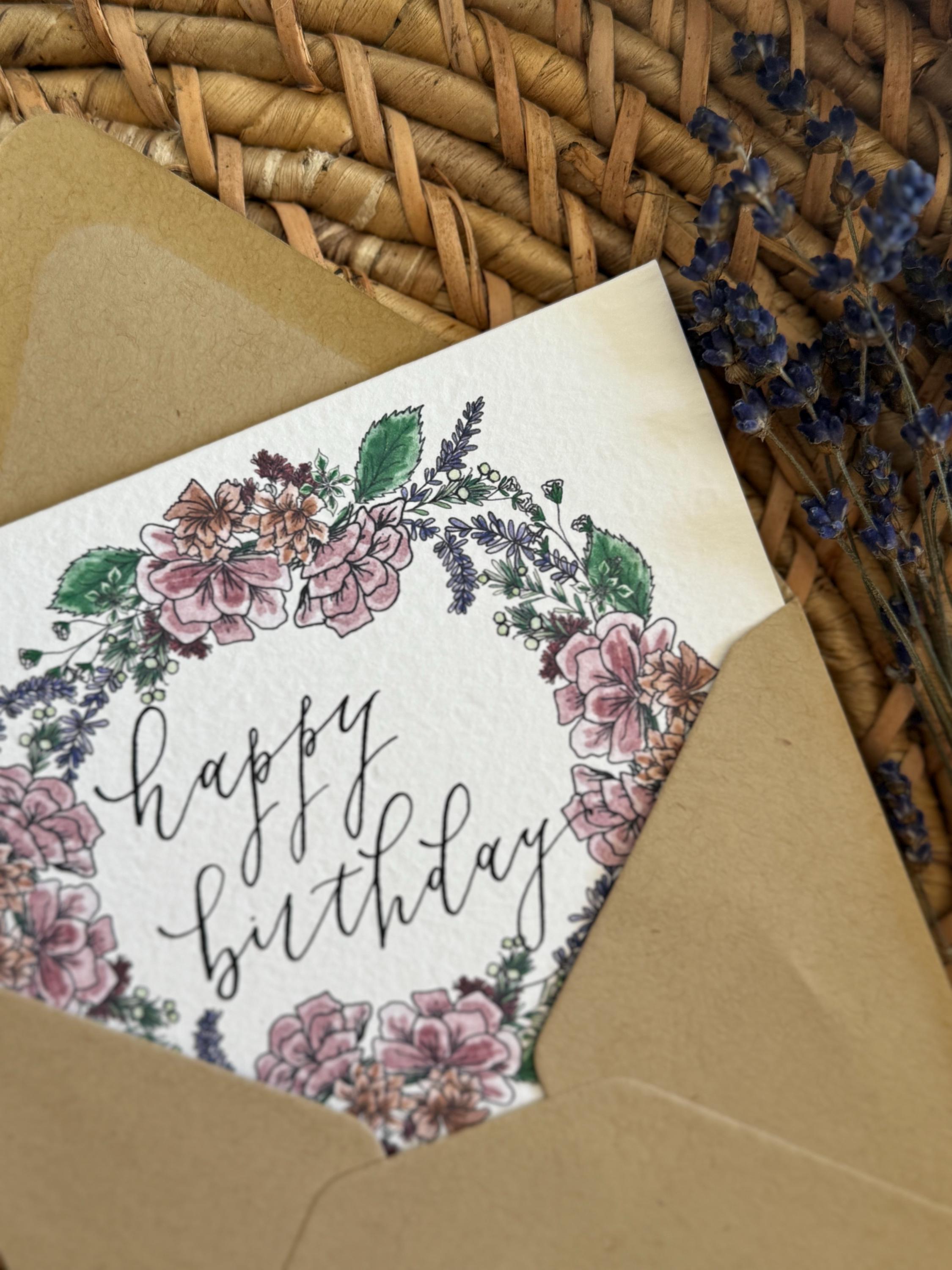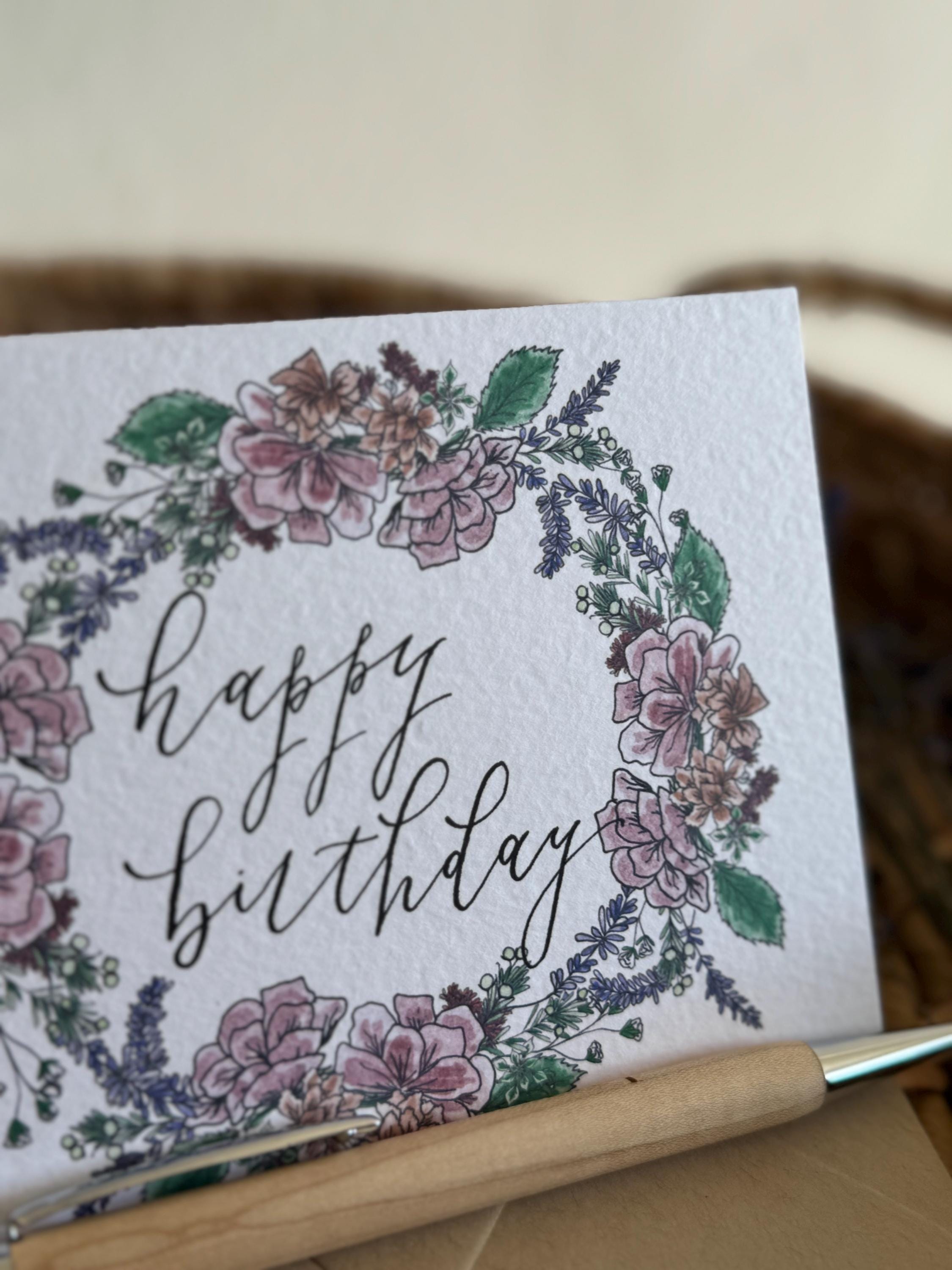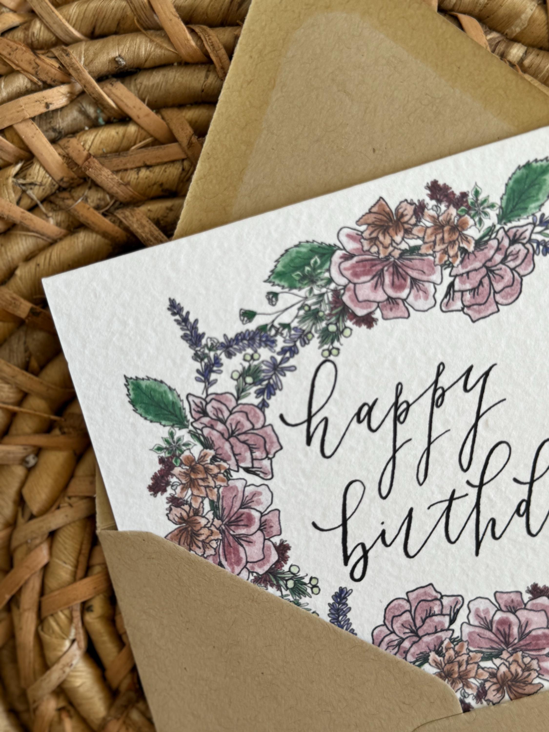 Happy Birthday greeting card with florals • Watercolor & Calligraphy on Italian Paper •