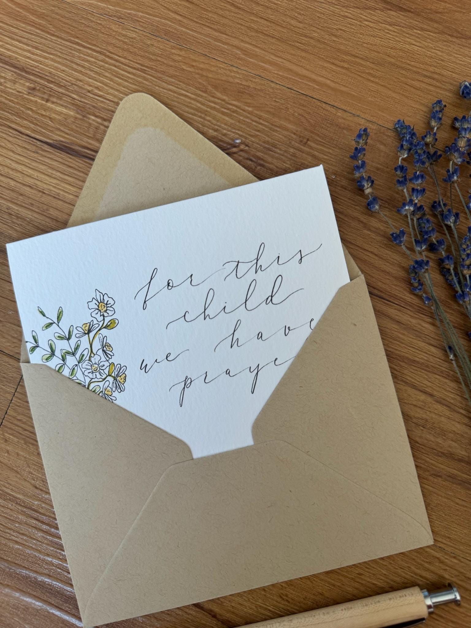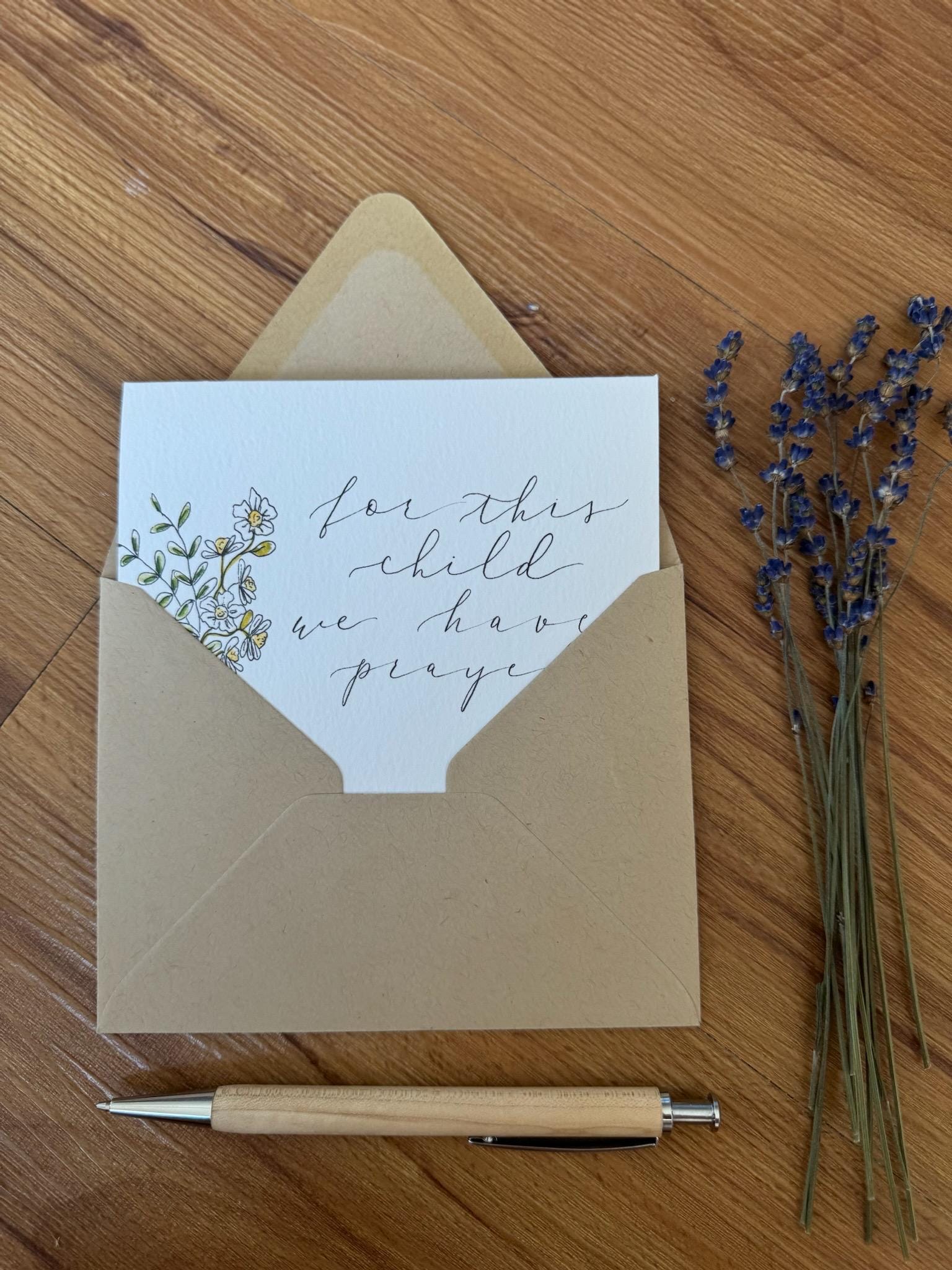 One 4.25x5.5” card printed on textured Italian paper, slipped into a paper envelope, and carefully packaged in a plastic sleeve