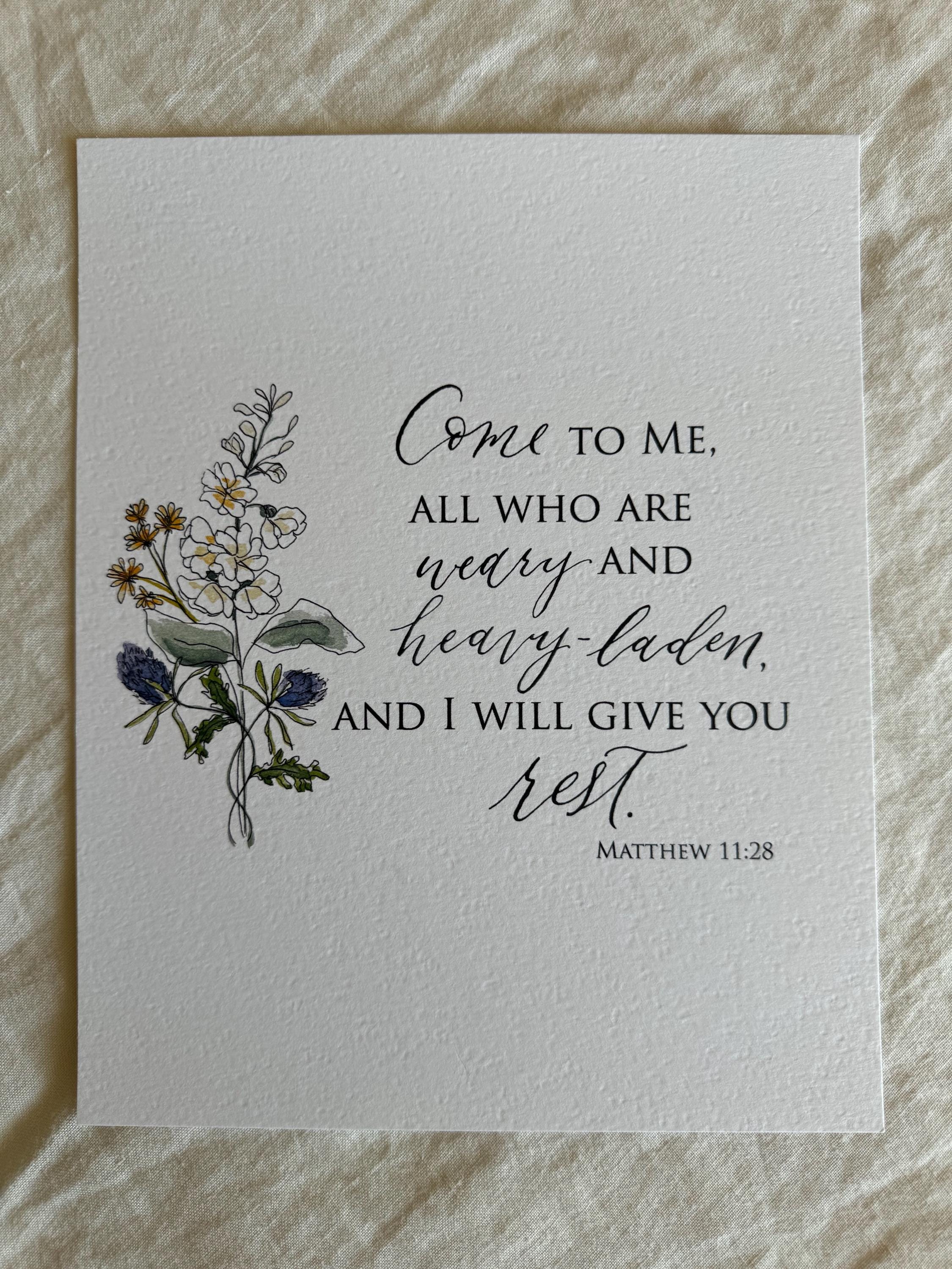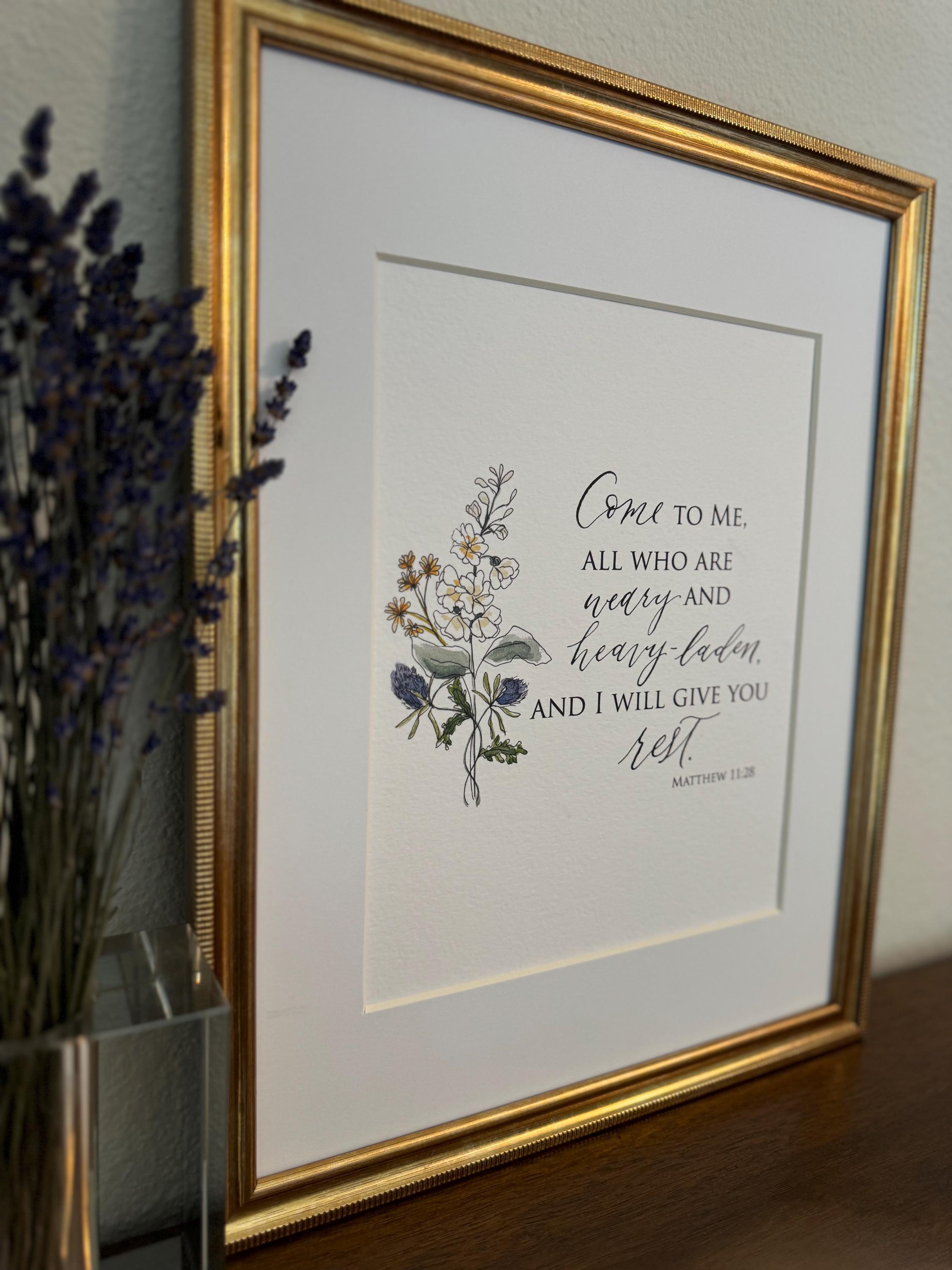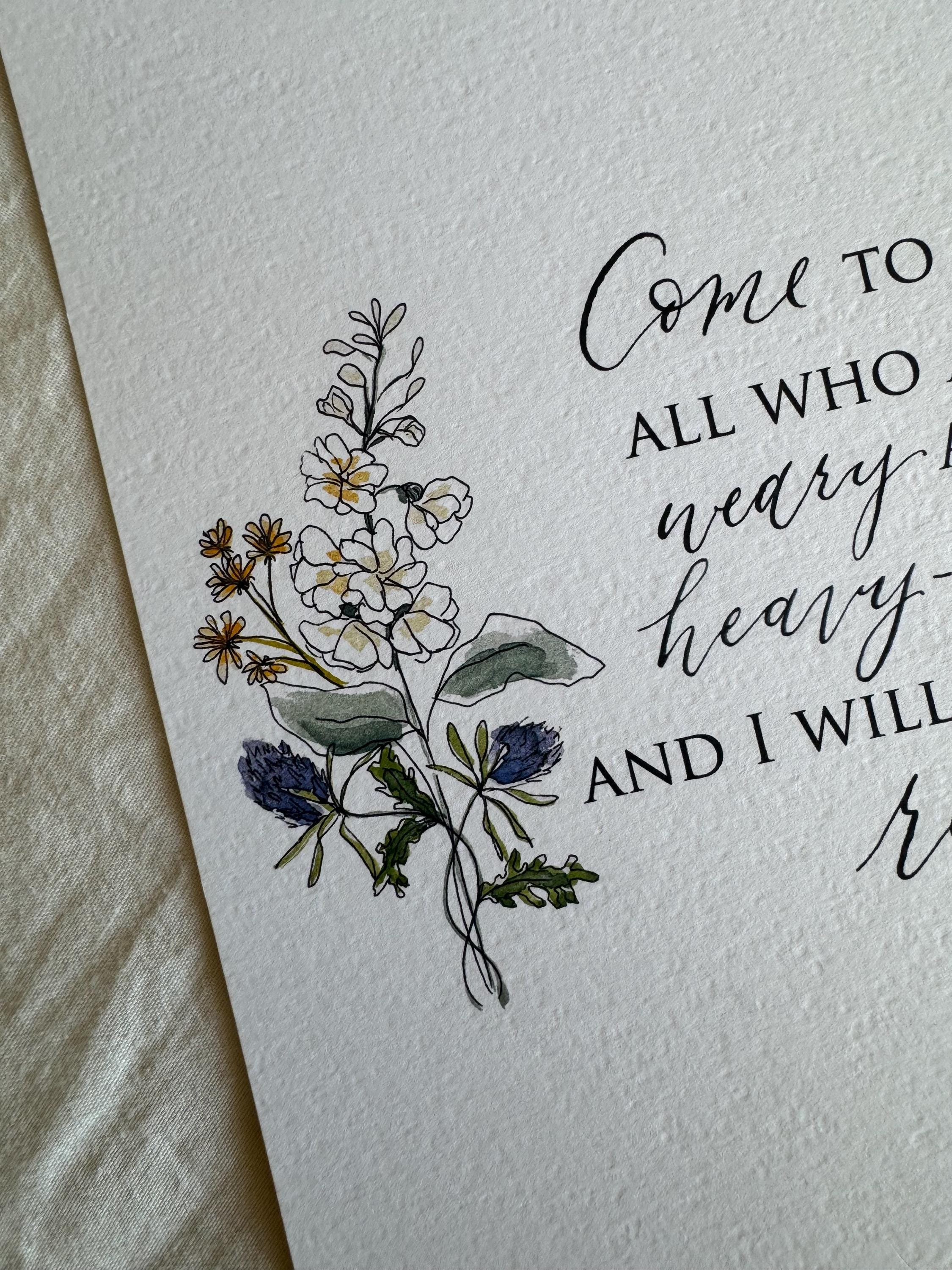 Matthew 11:28 Scripture Print • Calligraphy, Floral Watercolor, Italian Paper