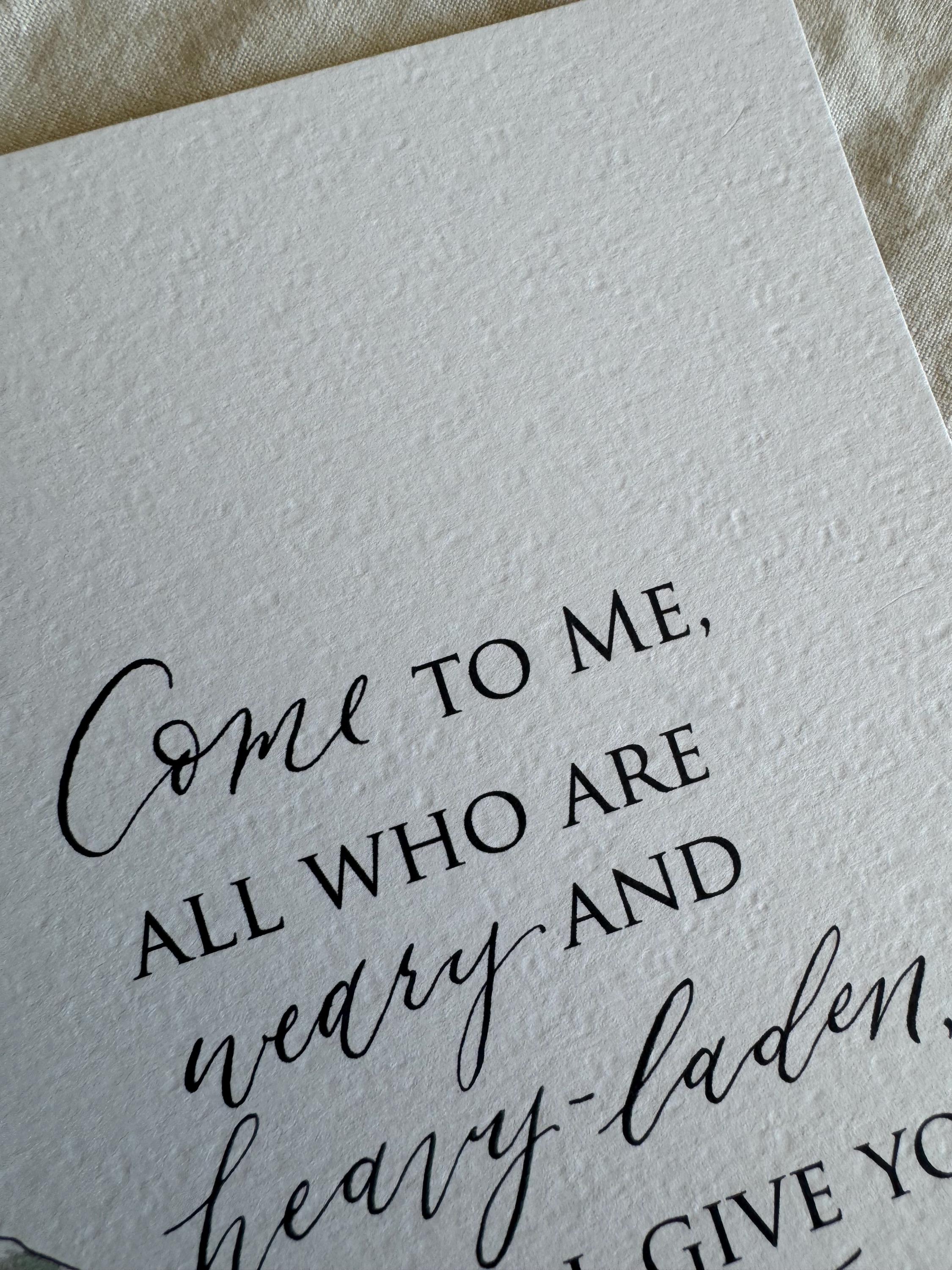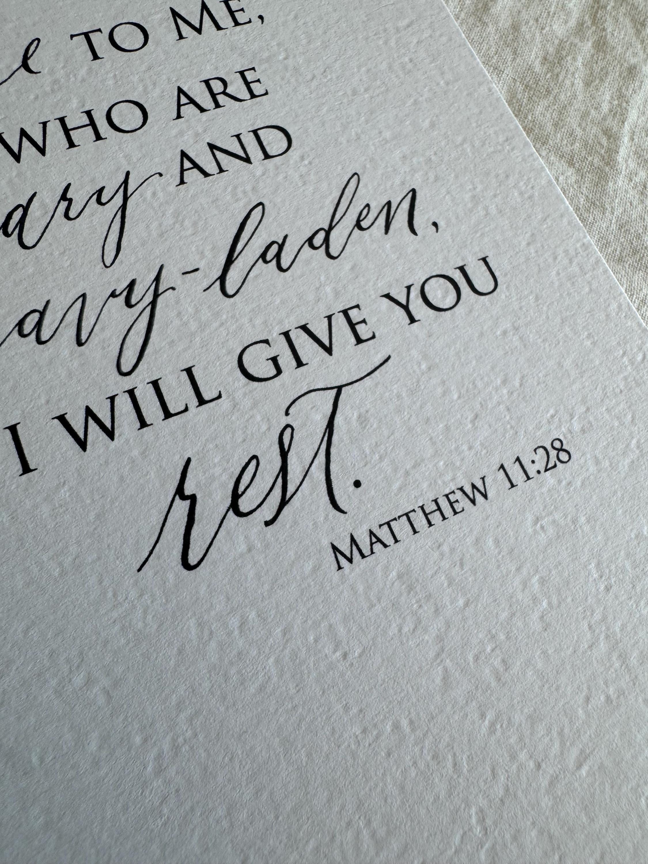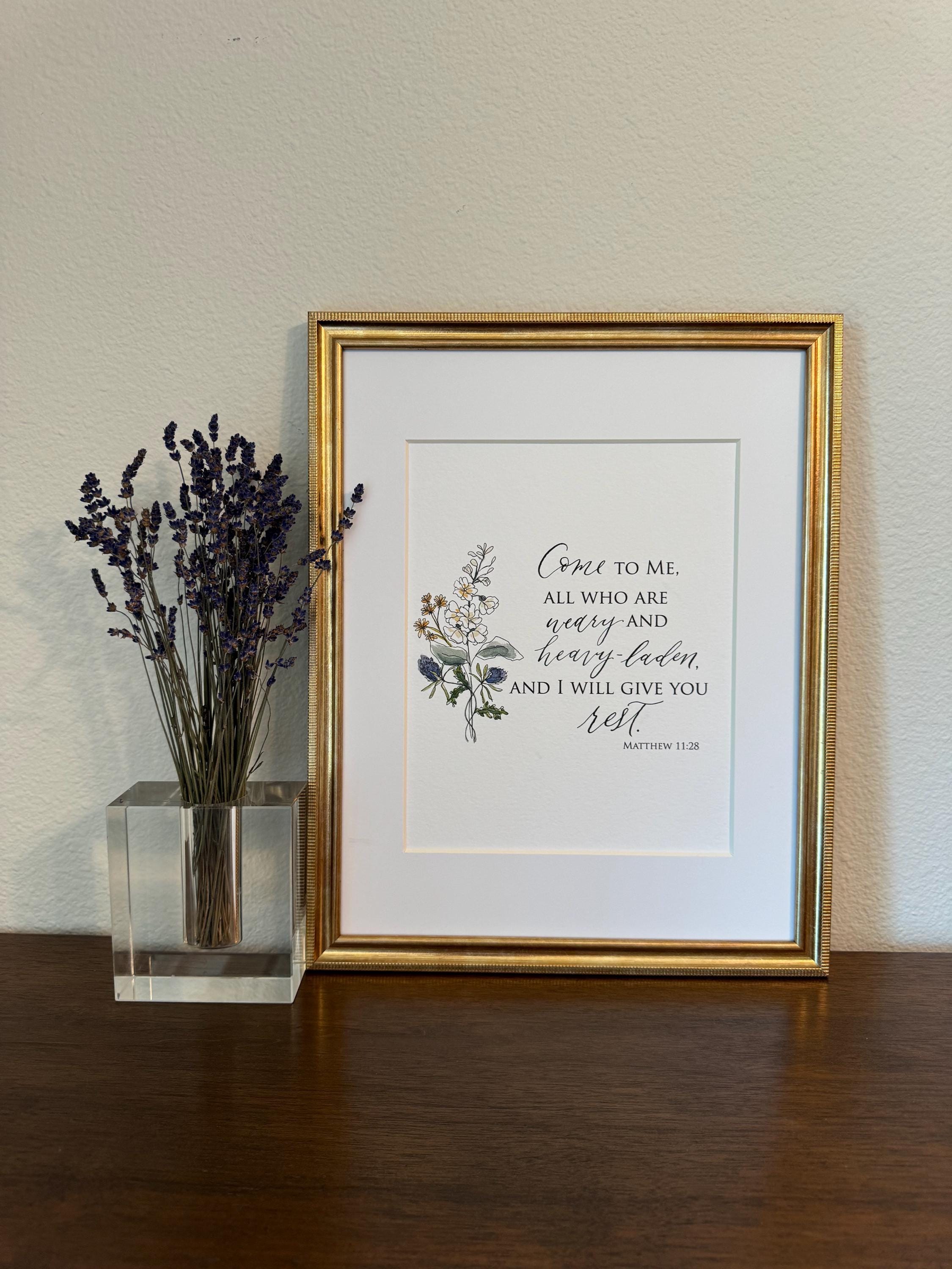 Matthew 11:28 Scripture Print • Calligraphy, Floral Watercolor, Italian Paper