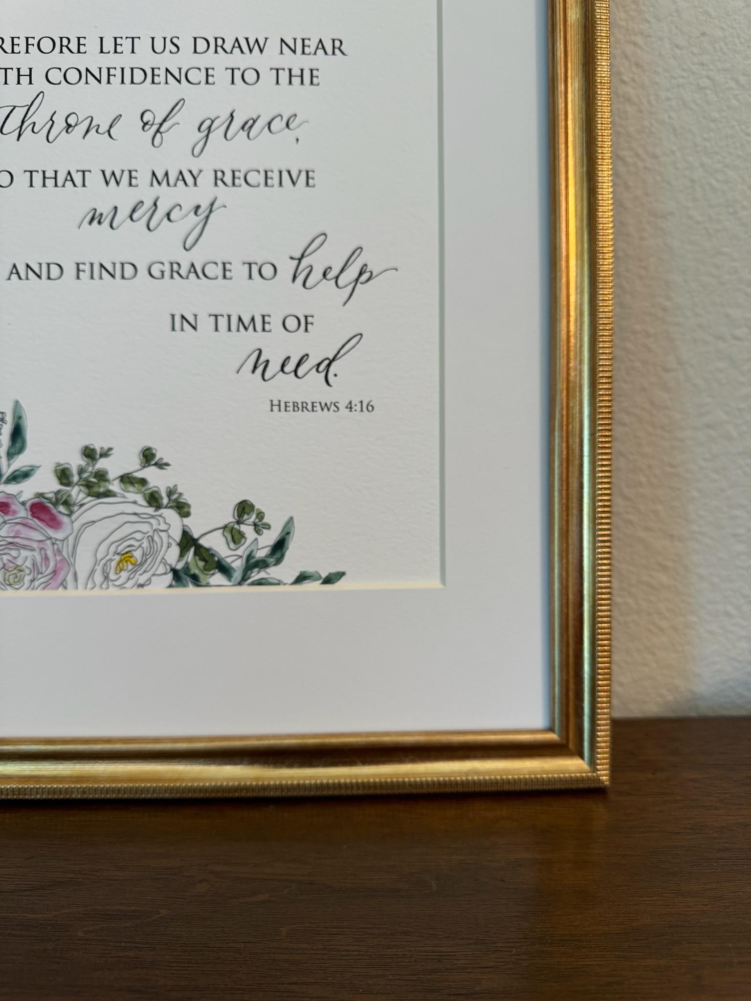 Lara creates our beautiful floral designs using pen & ink and watercolors. Melisa uses dip pen calligraphy to write the Scripture. We bring the two together and print them on textured Italian cotton-content paper that closely resembles the textured feel of watercolor paper. The end product is a beautiful floral Scripture print for your home!