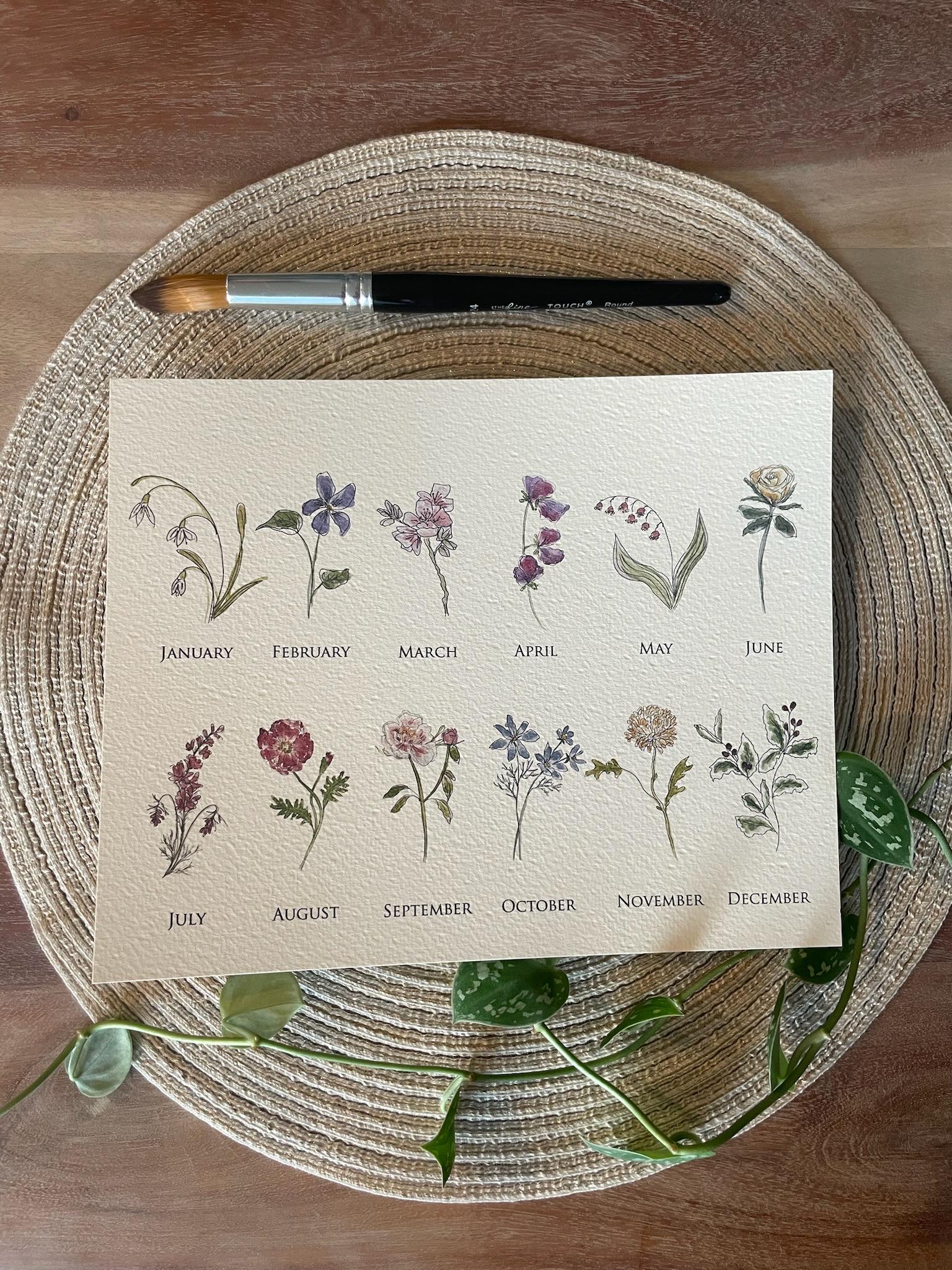 Birth Month Flower Print • Calligraphy, Watercolor Floral Art on Italian Paper