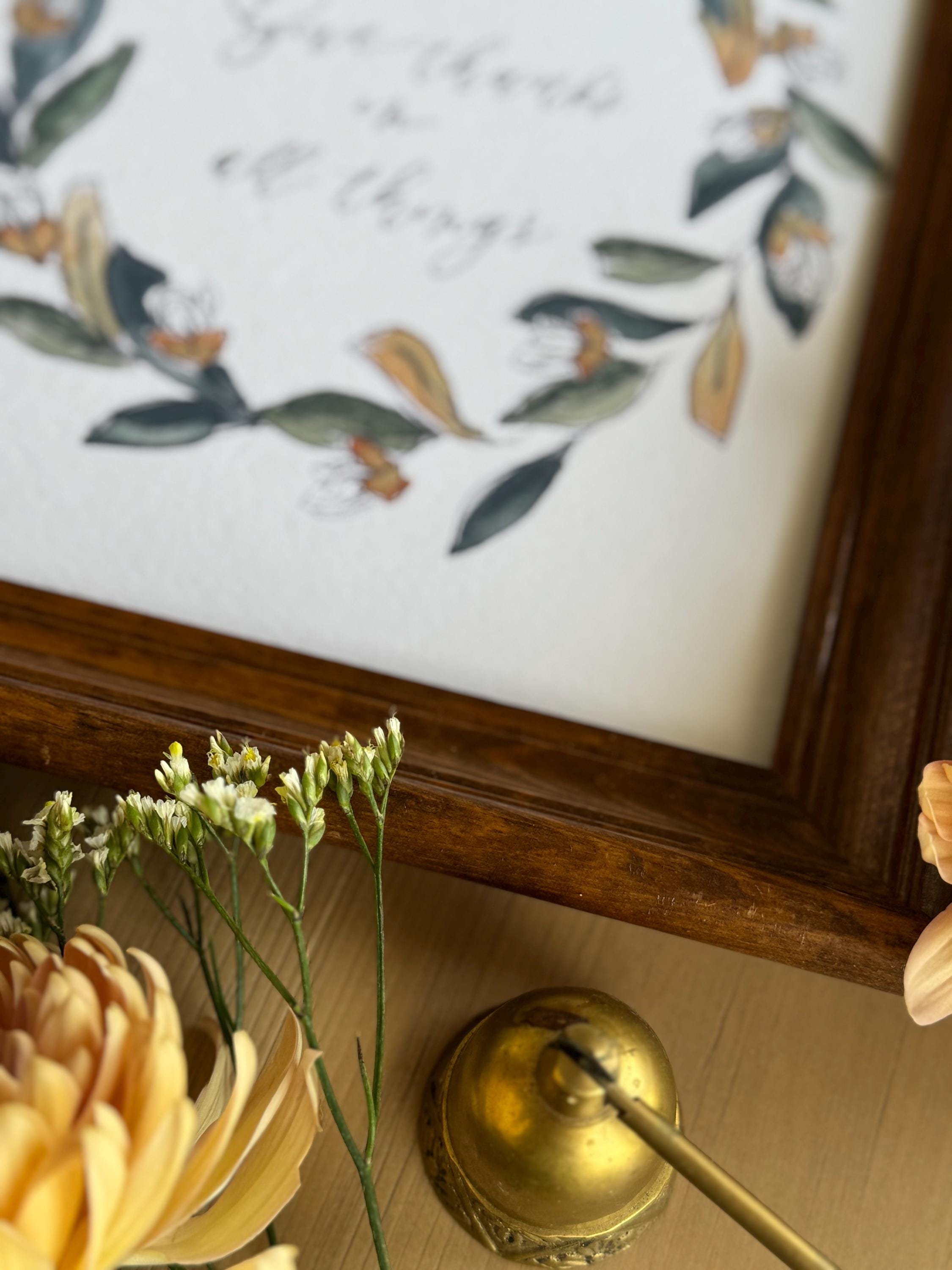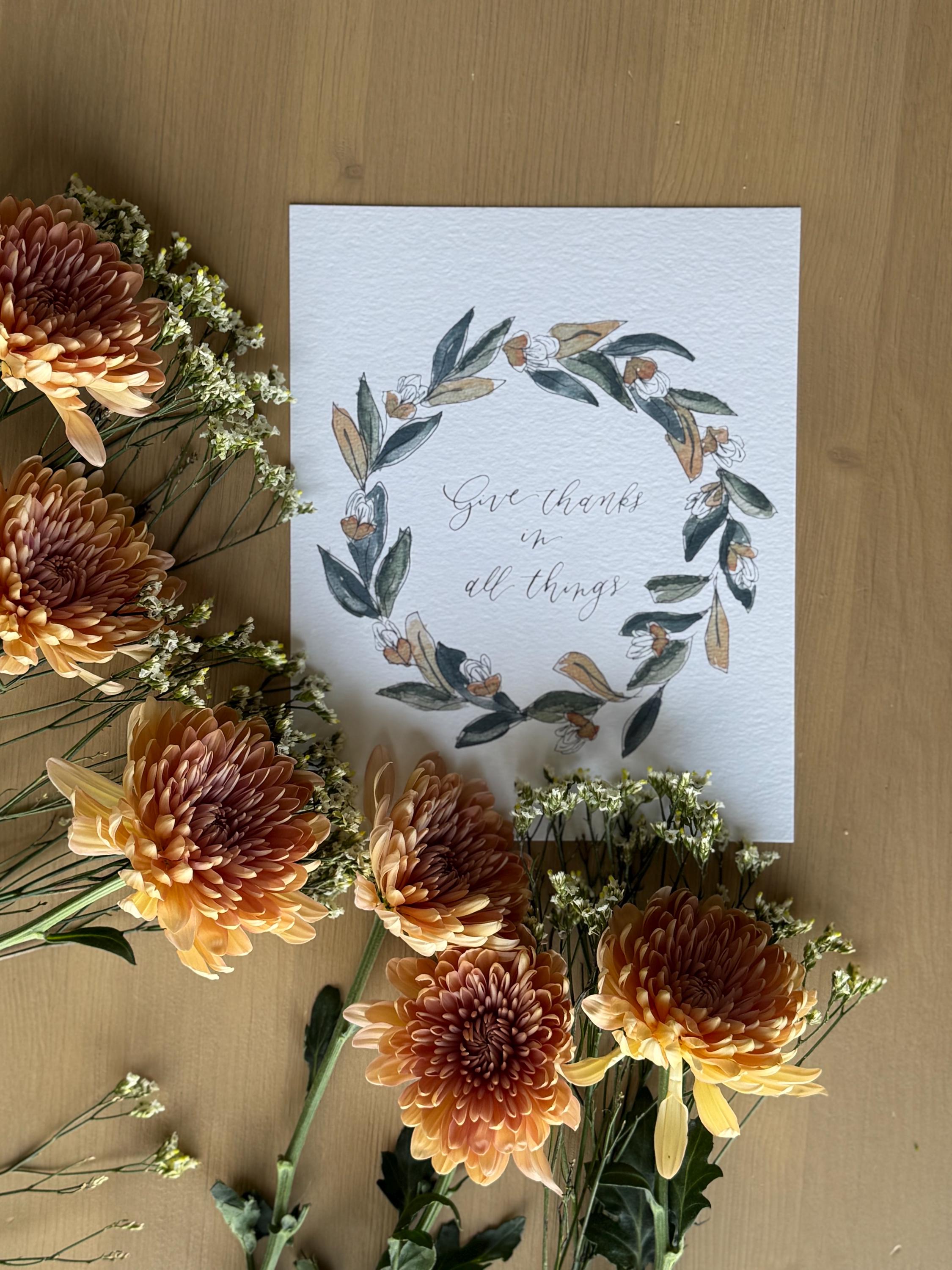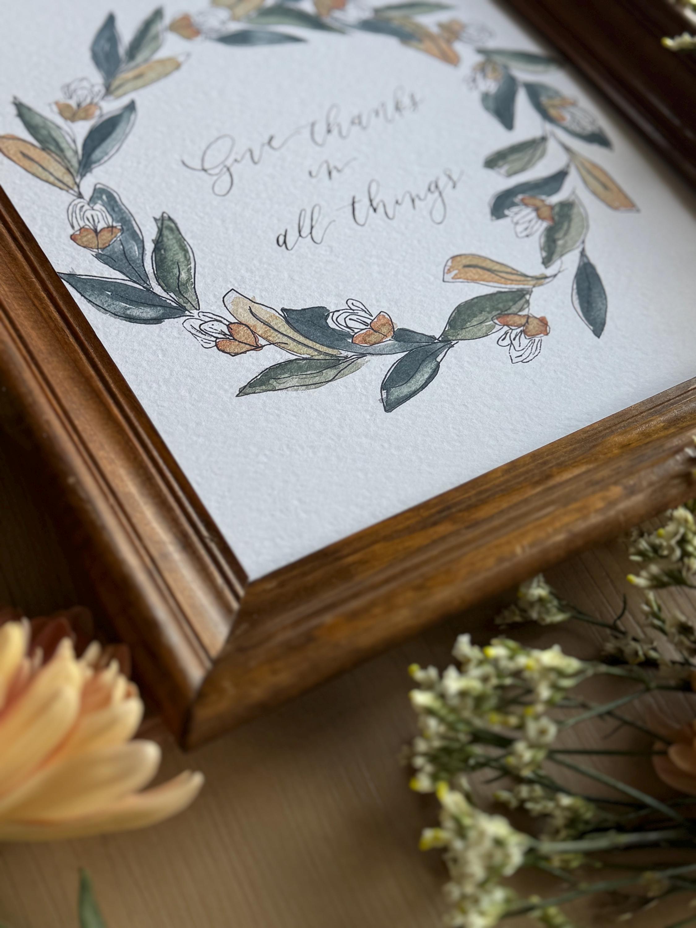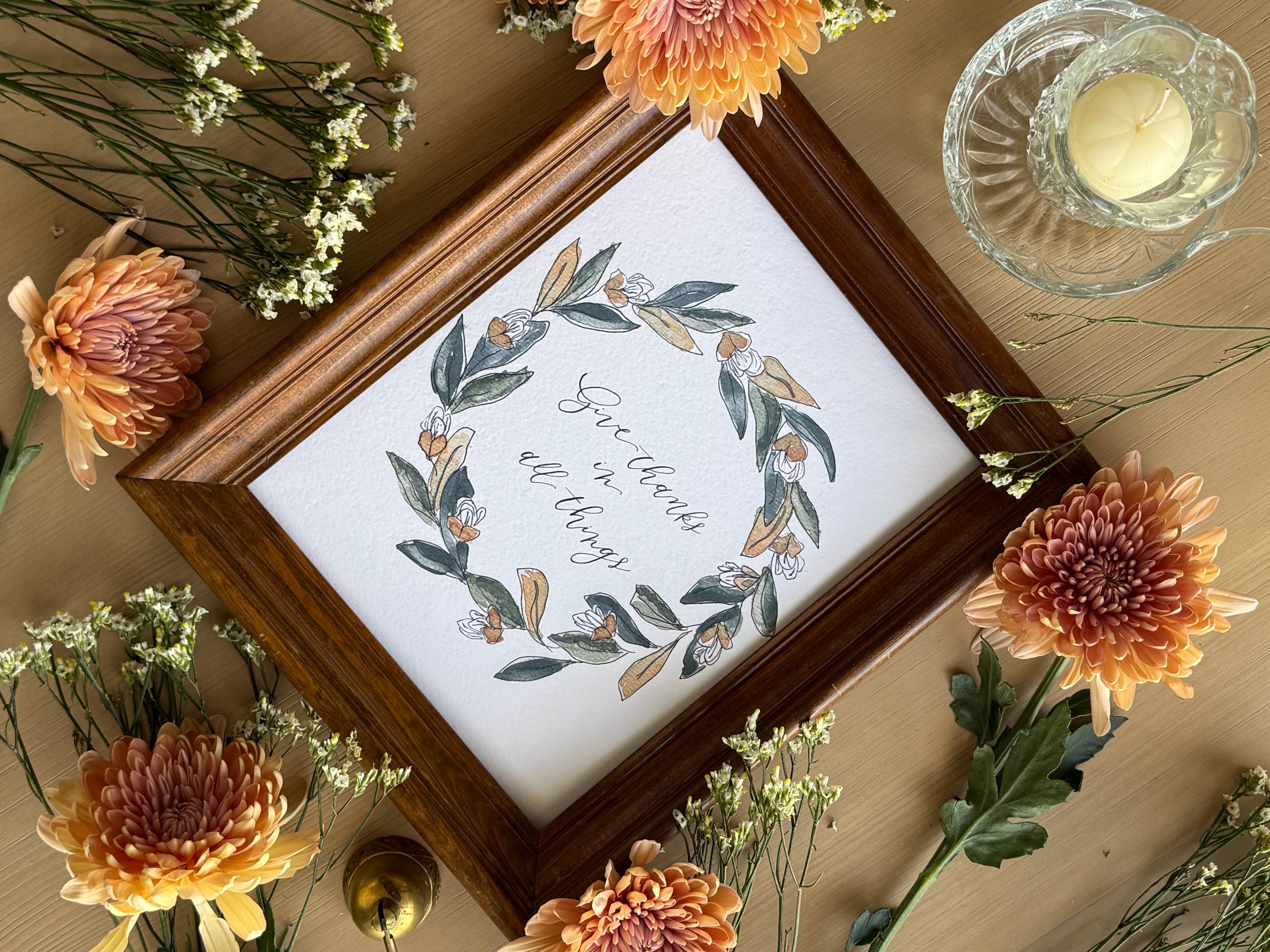 Give Thanks Print • Thanksgiving Calligraphy, Floral Watercolor Art, Italian Paper