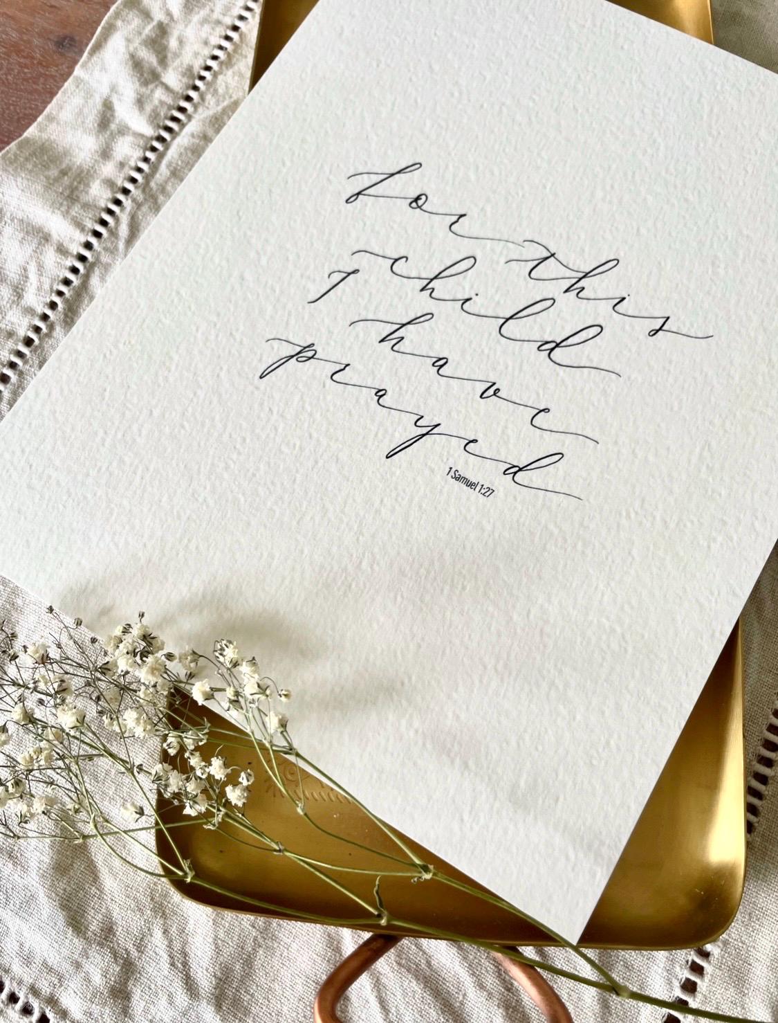 For This Child I Have Prayed • Calligraphy Christian Nursery Art, Italian Cotton Paper