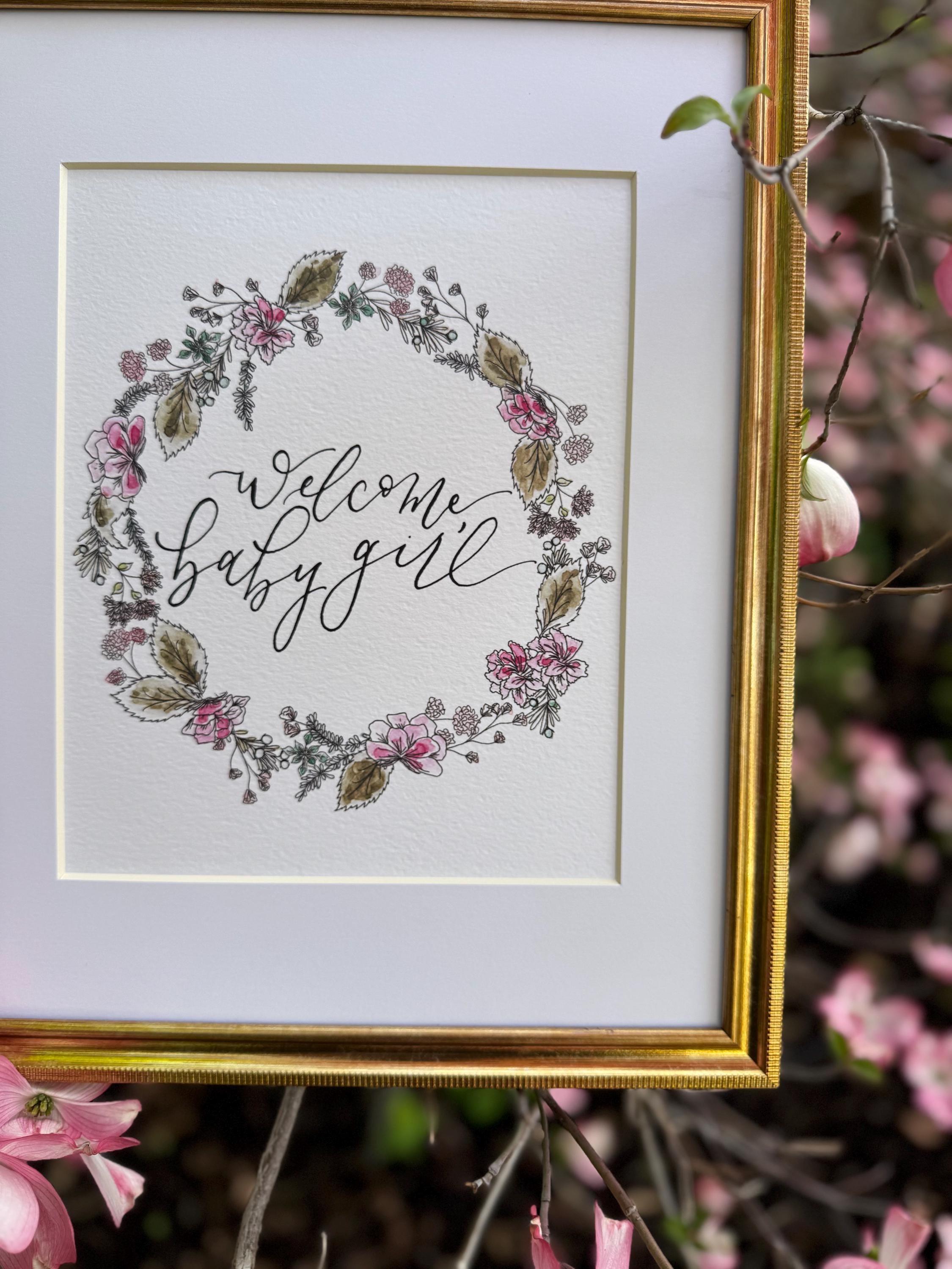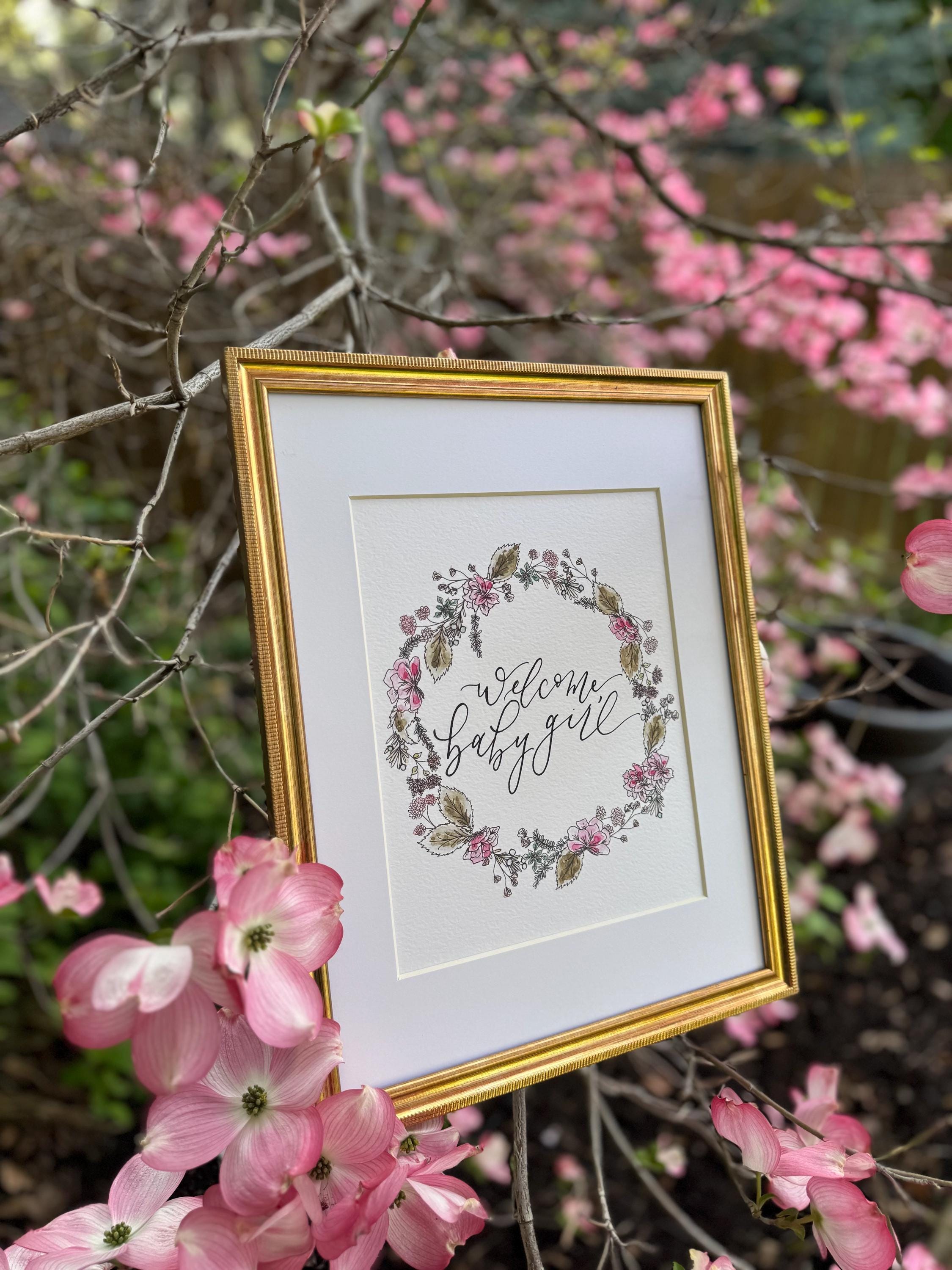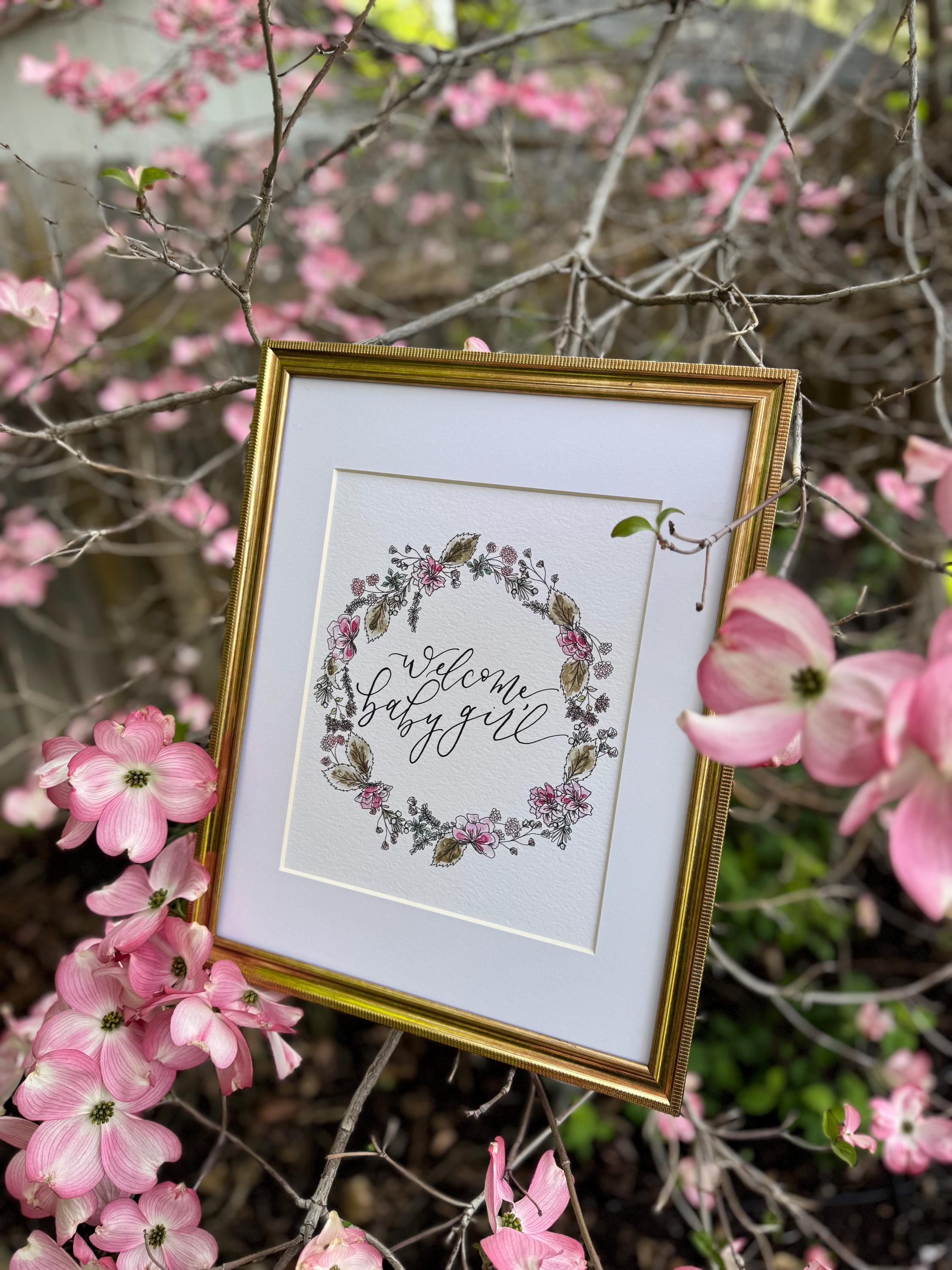 Welcome Baby Girl Print • Calligraphy, Pink Watercolor Floral Wreath, Italian Paper