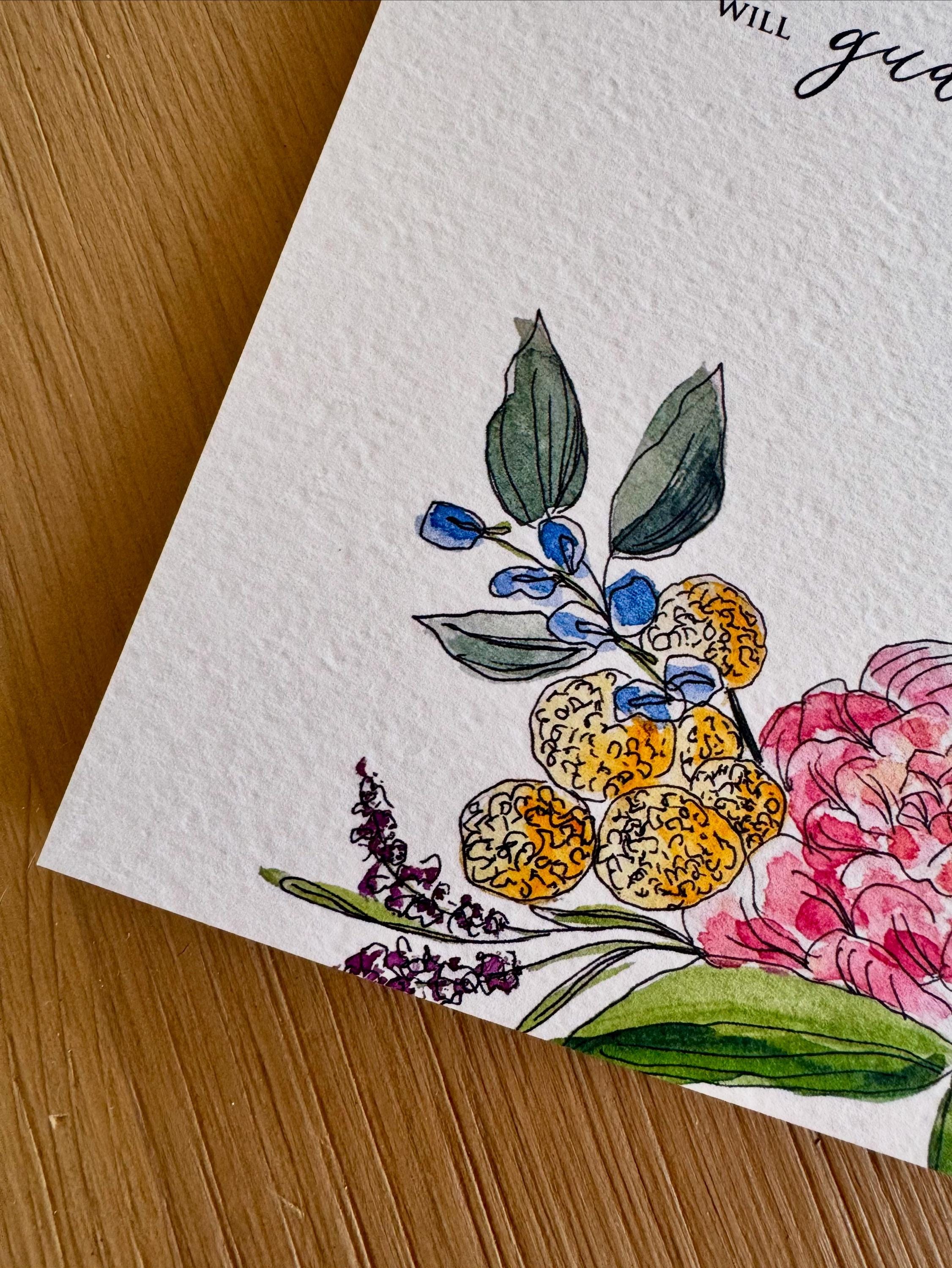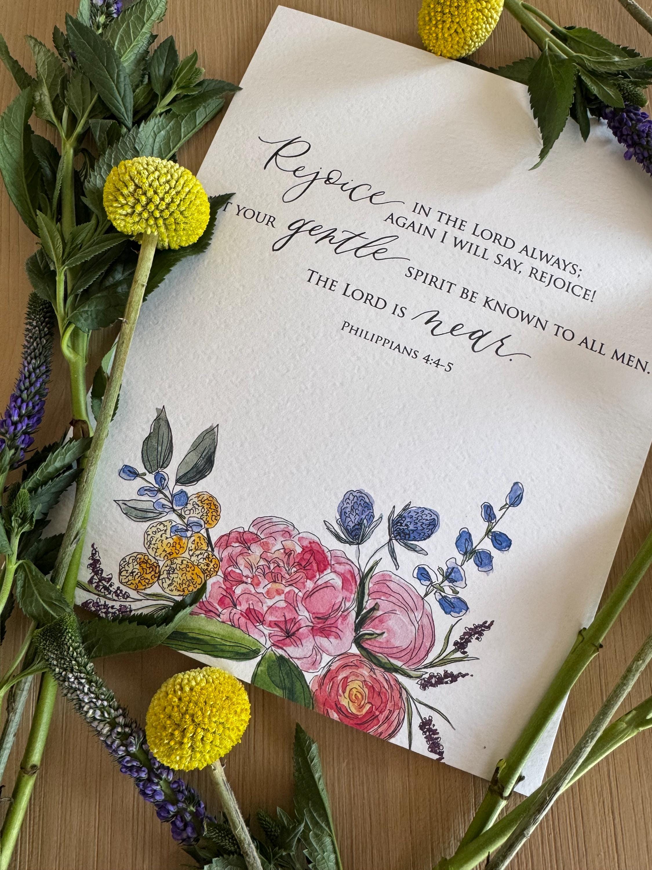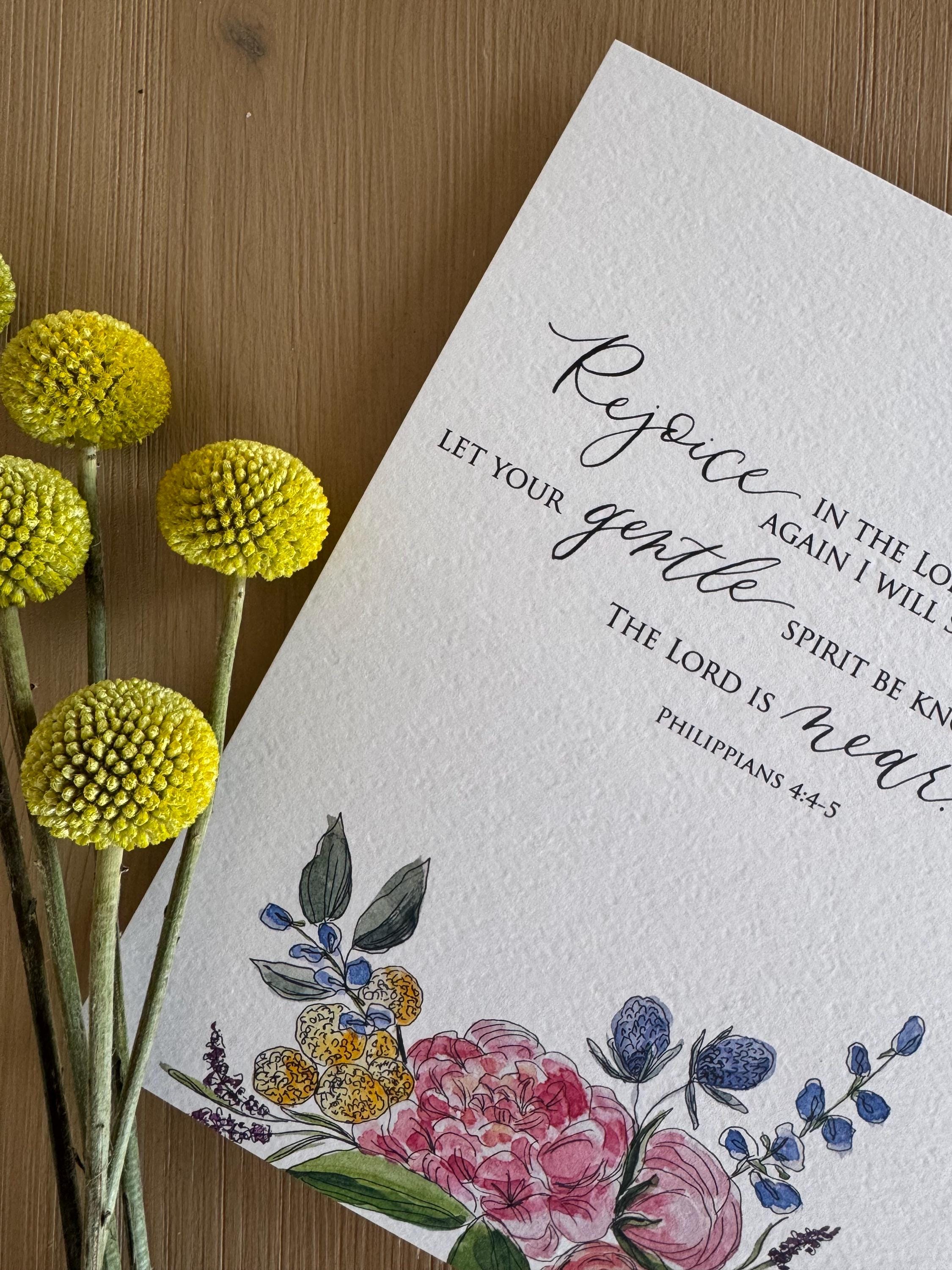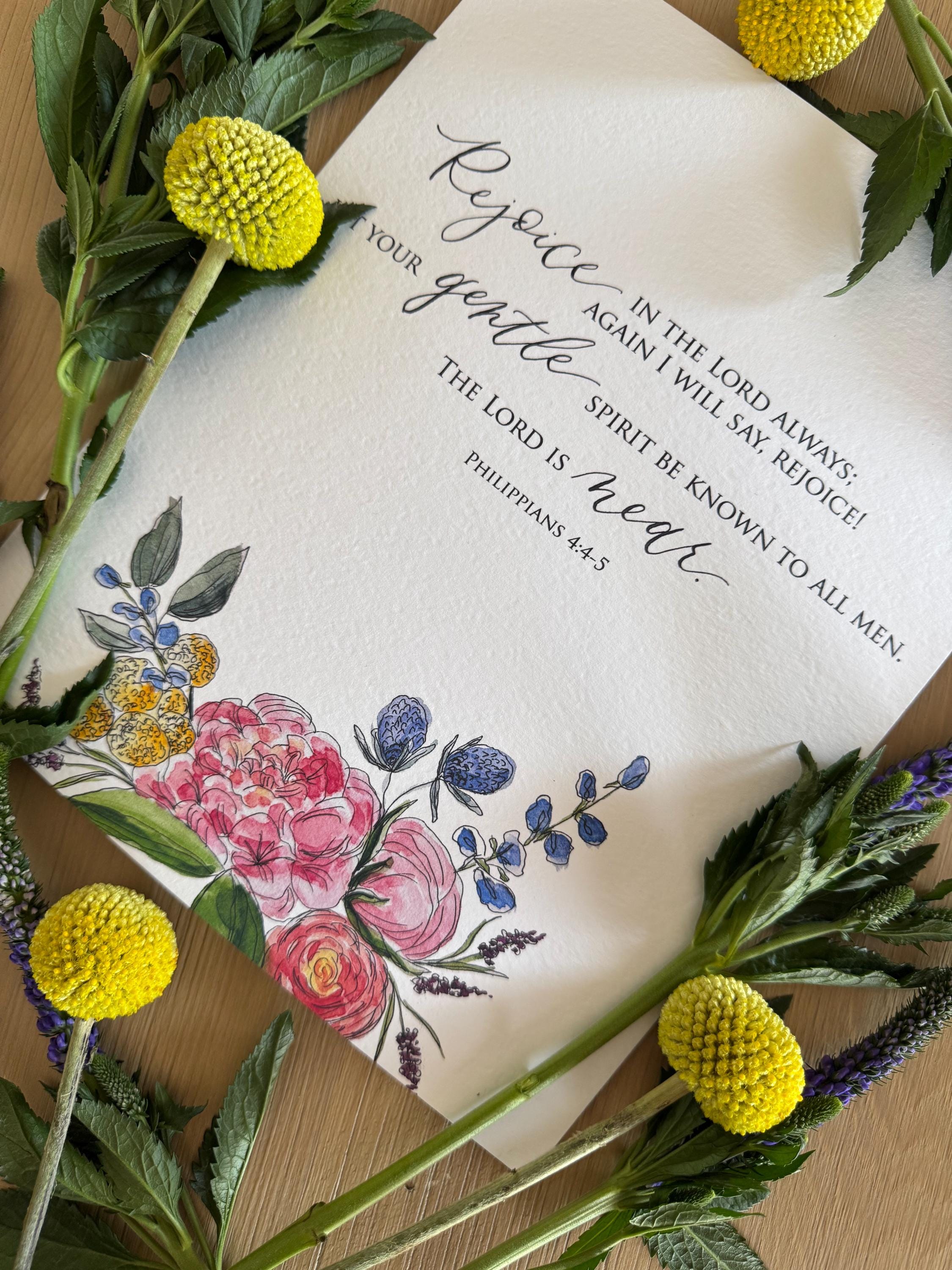 Lara creates our beautiful floral designs using pen & ink and watercolors. Melisa uses dip pen calligraphy to write the Scripture. We bring the two together and print them on textured Italian cotton-content paper that closely resembles the textured feel of watercolor paper. The end product is a beautiful floral Scripture print for your home!