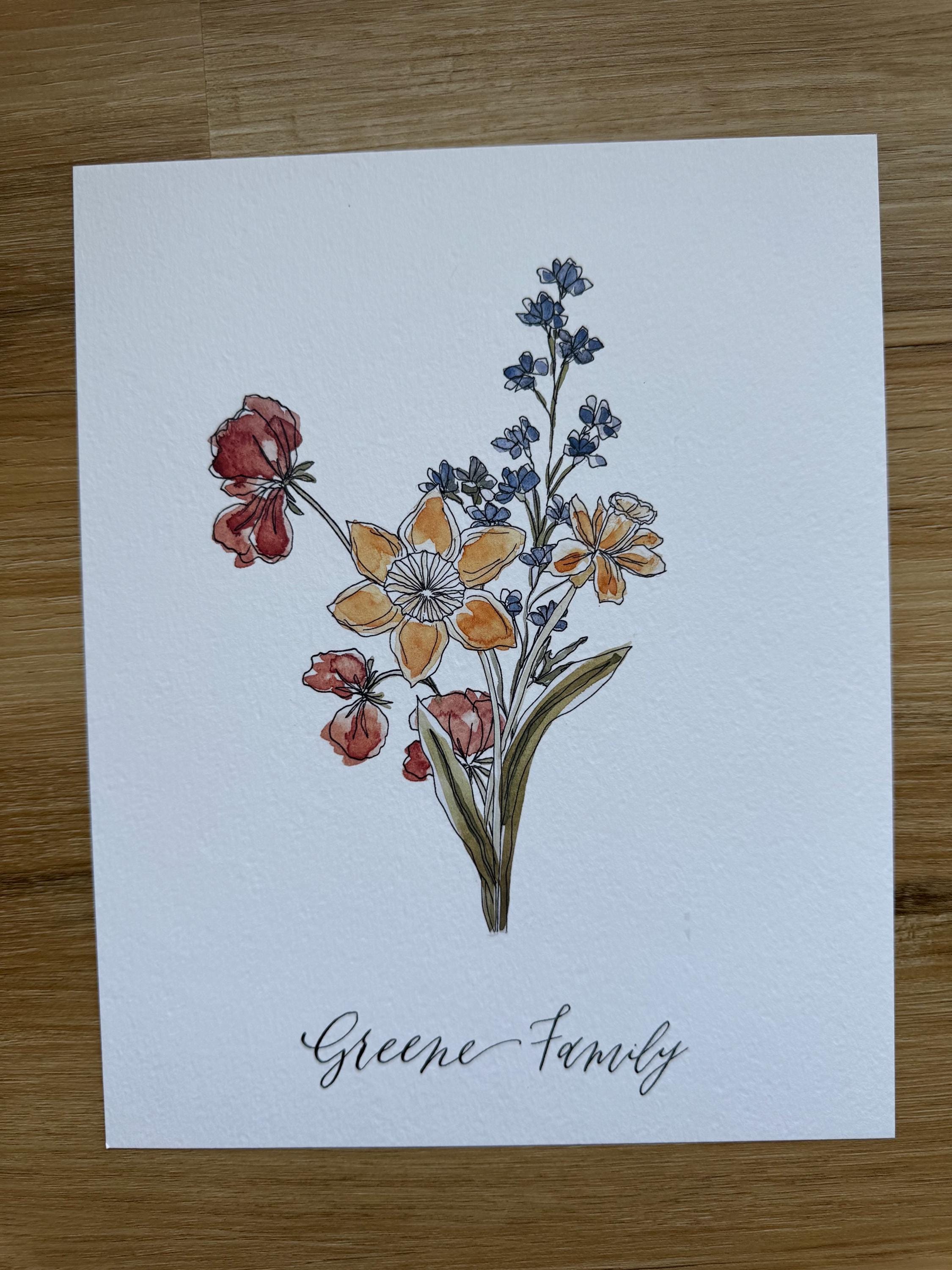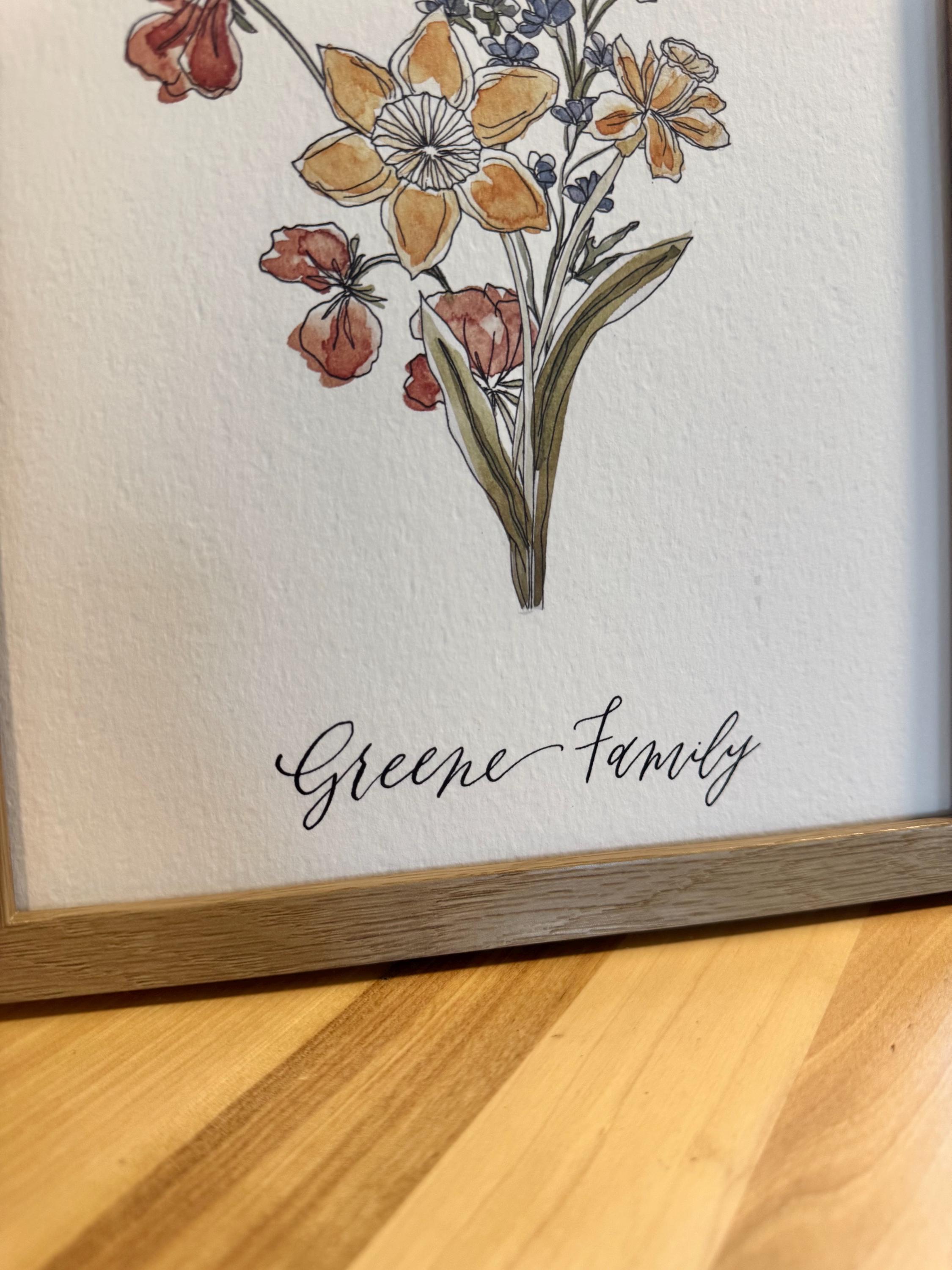 Custom birth month floral bouquet with 3-15 flowers and your family’s last name in calligraphy