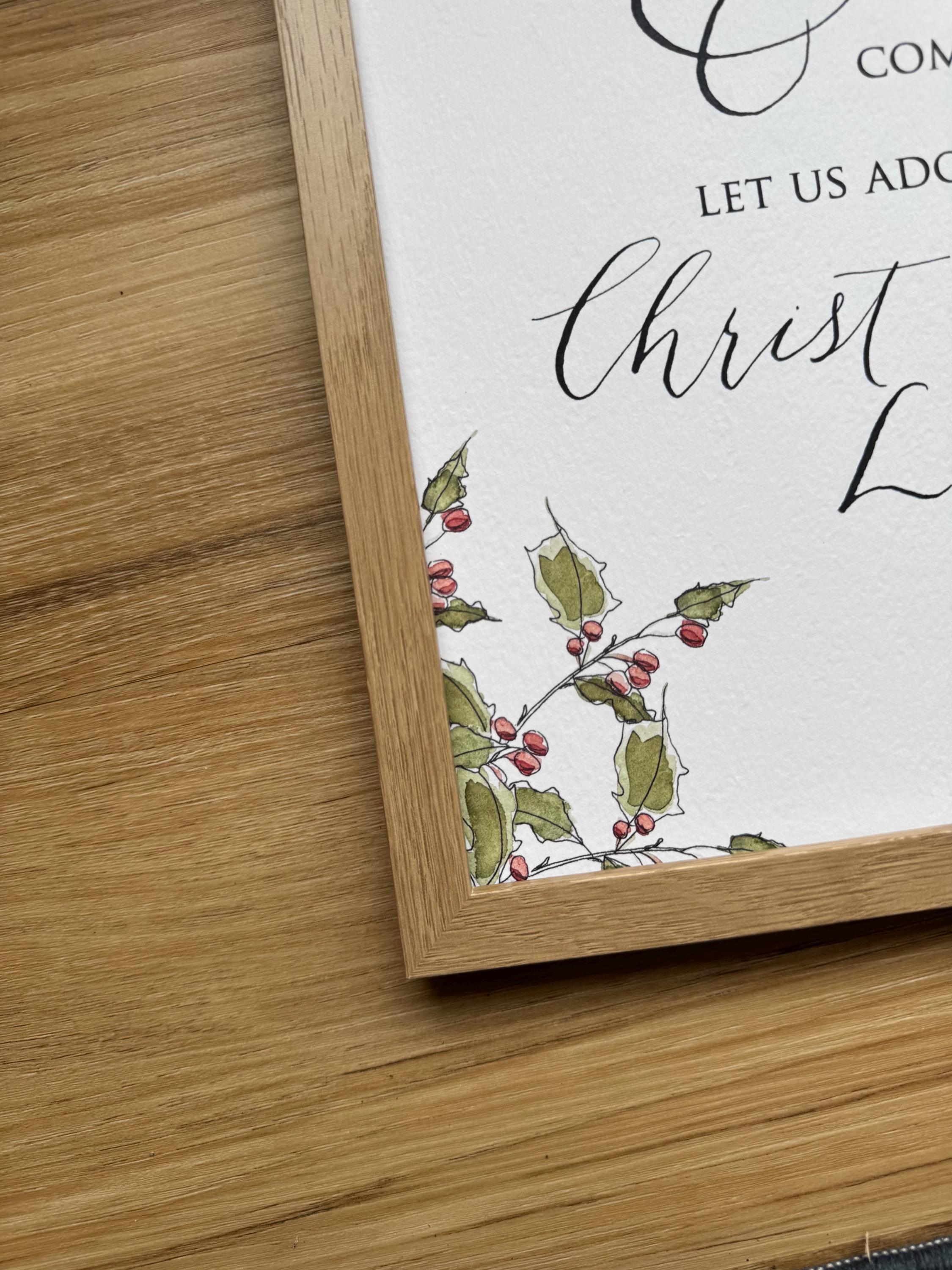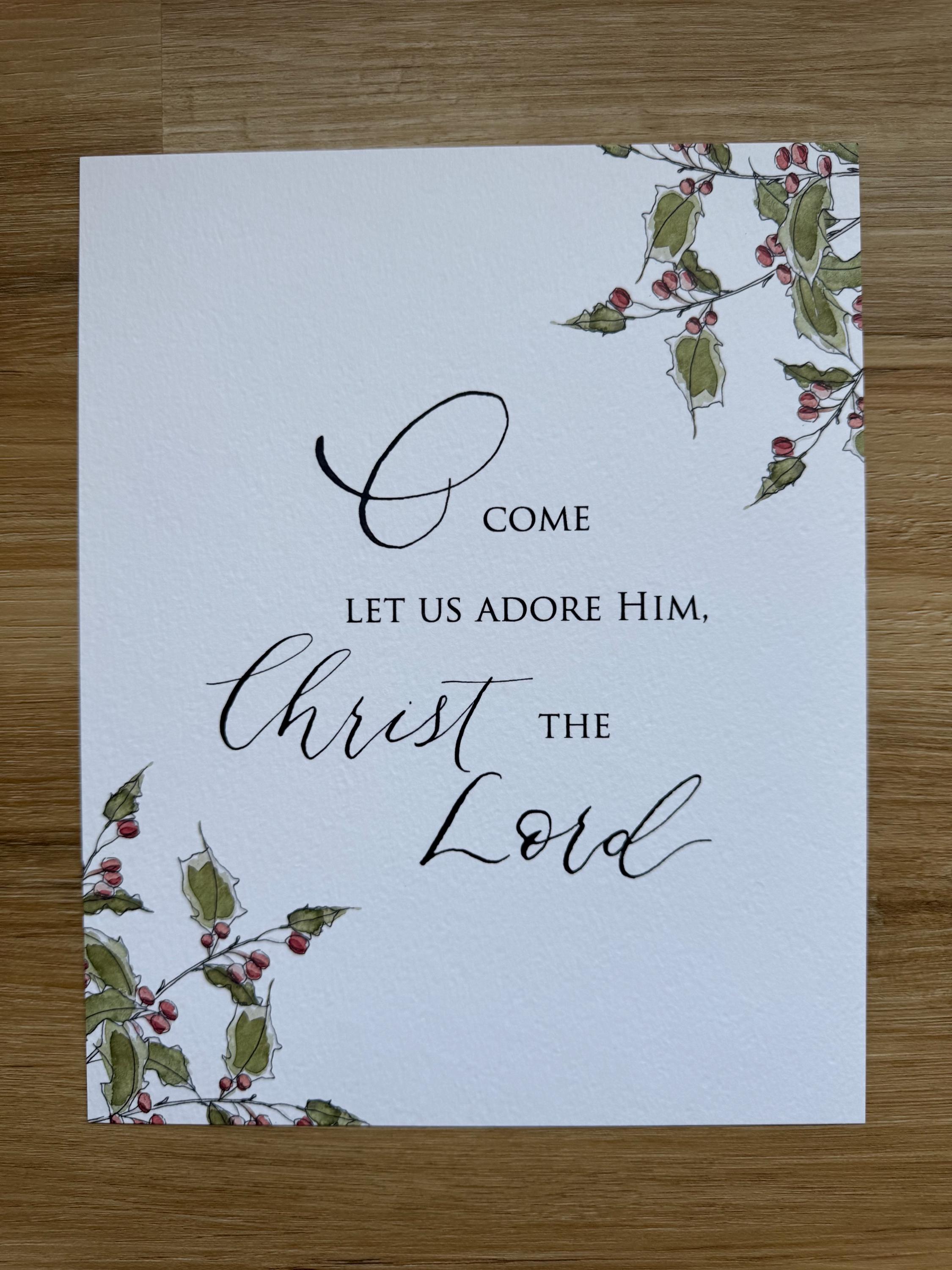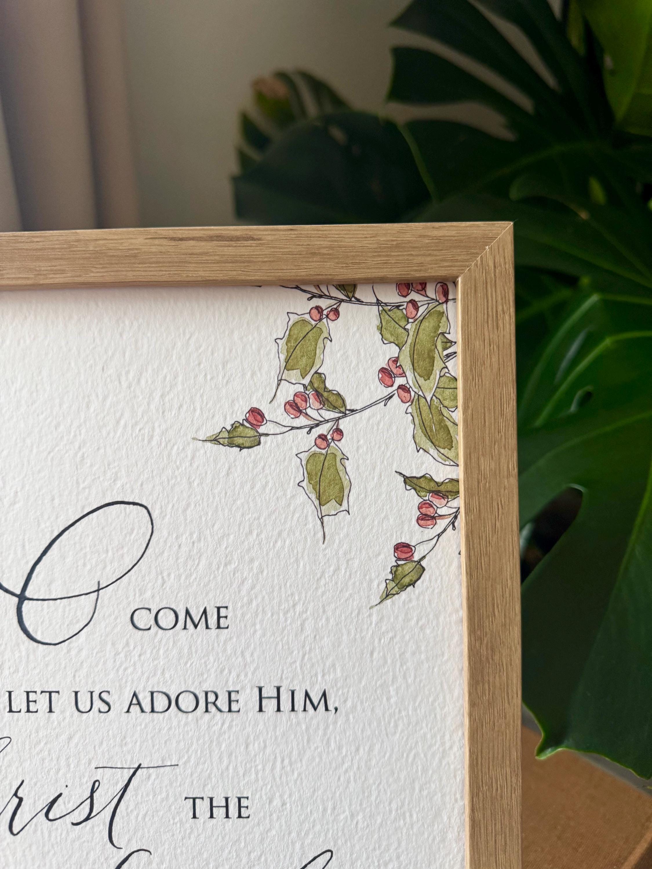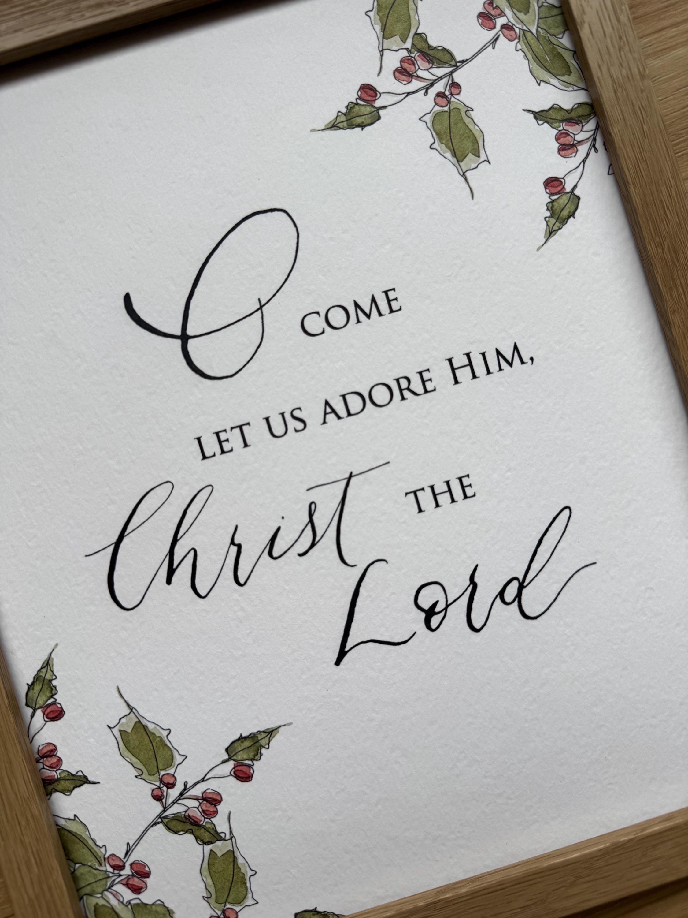 O Come Let Us Adore Him Christmas Print • Calligraphy, Floral Watercolor, Italian Paper