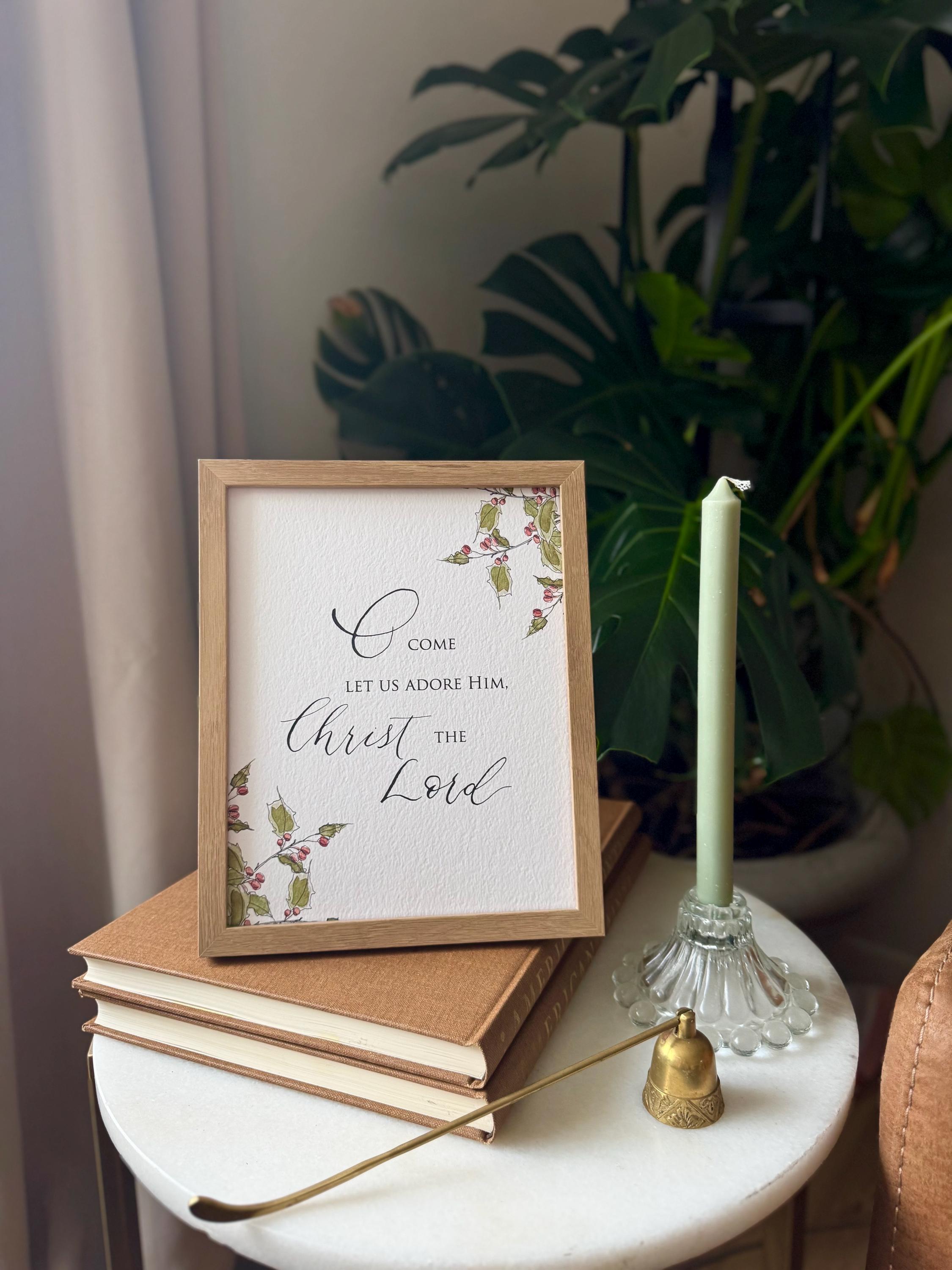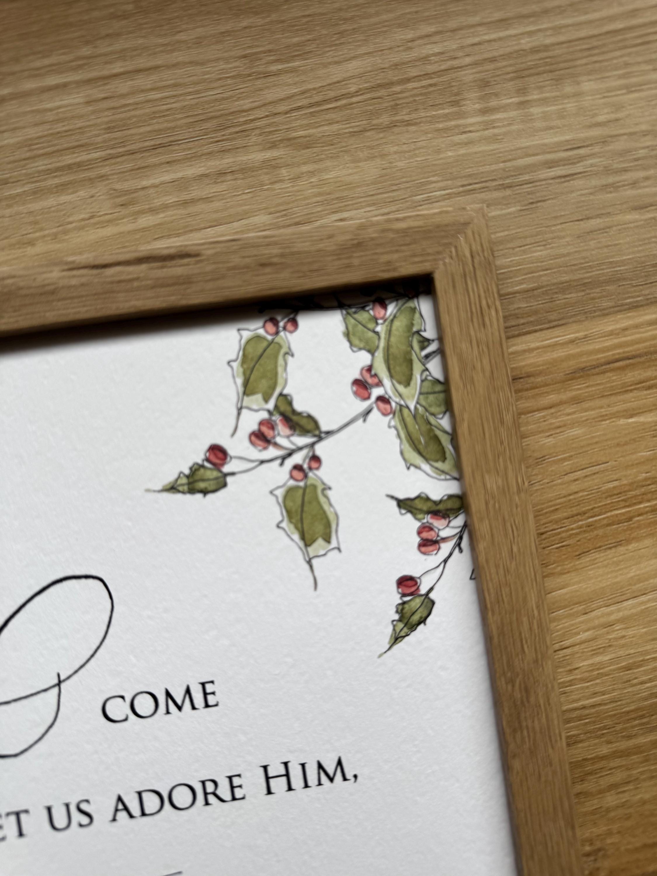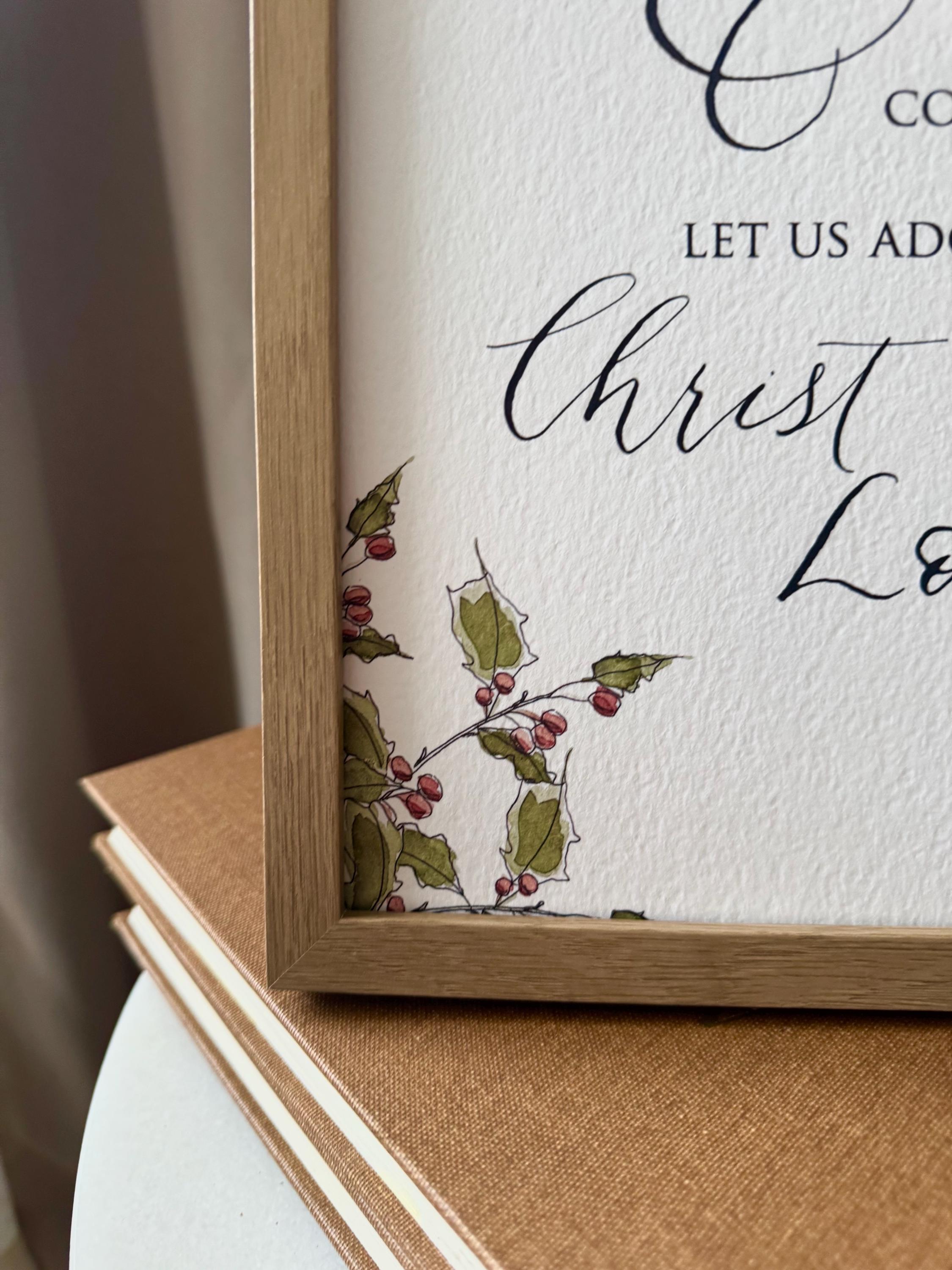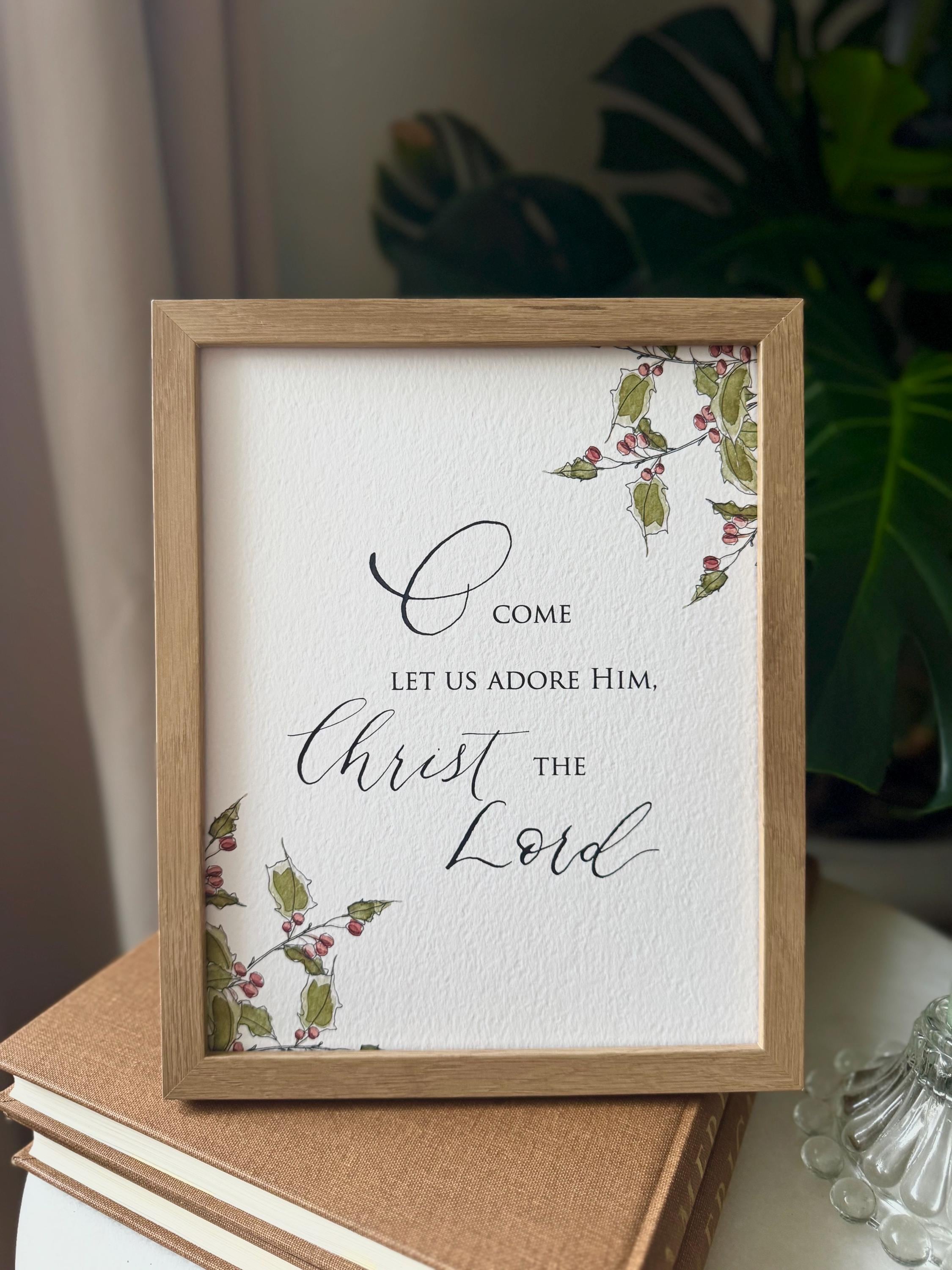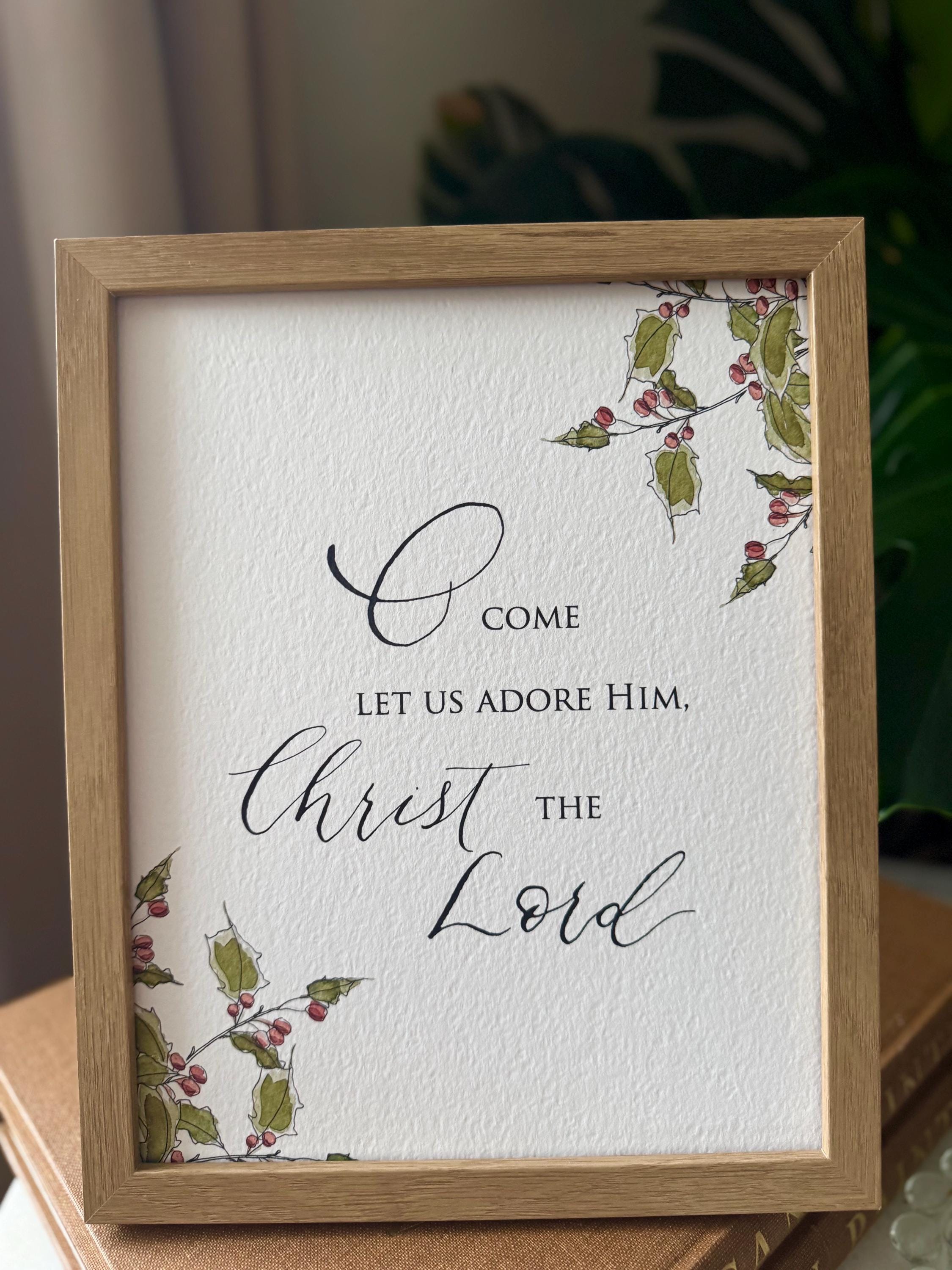 O Come Let Us Adore Him Christmas Print • Calligraphy, Floral Watercolor, Italian Paper
