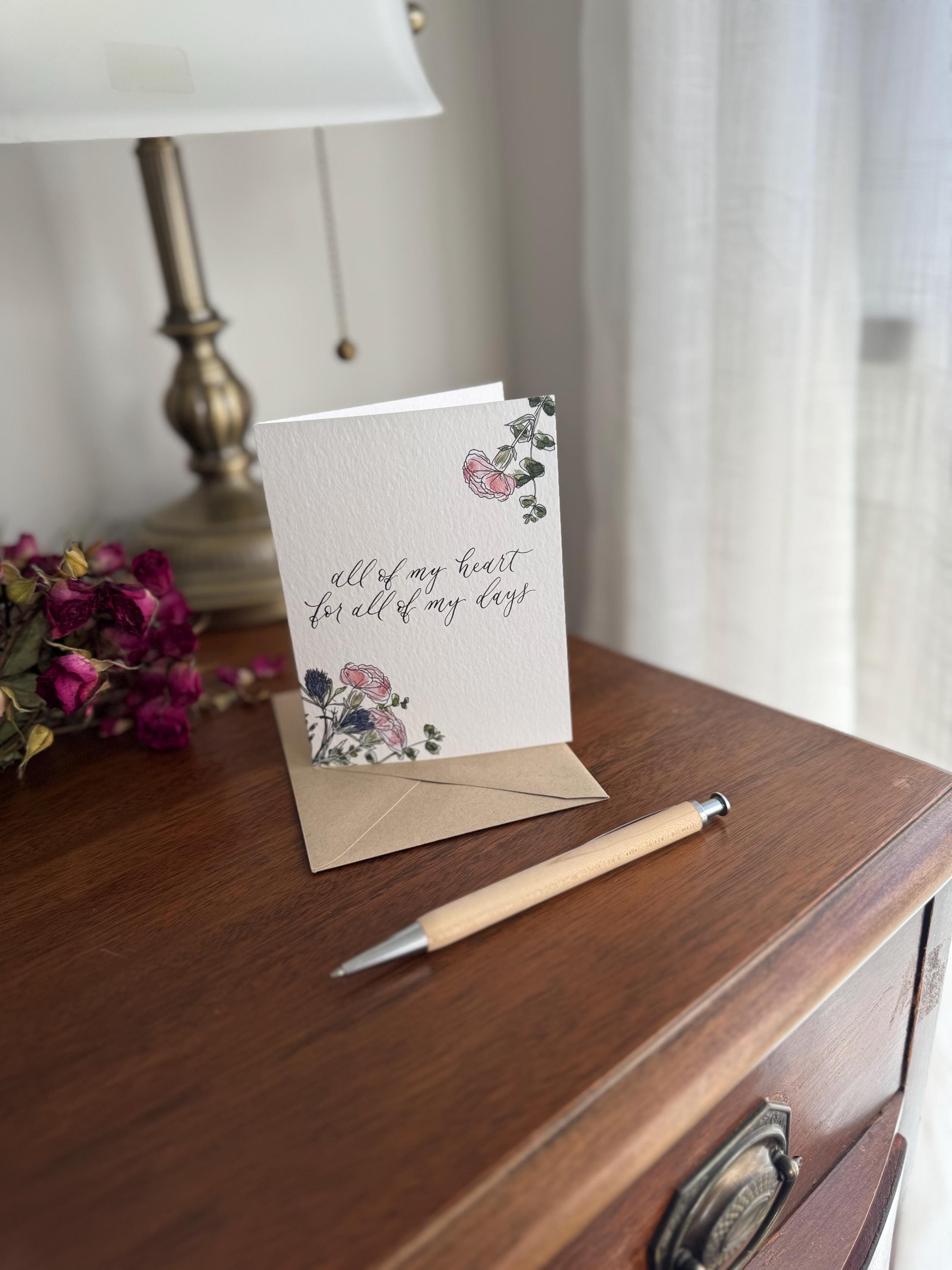 One 4.25x5.5” card printed on textured Italian paper, slipped into a paper envelope, and carefully packaged in a plastic sleeve