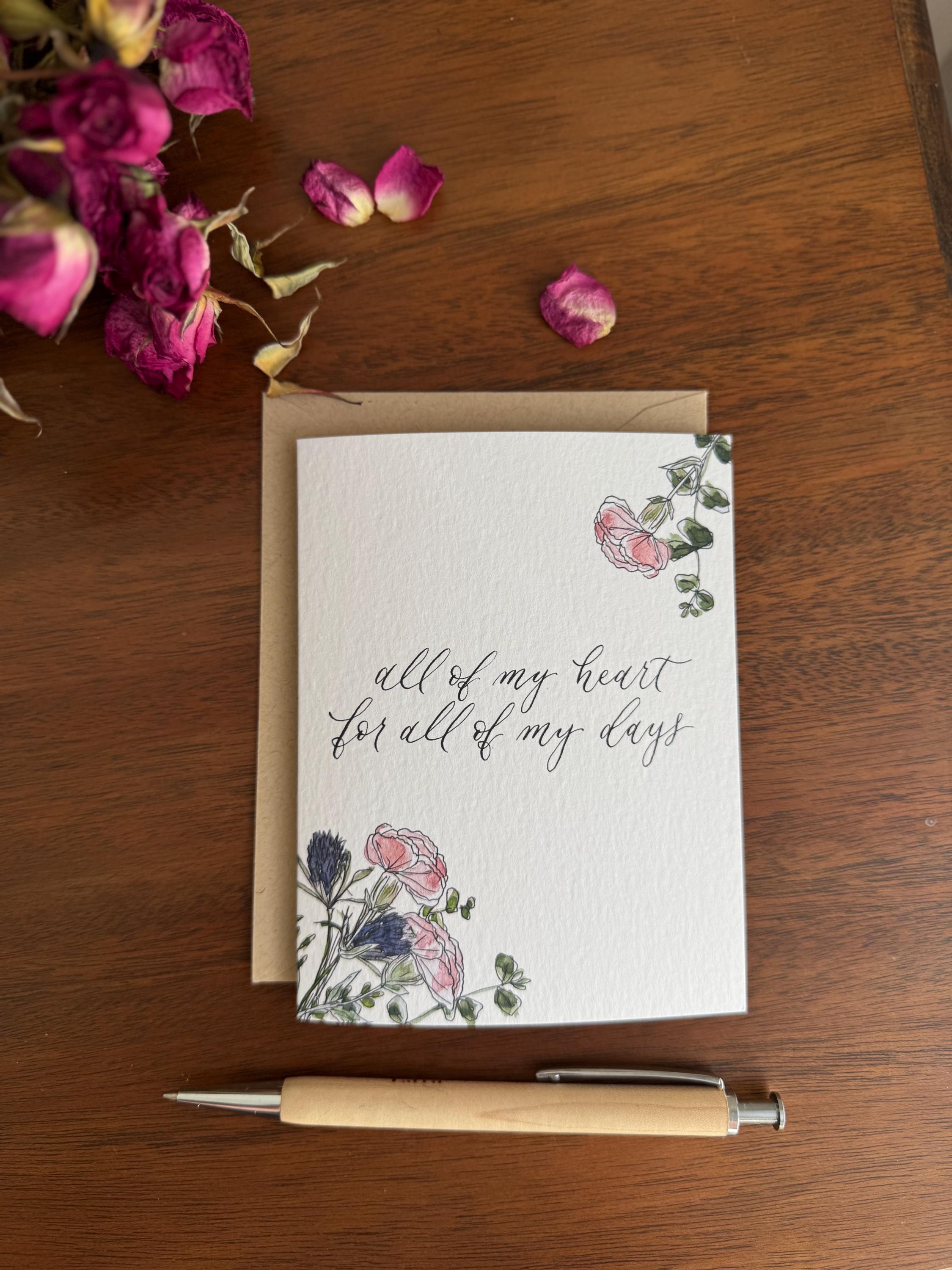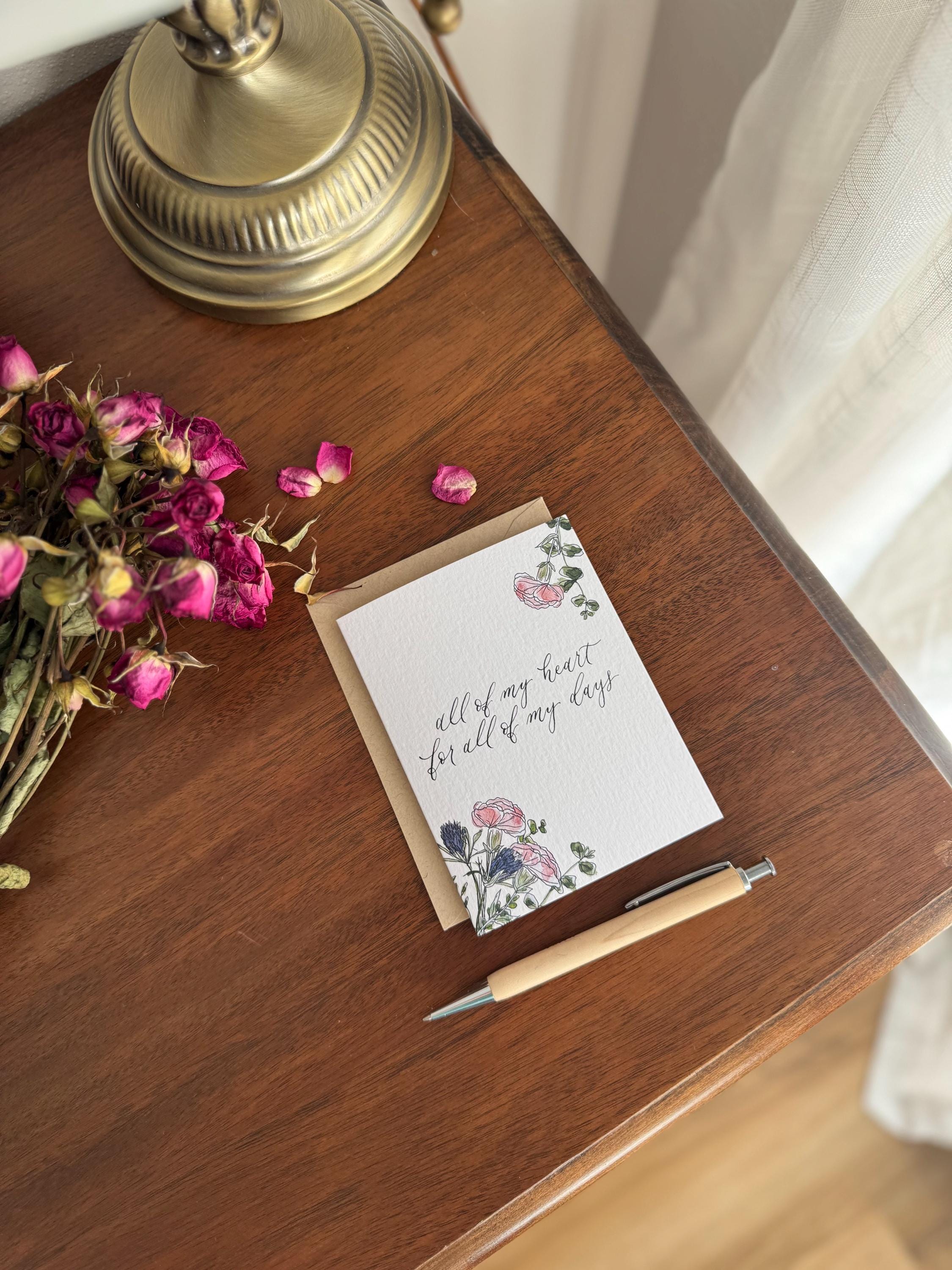 Lara creates our beautiful floral designs using pen & ink and watercolors. Melisa uses dip pen calligraphy to write the Scripture. We bring the two together and print them on textured Italian cotton-content paper that closely resembles the textured feel of watercolor paper. The end product is a beautiful floral Scripture print for your home!