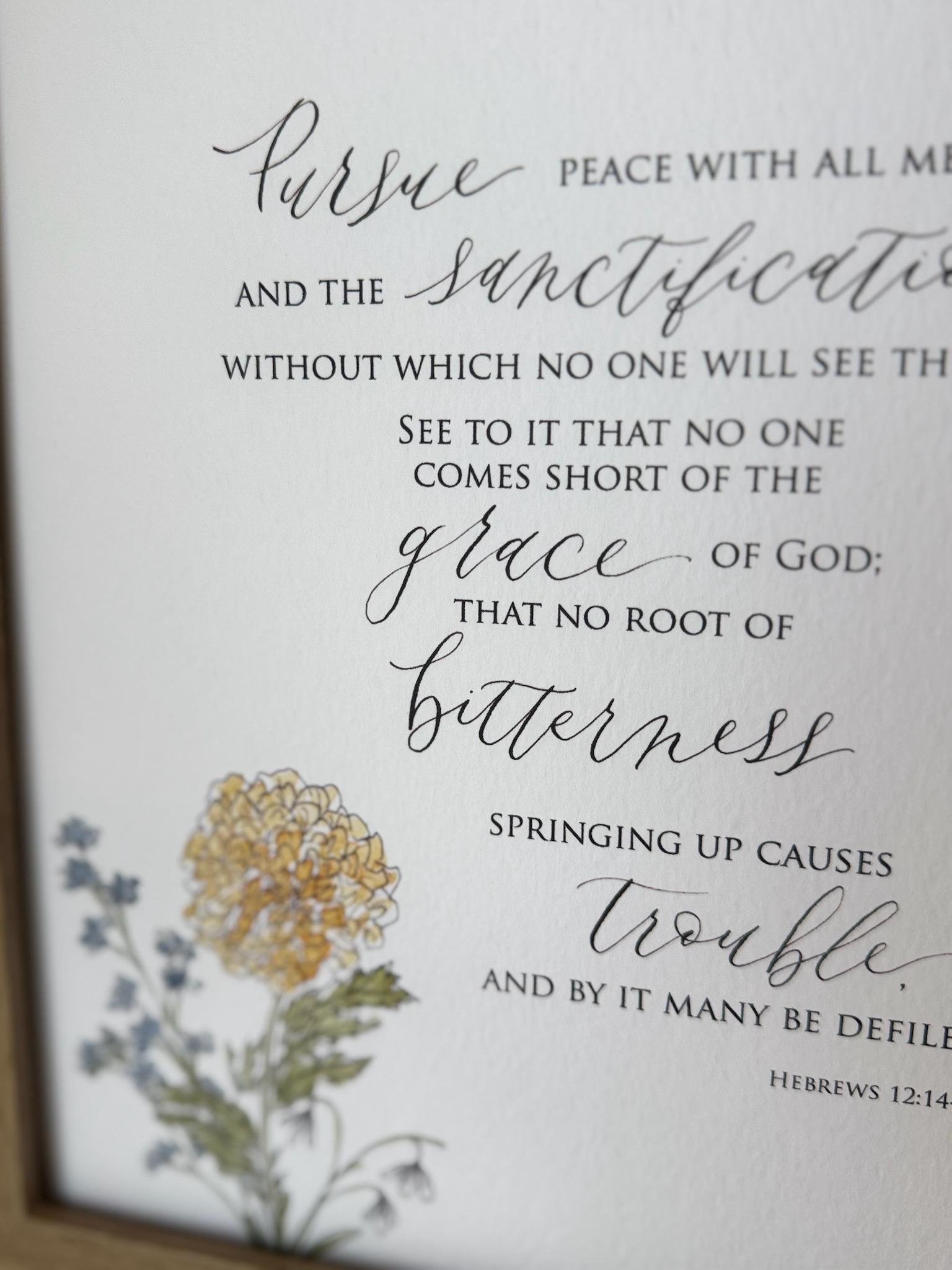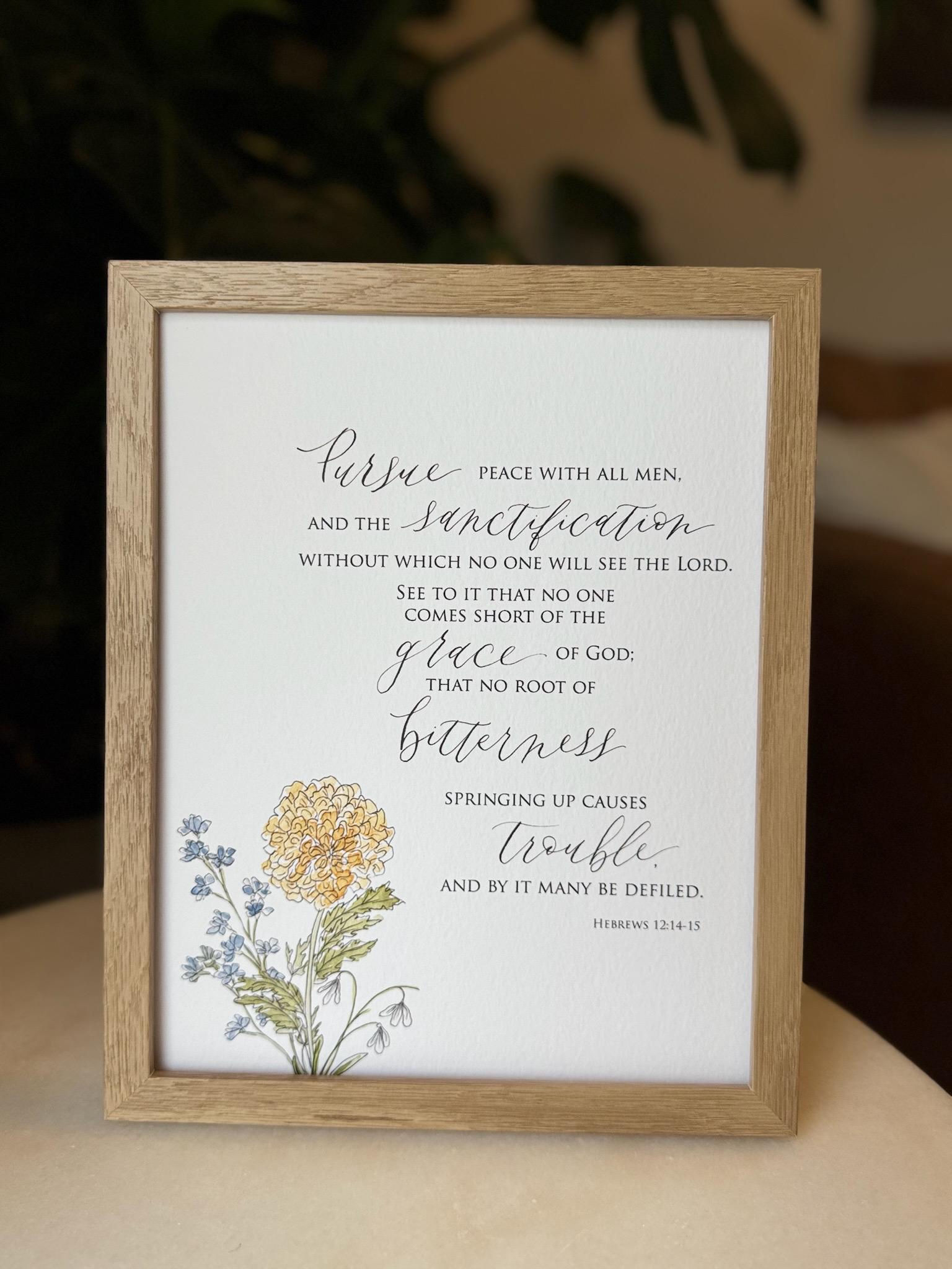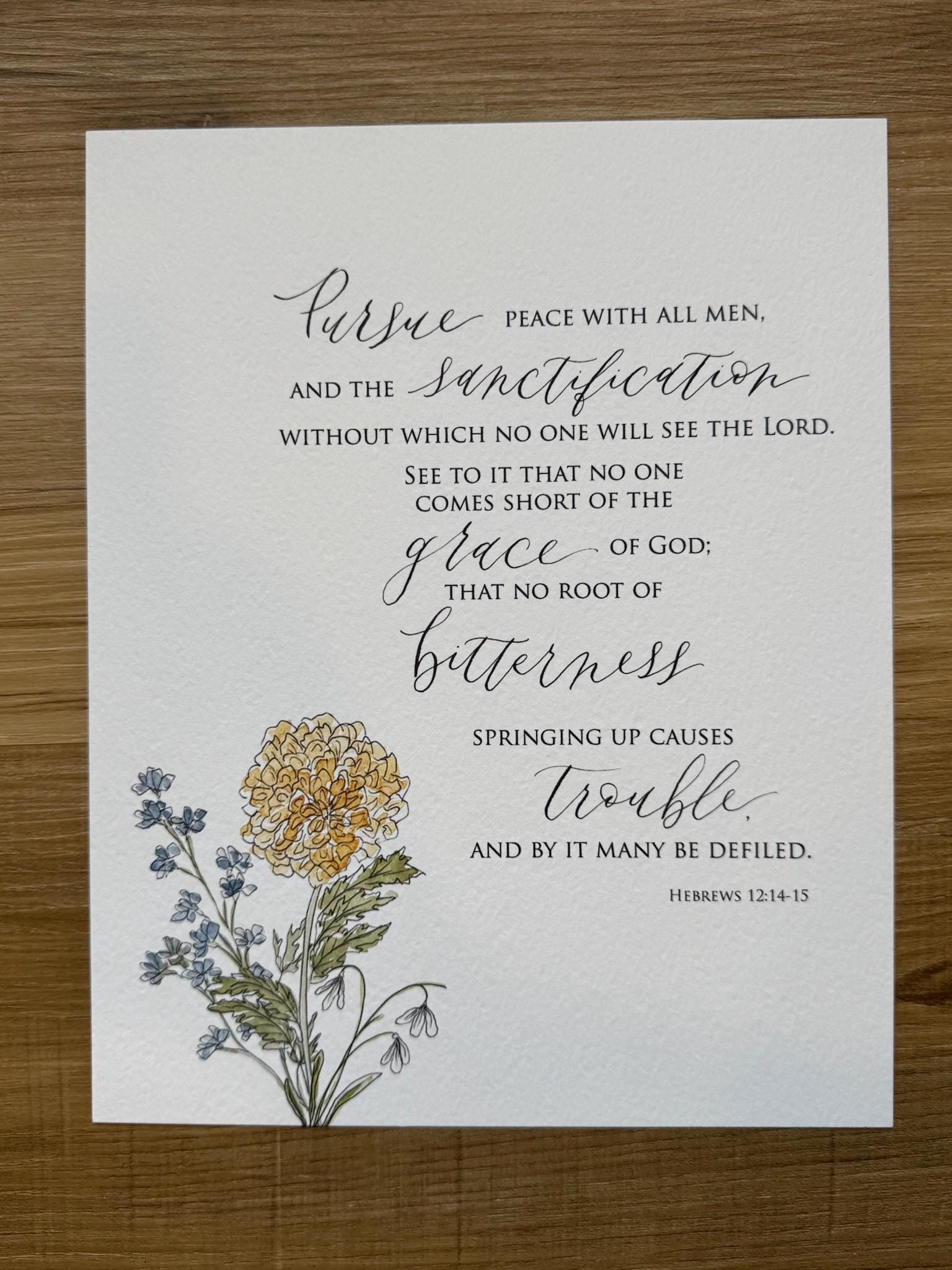 Hebrews 12:14-16 Scripture Print • Calligraphy, Floral Watercolor, Italian Paper
