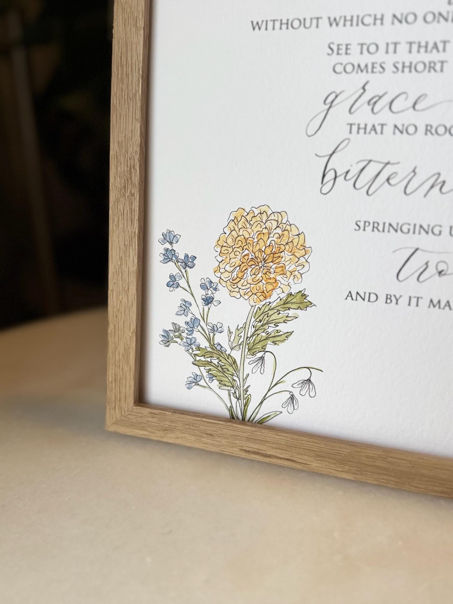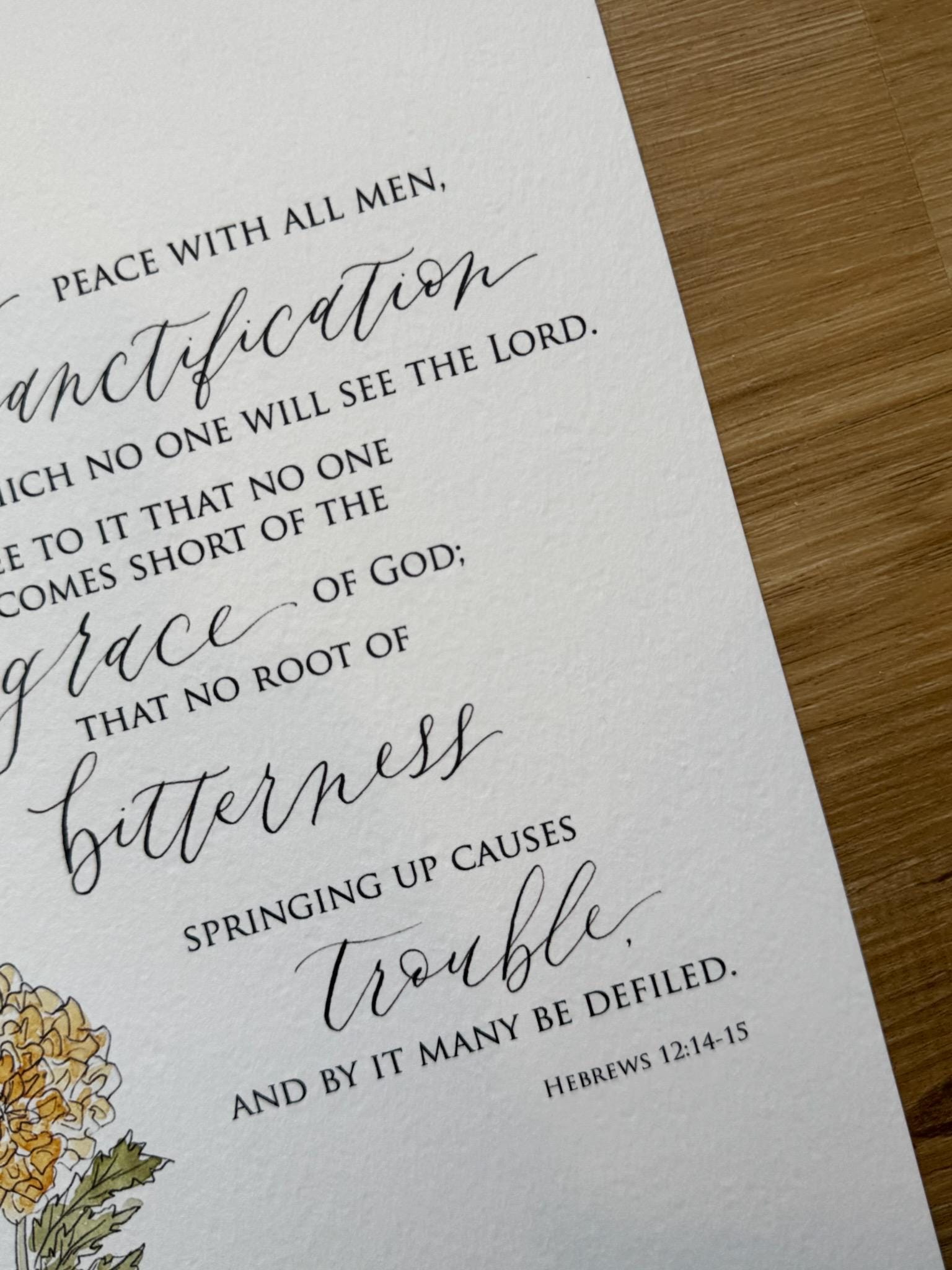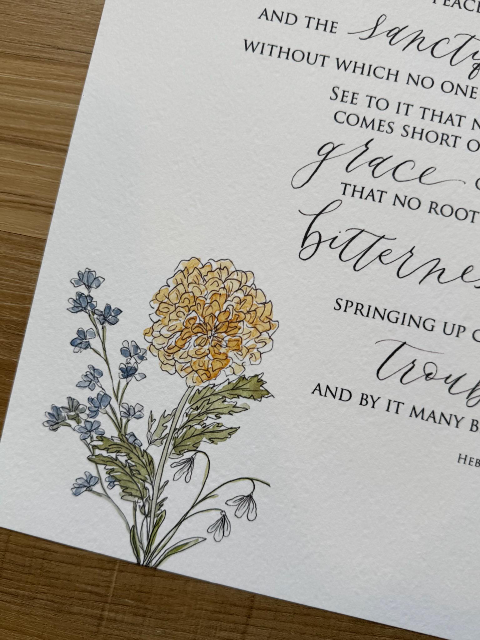 Hebrews 12:14-16 Scripture Print • Calligraphy, Floral Watercolor, Italian Paper
