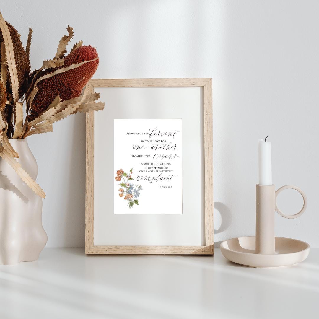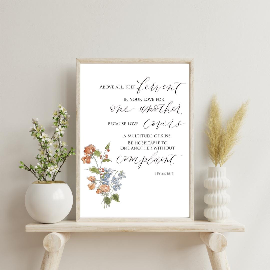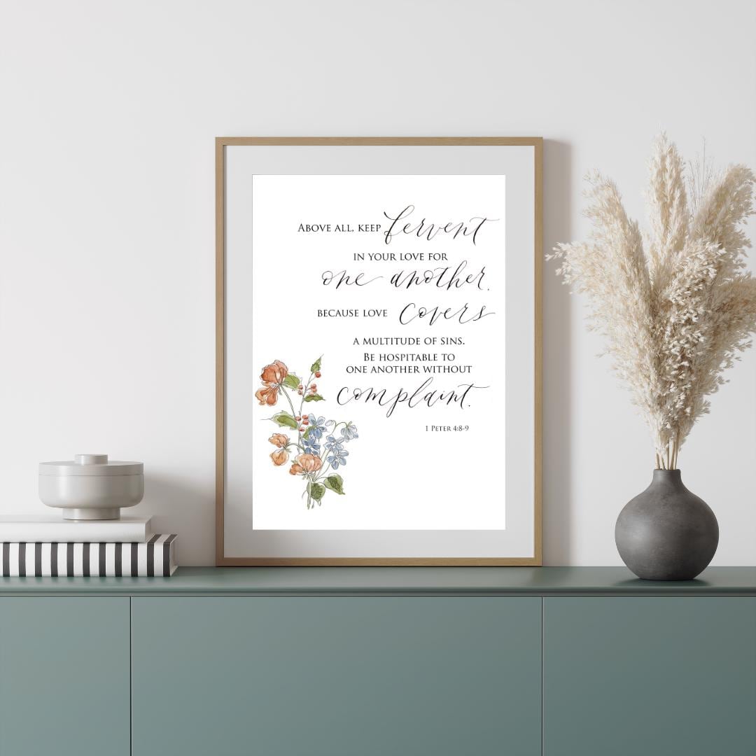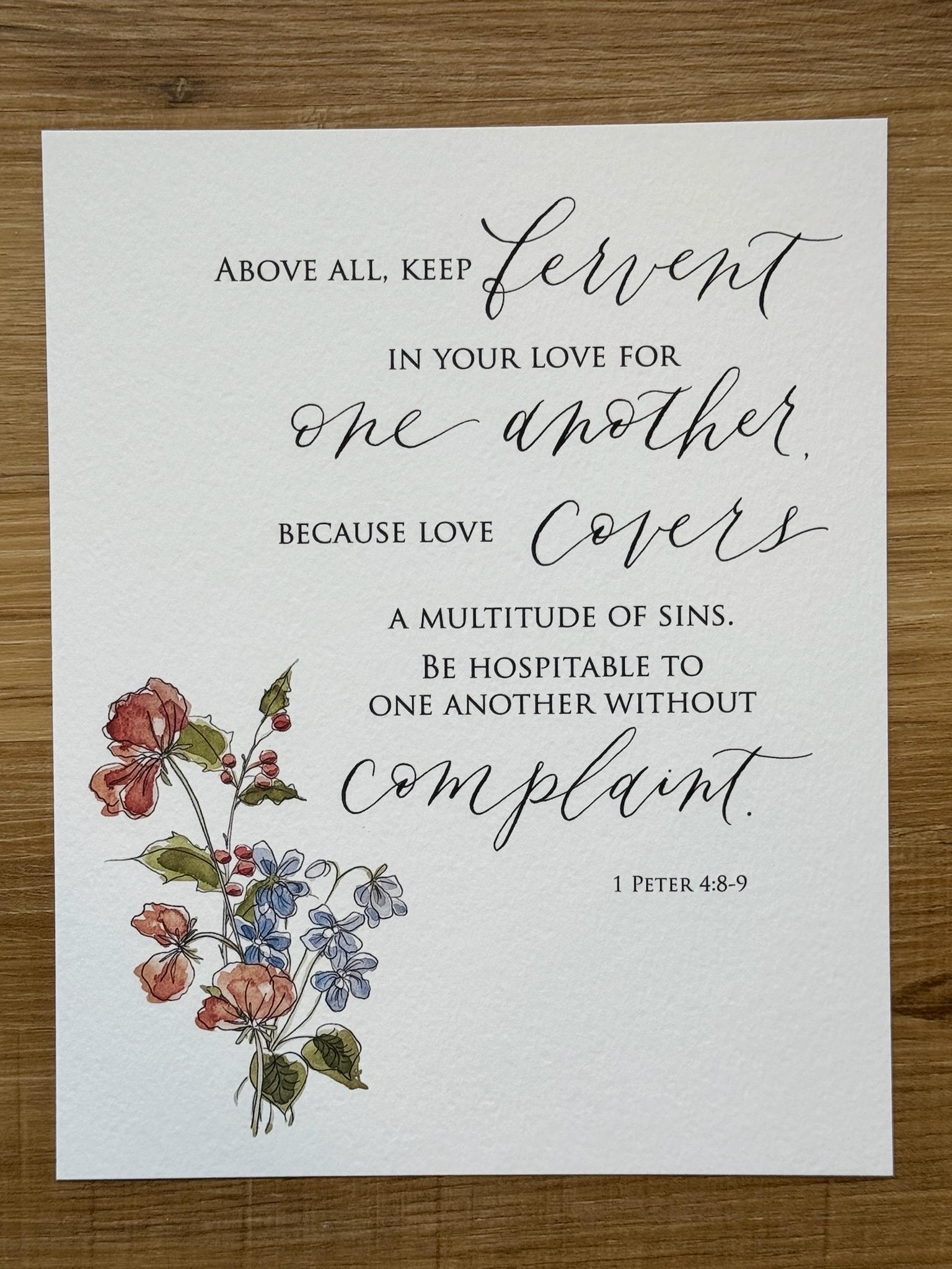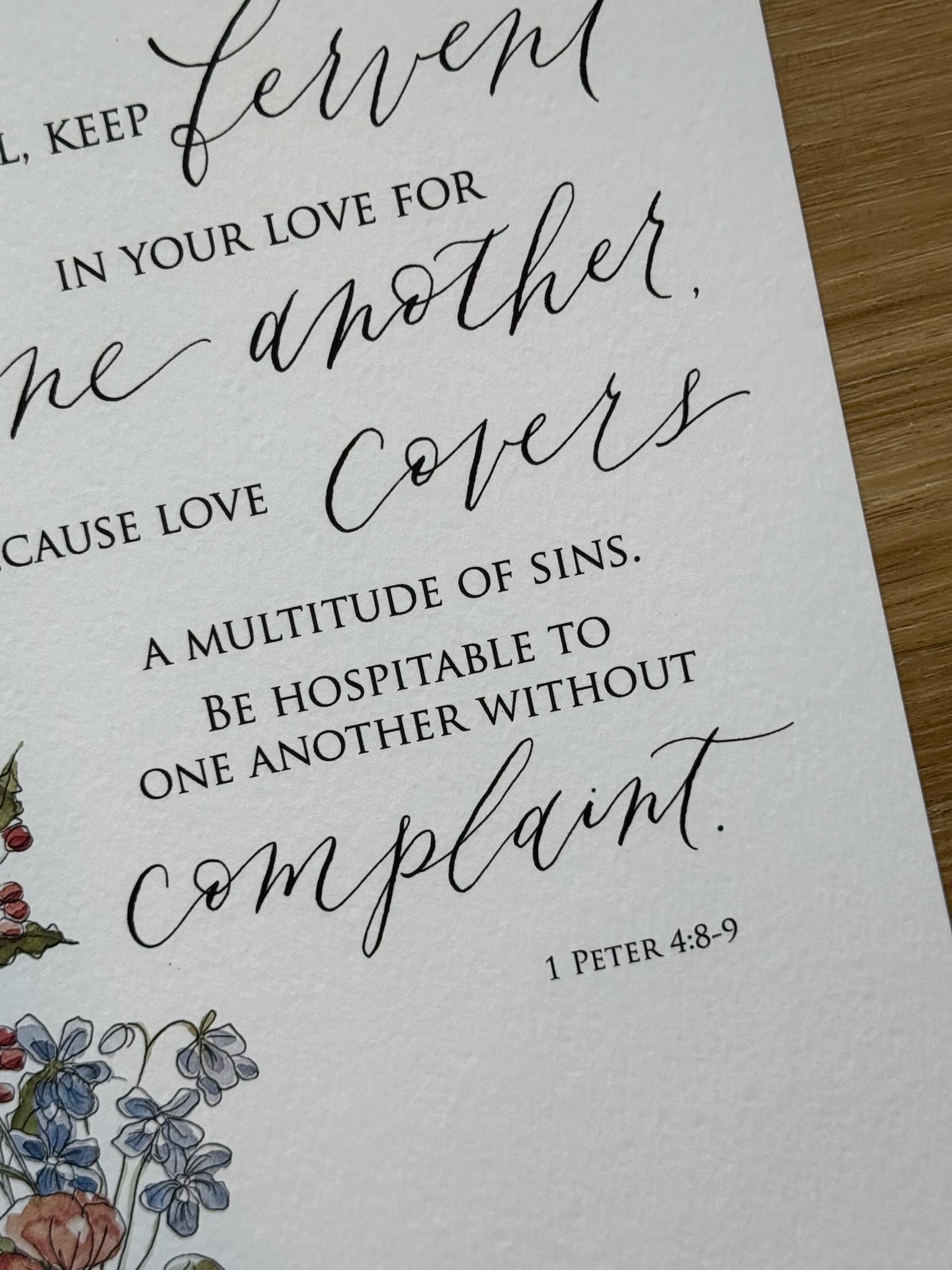 1 Peter 4:8-9 Scripture Print • Calligraphy, Floral Watercolor Art, Italian Paper